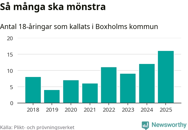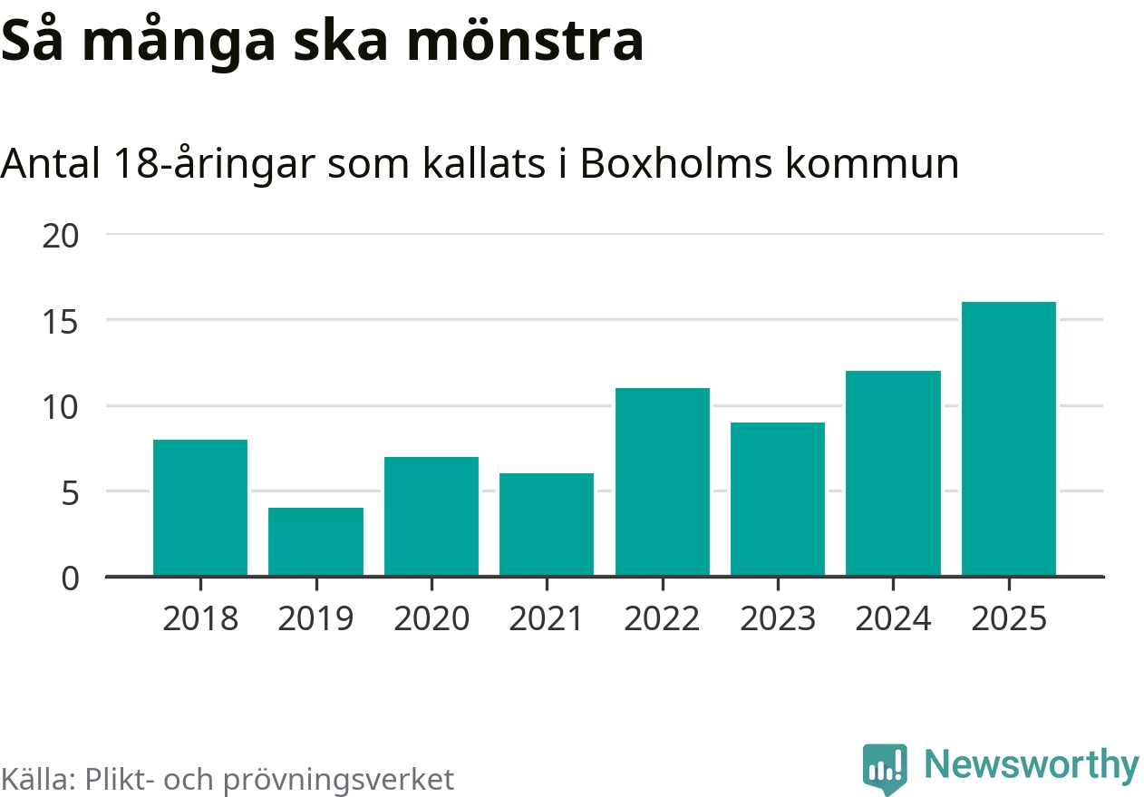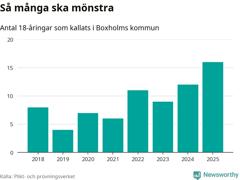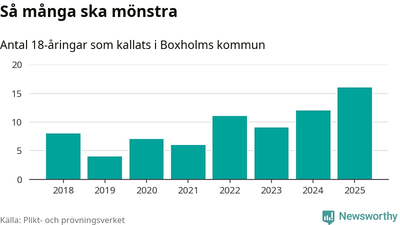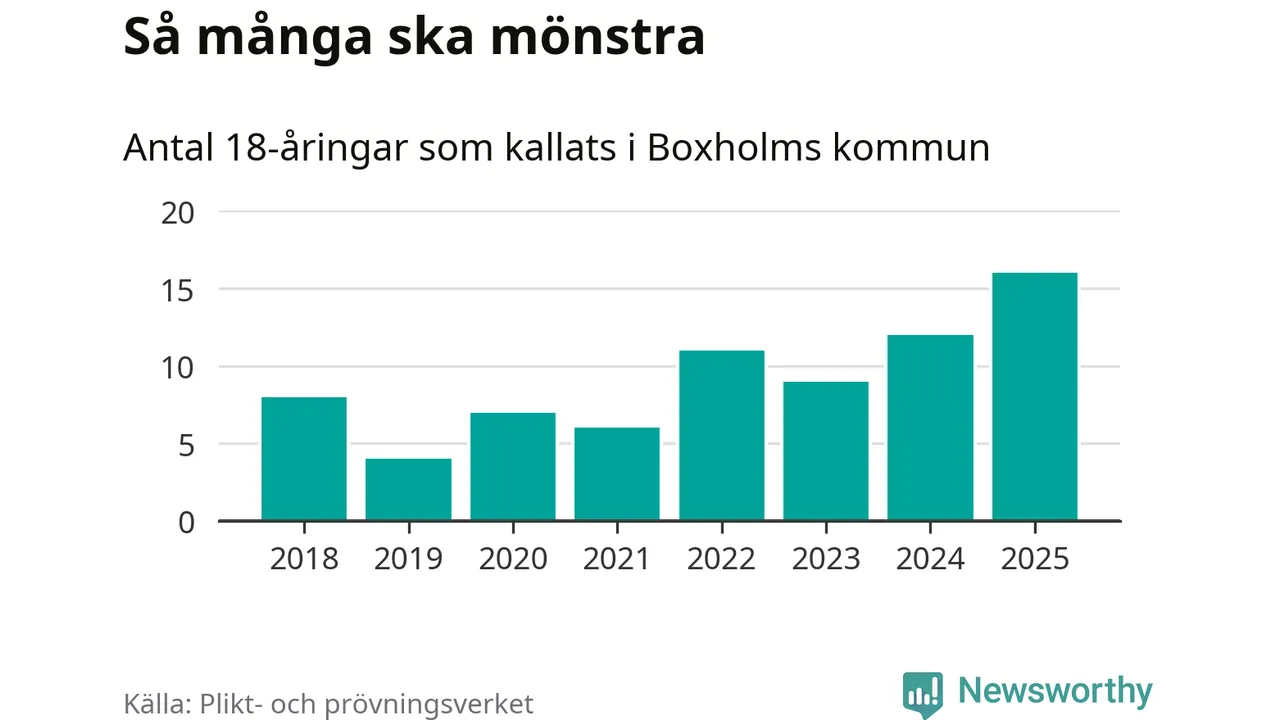 16 personer är det högsta antalet kallade i Boxholm sedan 2018, som är första året med statistik på kommunnivå (värnplikten återinfördes 2017), och fyra mönstrande fler än 2024. Totalt från Östergötlands län kallas 1 306 personer i år.