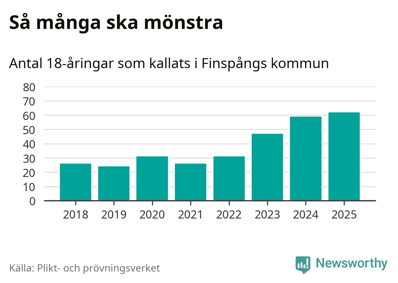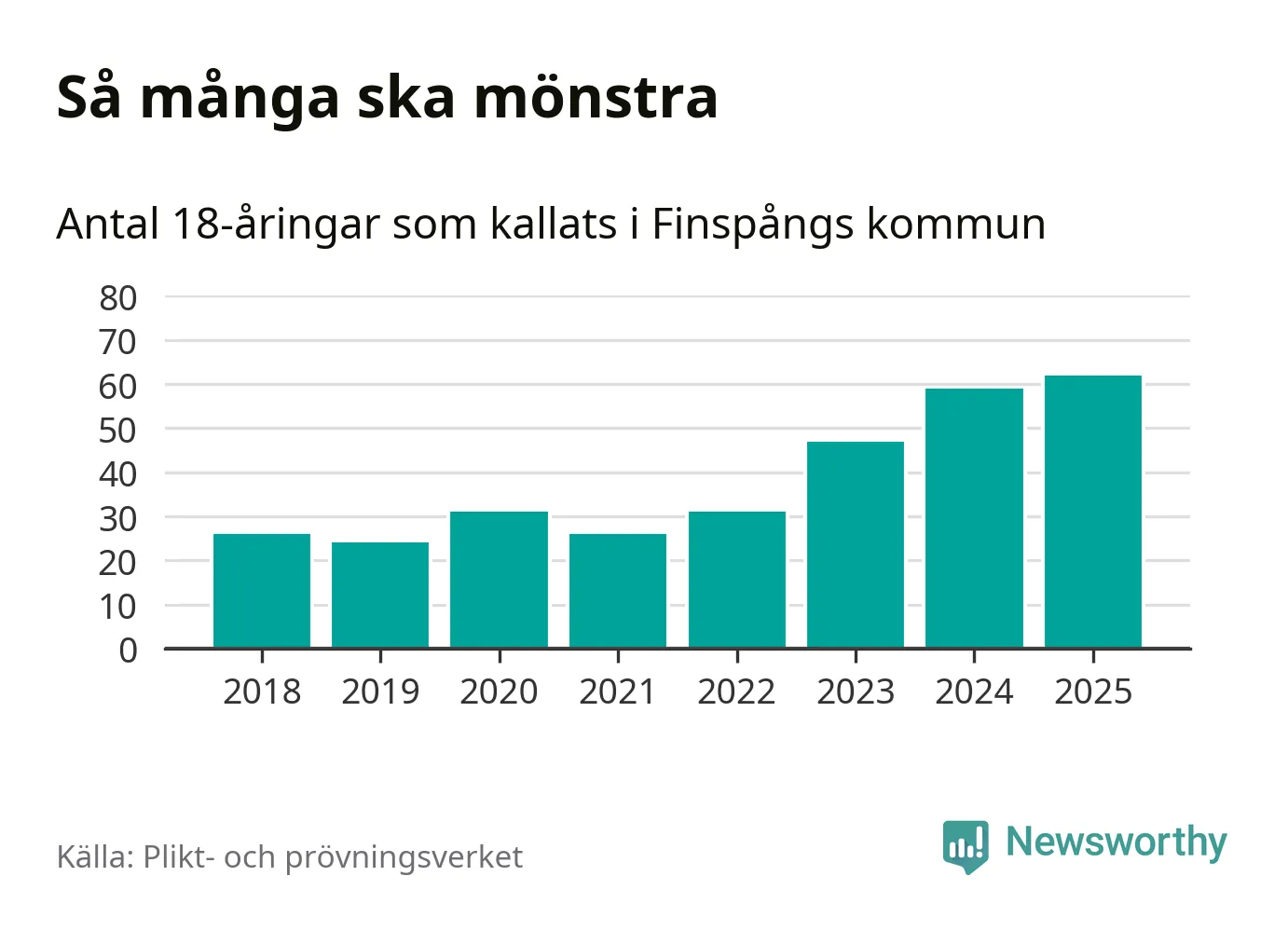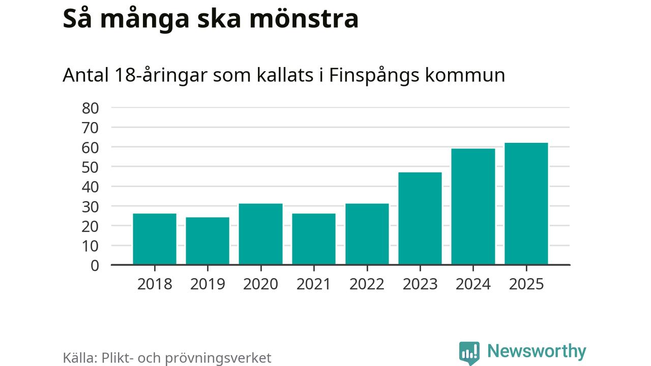 62 personer är det högsta antalet kallade i Finspång sedan 2018, som är första året med statistik på kommunnivå (värnplikten återinfördes 2017), och tre mönstrande fler än 2024. Totalt från Östergötlands län kallas 1 306 personer i år.