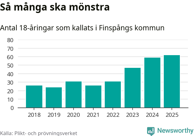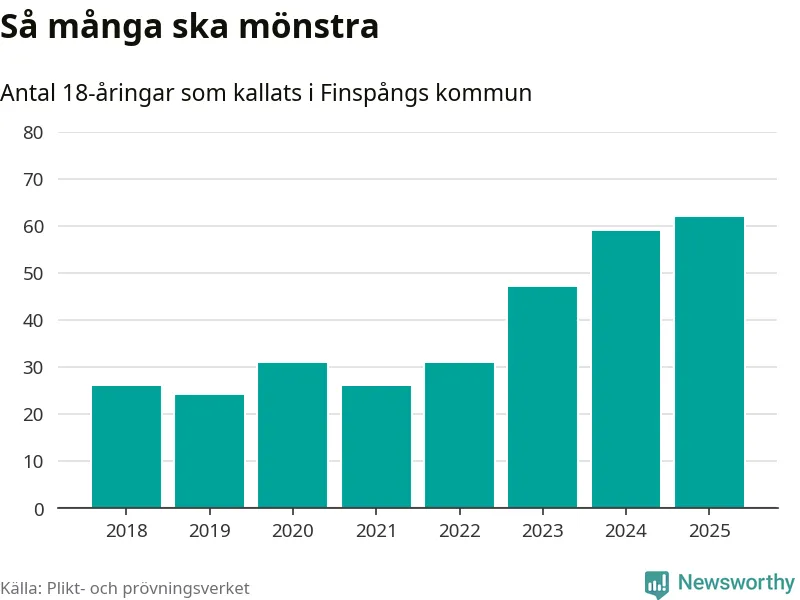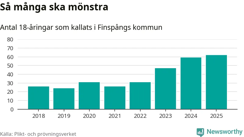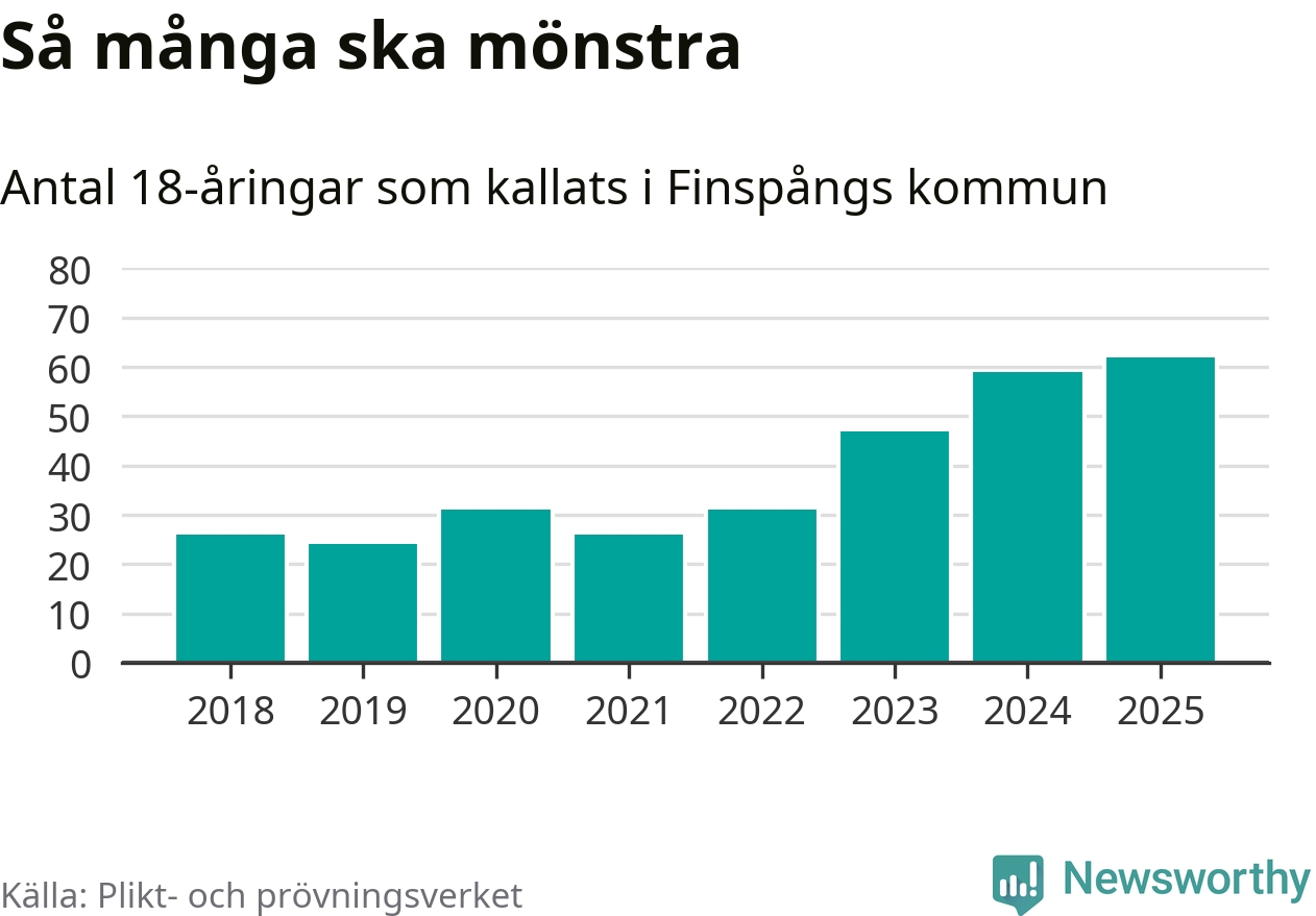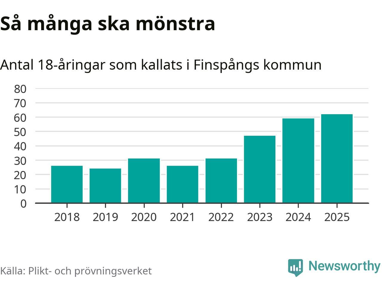 62 personer är det högsta antalet kallade i Finspång sedan 2018, som är första året med statistik på kommunnivå (värnplikten återinfördes 2017), och tre mönstrande fler än 2024. Totalt från Östergötlands län kallas 1 306 personer i år.