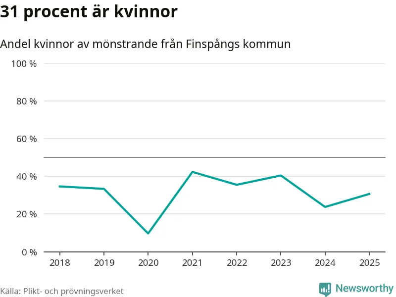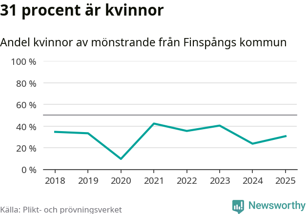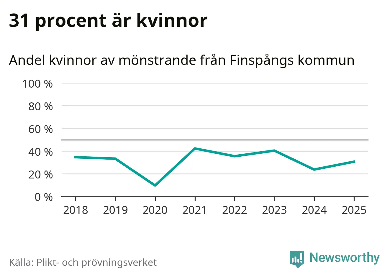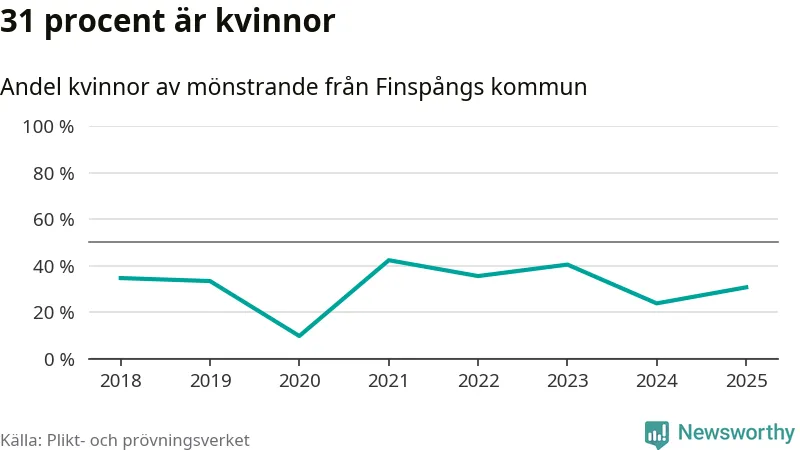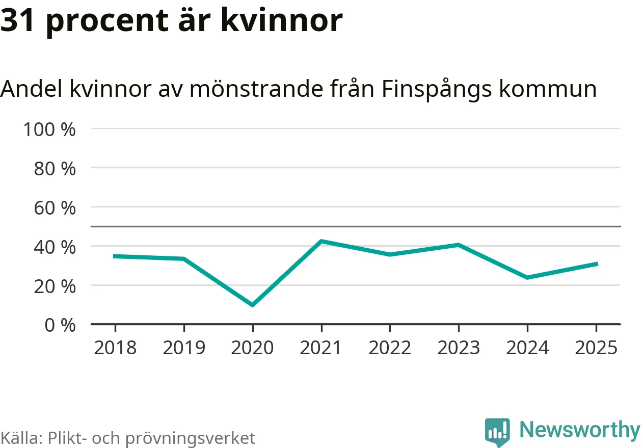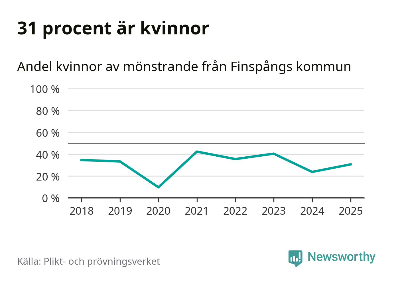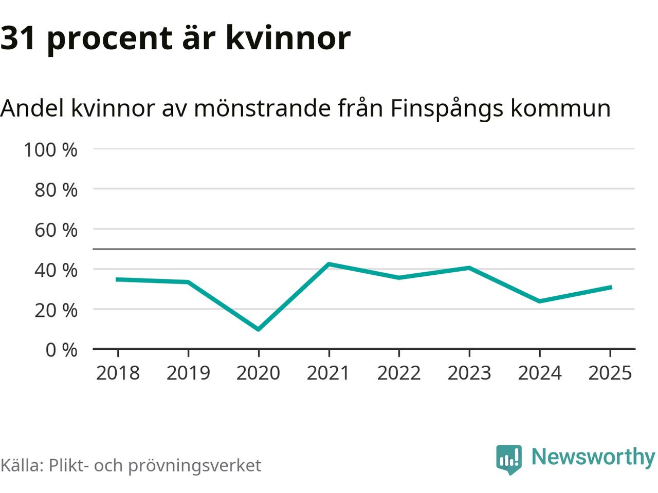 19 av de som kallats till mönstring från Finspång är kvinnor, vilket motsvarar 31 procent av de mönstrande. I absoluta tal är det fler kvinnor än något år sedan värnplikten återinfördes, men 2021 var en större andel av de mönstrande från kommunen kvinnor (42 procent). I riket som helhet är 28 procent av de mönstrande tjejer.