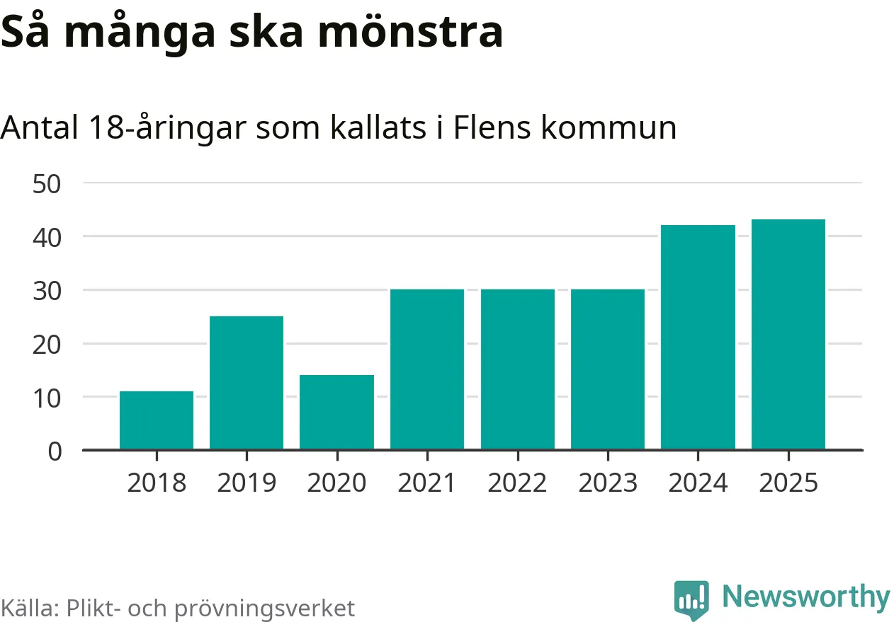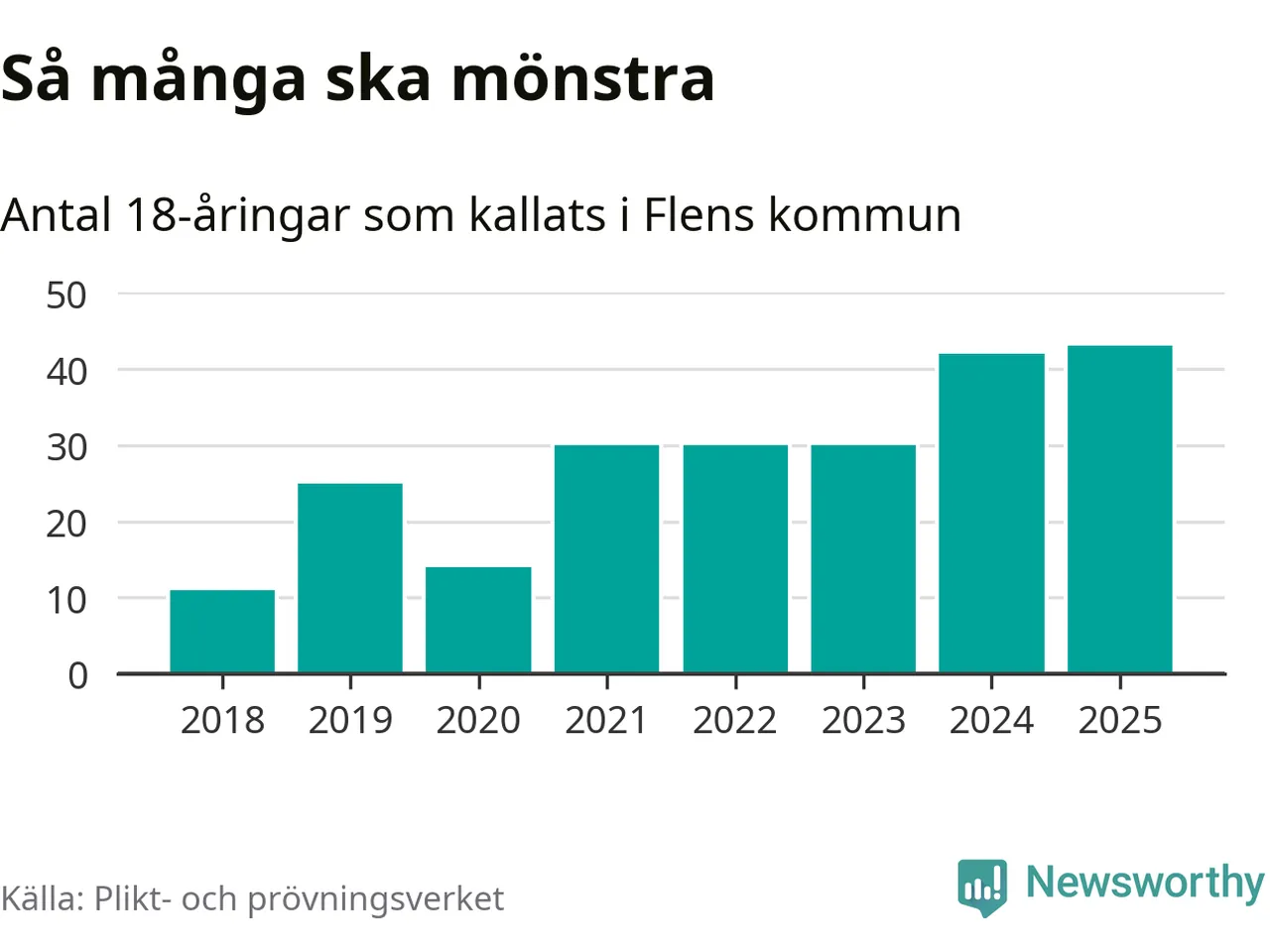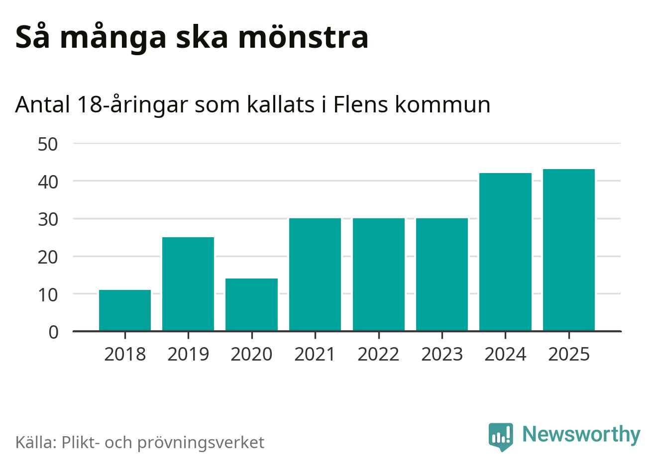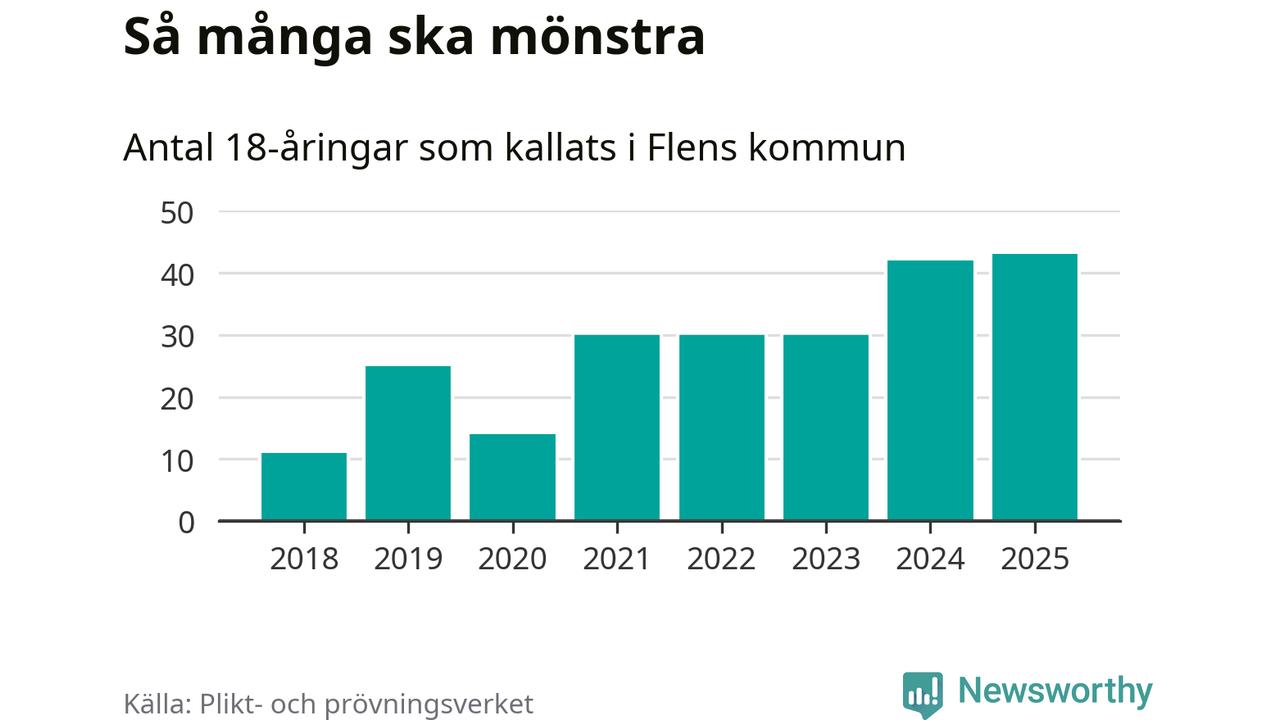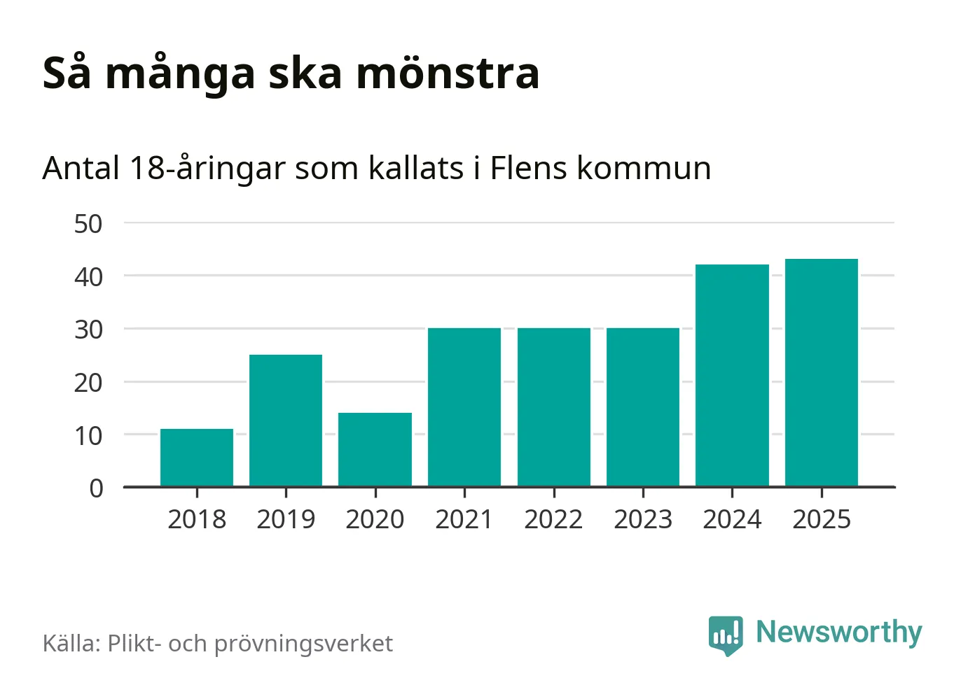 43 personer är det högsta antalet kallade i Flen sedan 2018, som är första året med statistik på kommunnivå (värnplikten återinfördes 2017), och en mönstrande fler än 2024. Totalt från Södermanlands län kallas 802 personer i år.