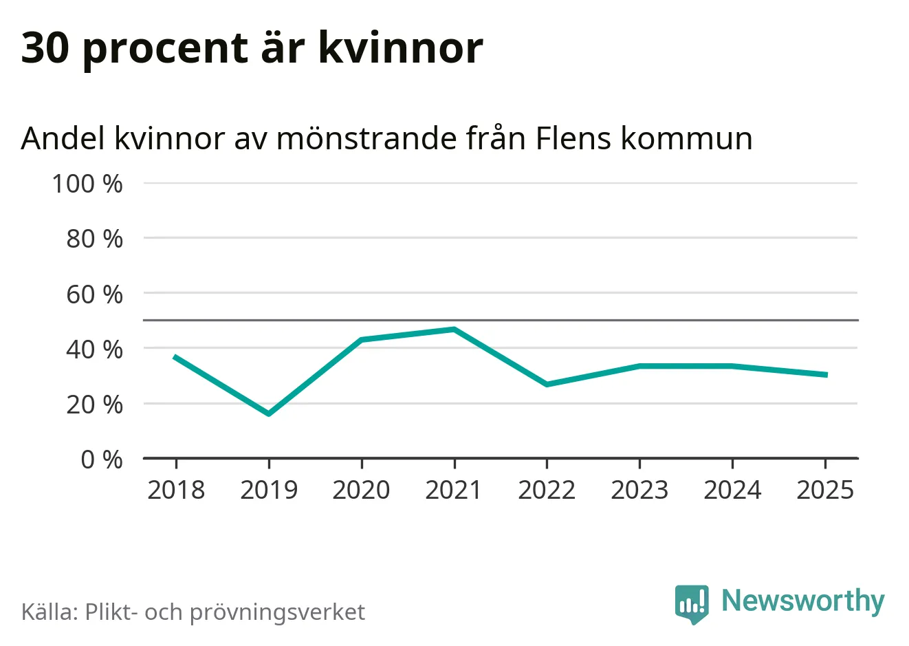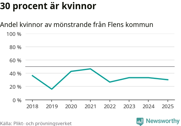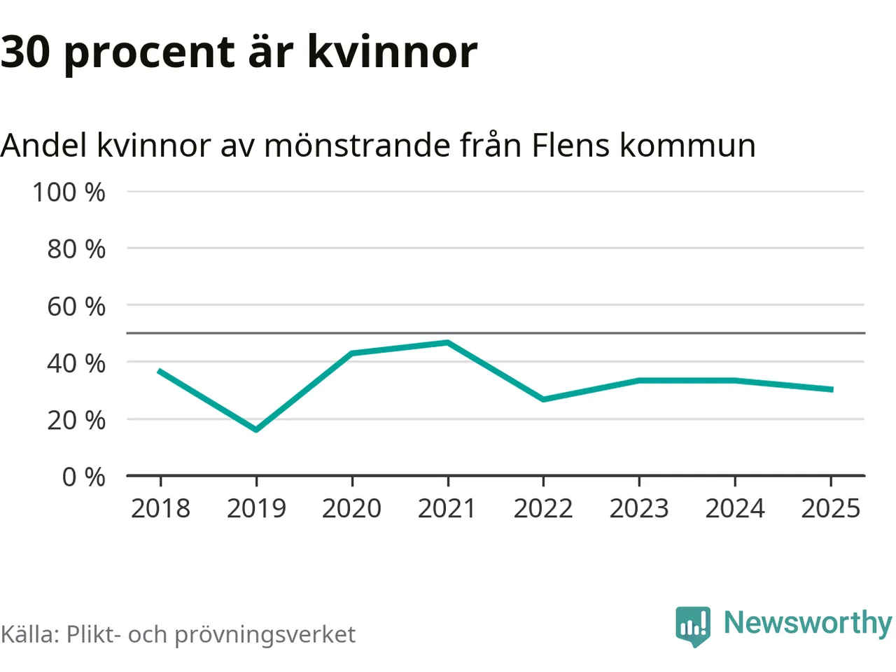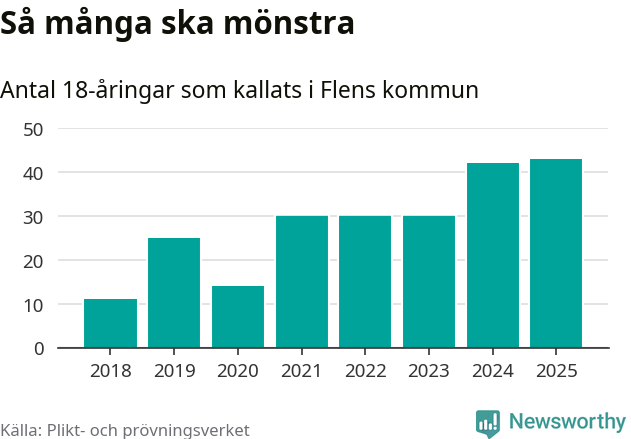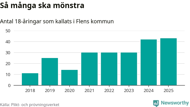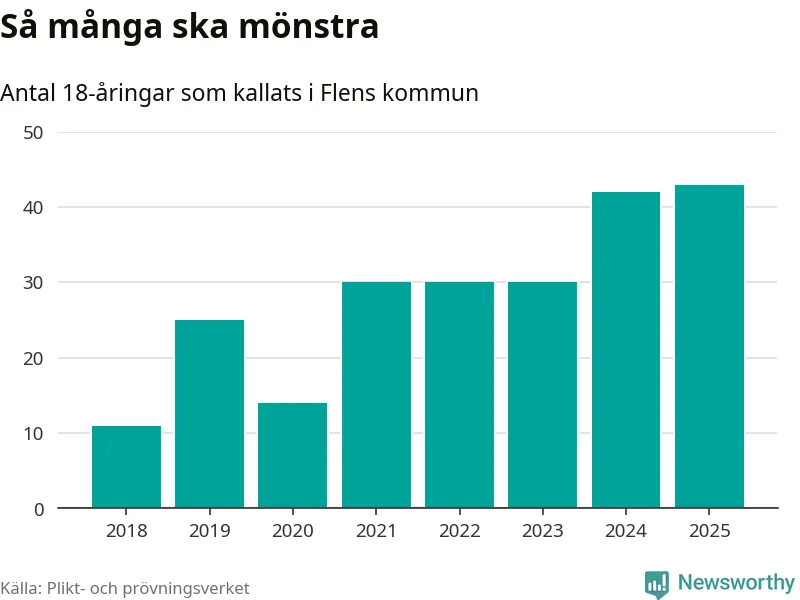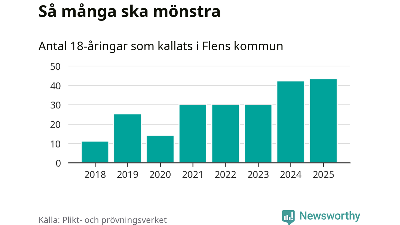 43 personer är det högsta antalet kallade i Flen sedan 2018, som är första året med statistik på kommunnivå (värnplikten återinfördes 2017), och en mönstrande fler än 2024. Totalt från Södermanlands län kallas 802 personer i år.