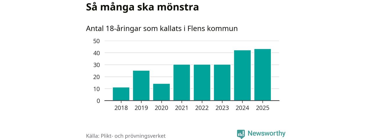 Nu kallas omkring 28 200 svenskar födda 2007 till mönstring. Och 43 av dem kommer från Flen, enligt ny statistik från Plikt- och prövningsverket. Det innebär att nästan var fjärde invånare i åldersgruppen i kommunen kallas till mönstring. Det är en högre andel än i Södermanland totalt. Även i riket som helhet kallas nästan var fjärde person i årskullen.