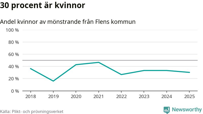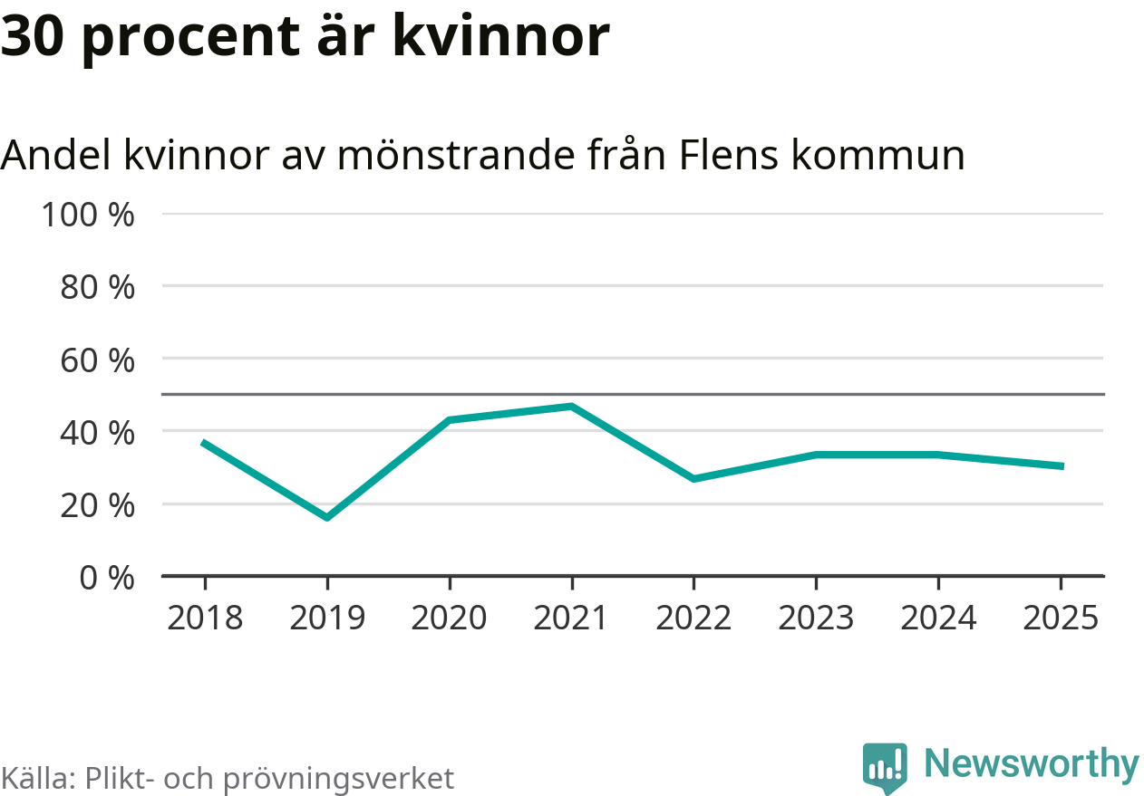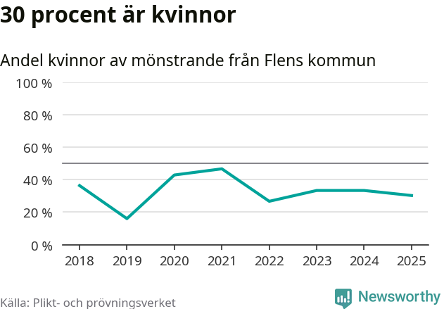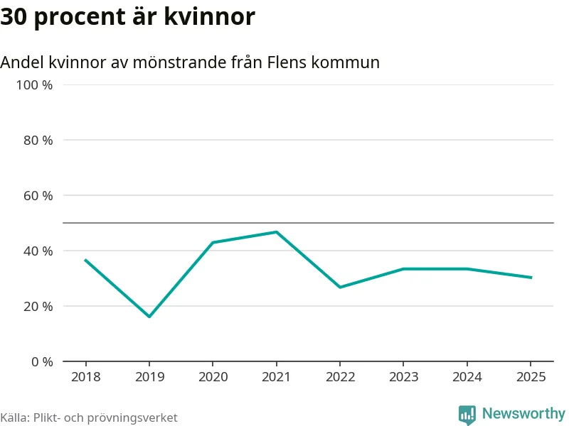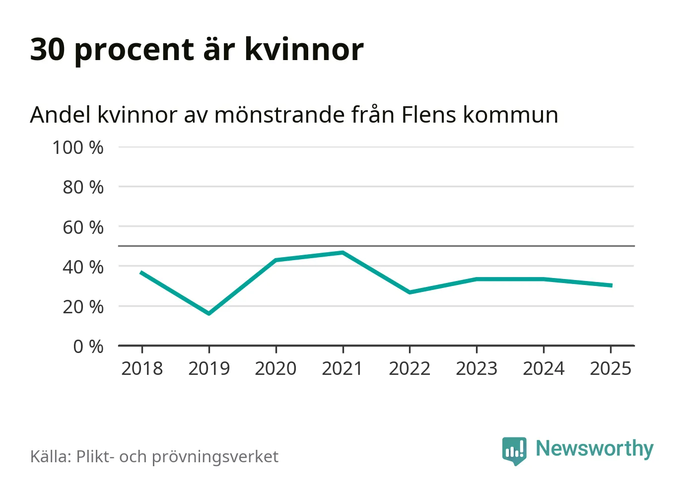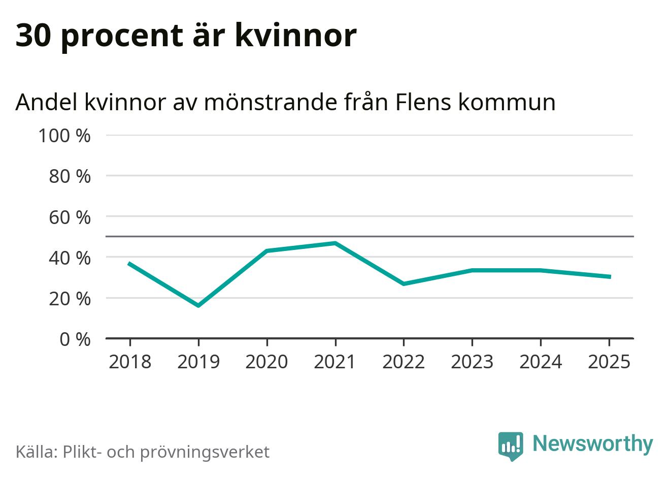 13 av de som kallats till mönstring från Flen är kvinnor, vilket motsvarar 30 procent av de mönstrande. Som mest har 14 kvinnor kallats från kommunen (2024 och 2021). I riket som helhet är 28 procent av de mönstrande tjejer.