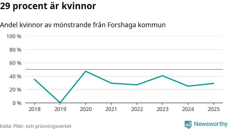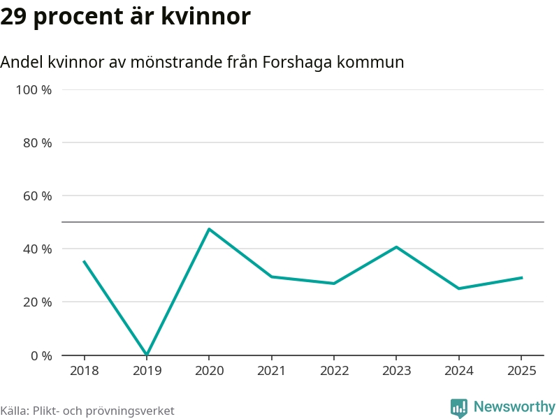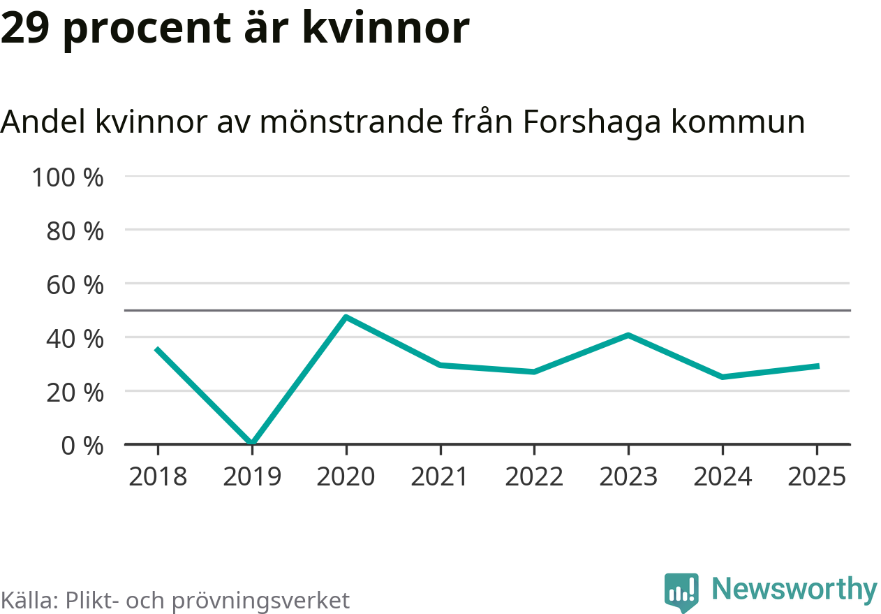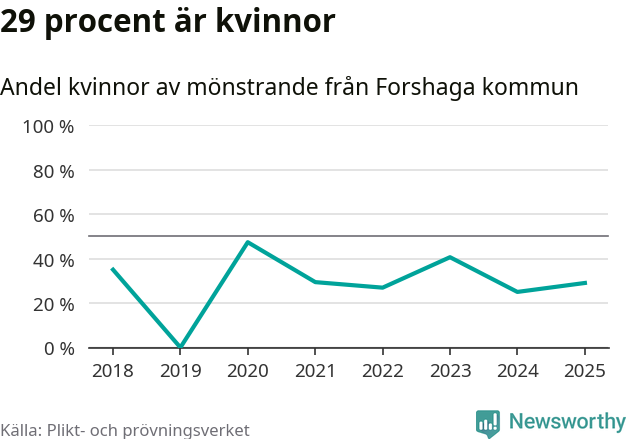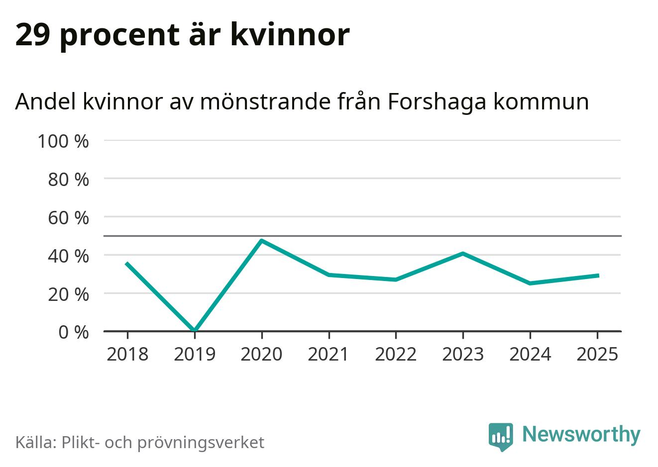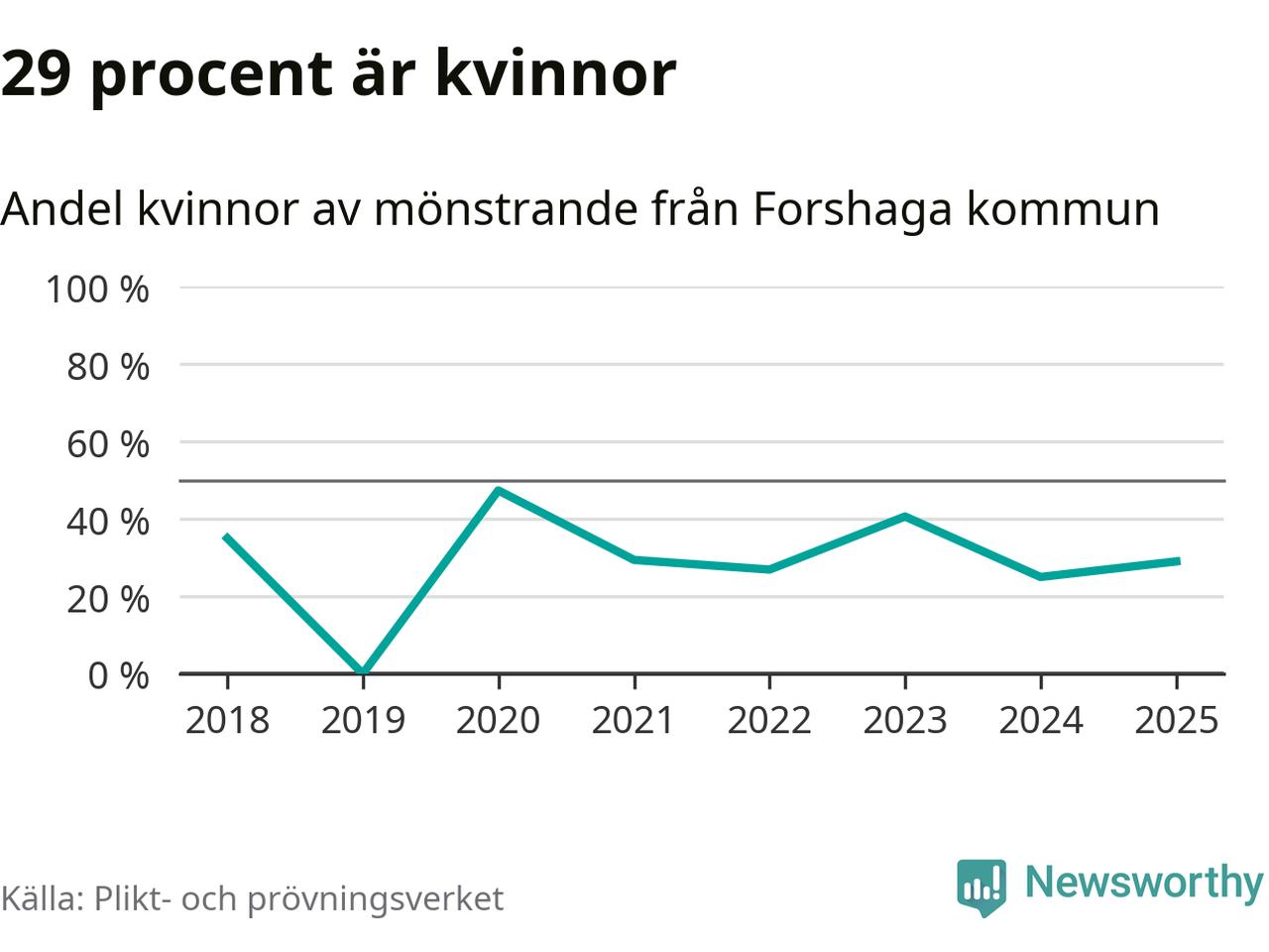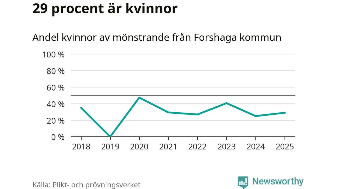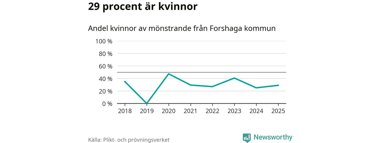 Nio av de som kallats till mönstring från Forshaga är kvinnor, vilket motsvarar 29 procent av de mönstrande. Som mest har 13 kvinnor kallats från kommunen (2023). I riket som helhet är 28 procent av de mönstrande tjejer.