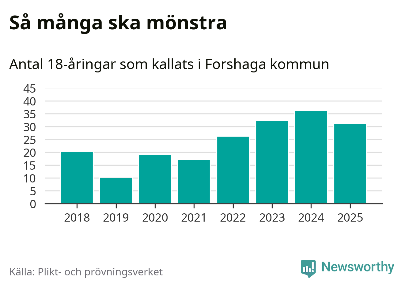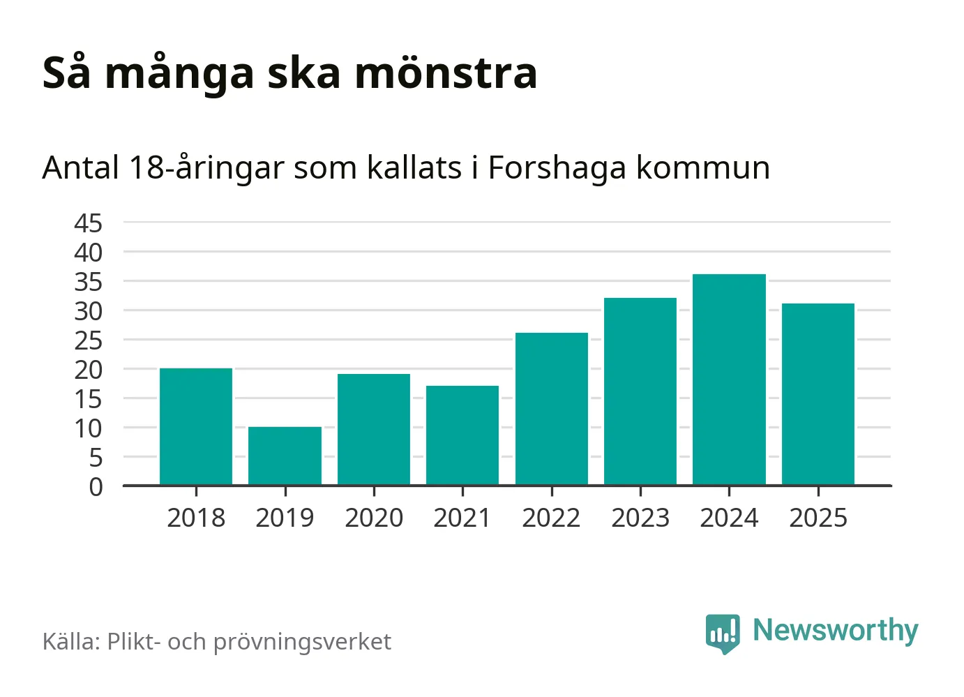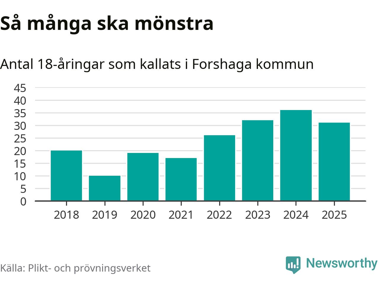 Av de som skrivits in till någon av Försvarmaktens grundutbildningar det senaste året, från juni 2024 till mars i år, kommer tolv (åtta män och fyra kvinnor) från Forshaga. Elva av dessa antogs efter att ha kallats till mönstring.