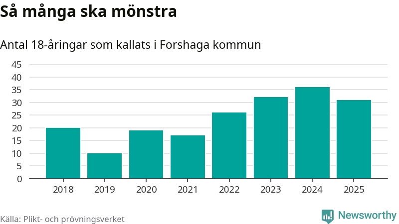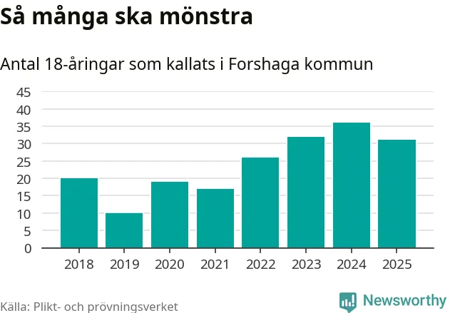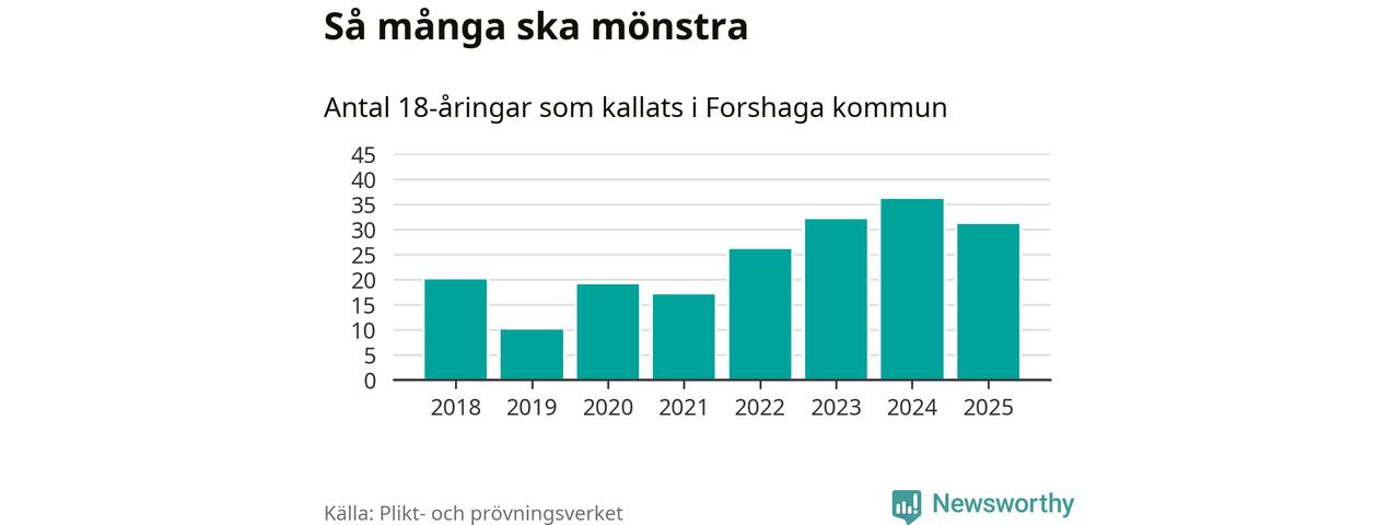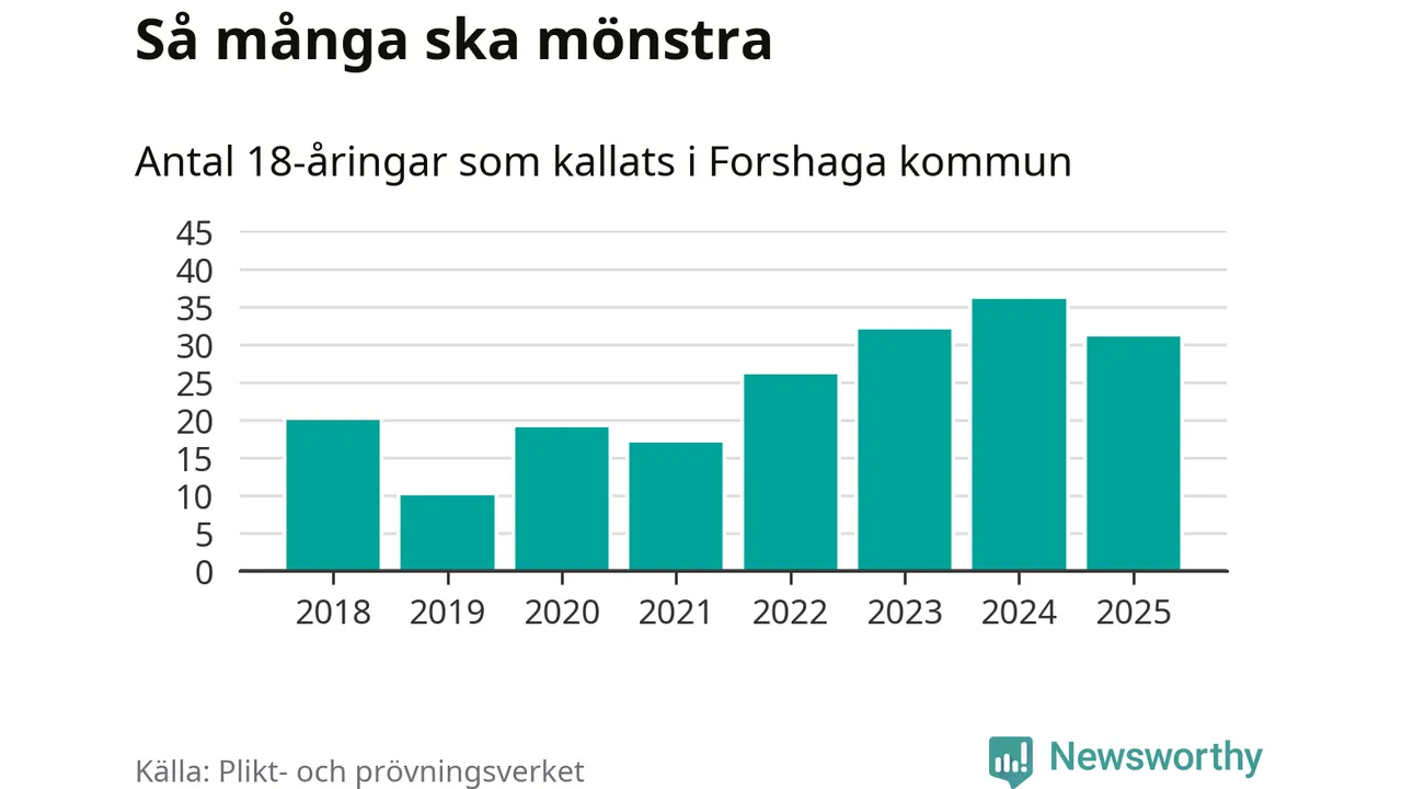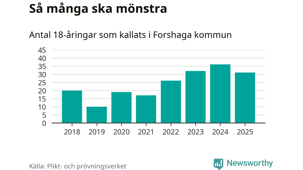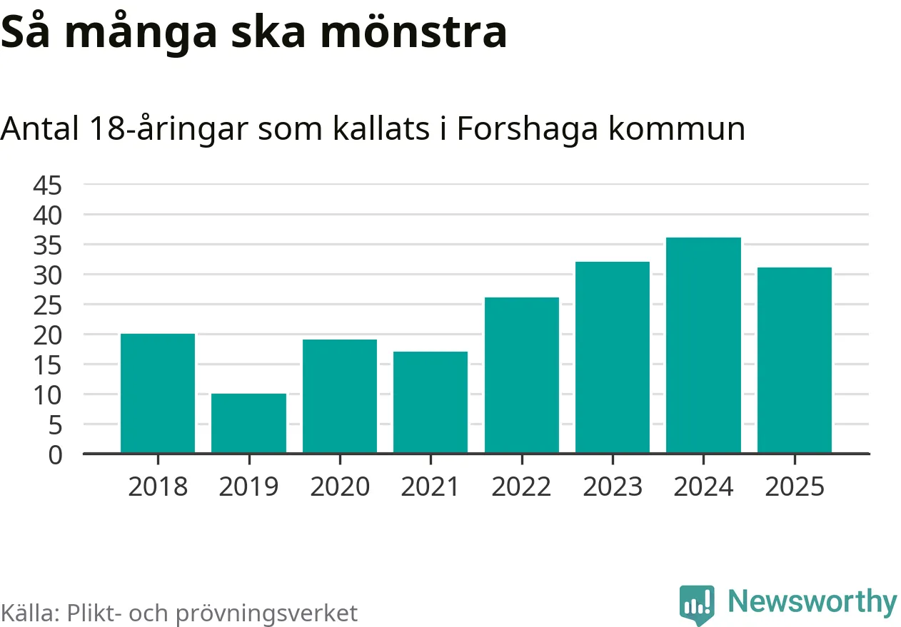 Av de som skrivits in till någon av Försvarmaktens grundutbildningar det senaste året, från juni 2024 till mars i år, kommer tolv (åtta män och fyra kvinnor) från Forshaga. Elva av dessa antogs efter att ha kallats till mönstring.
