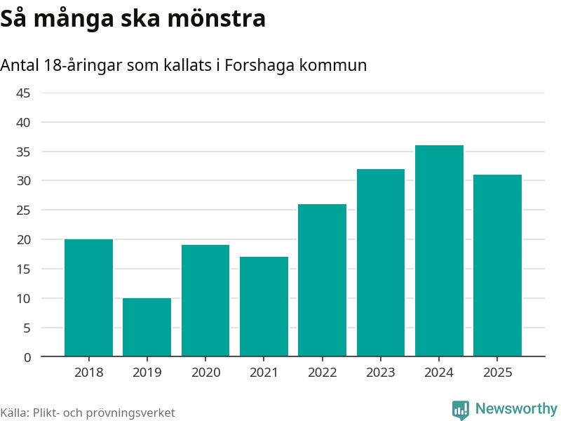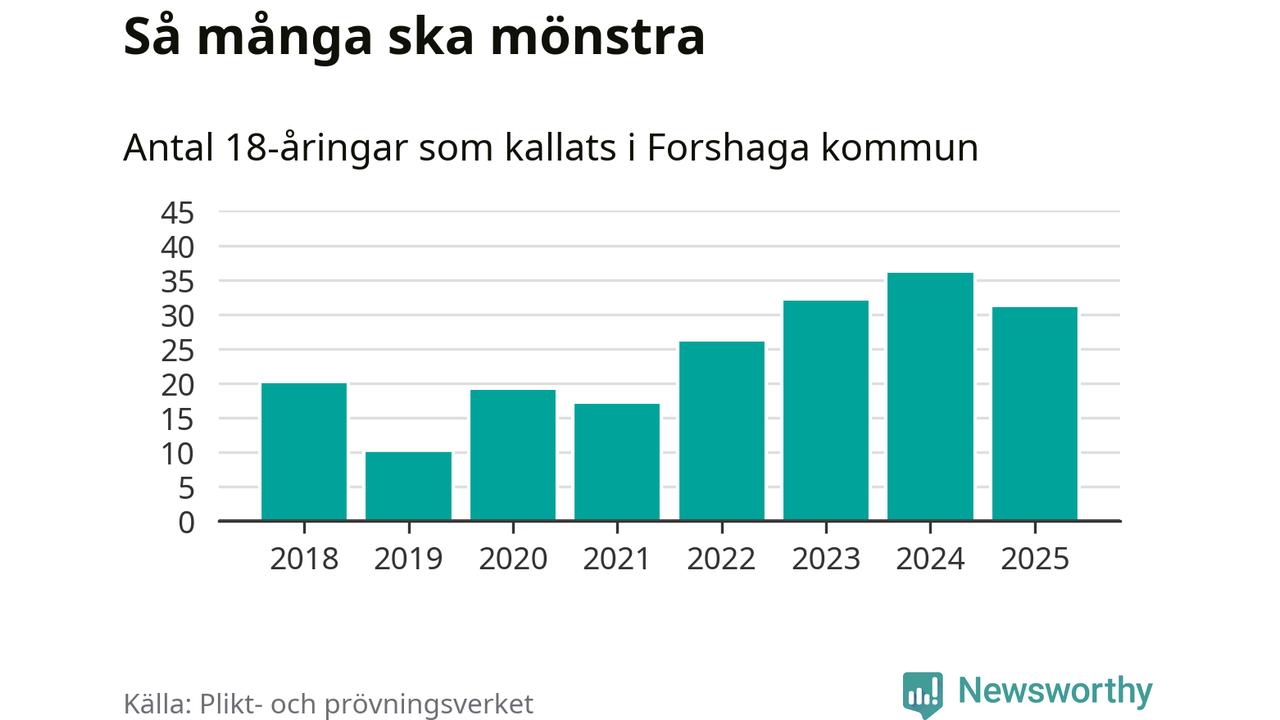 Nu kallas omkring 28 200 svenskar födda 2007 till mönstring. Och 31 av dem kommer från Forshaga, enligt ny statistik från Plikt- och prövningsverket. Det innebär att var femte invånare i åldersgruppen i kommunen kallas till mönstring. Det är ungefär lika stor andel som i Värmland totalt. I riket som helhet kallas nästan var fjärde person i årskullen.