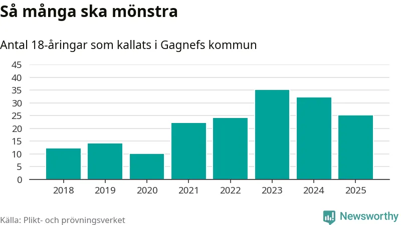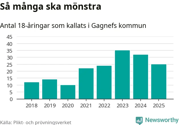 25 personer är sju färre än 2024. Som mest har 35 personer från en årskull kommunen mönstrat (2023). Totalt från Dalarnas län kallas 693 personer i år.