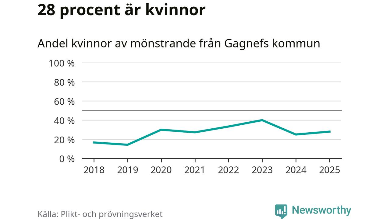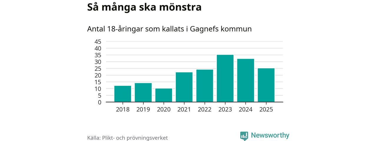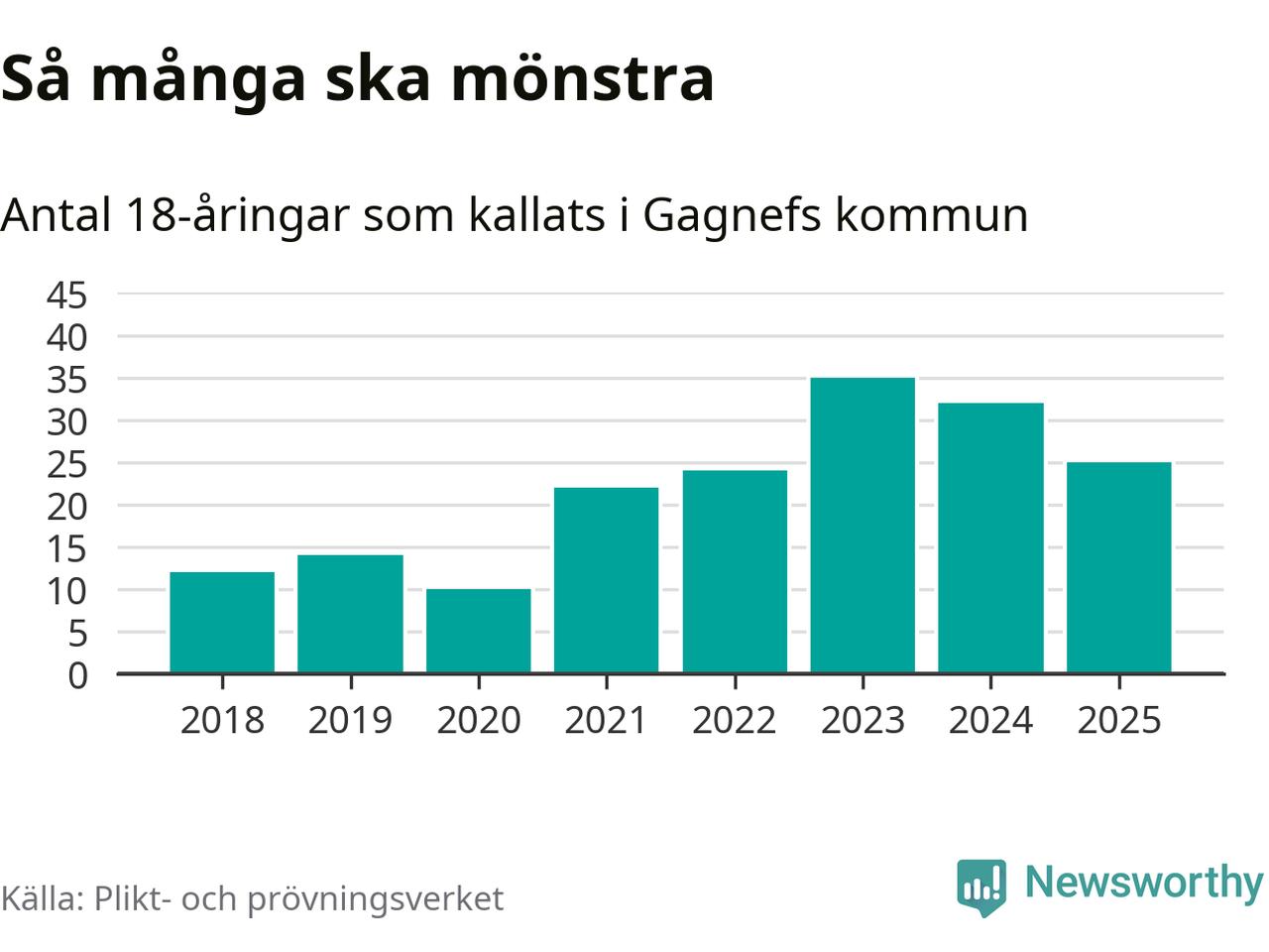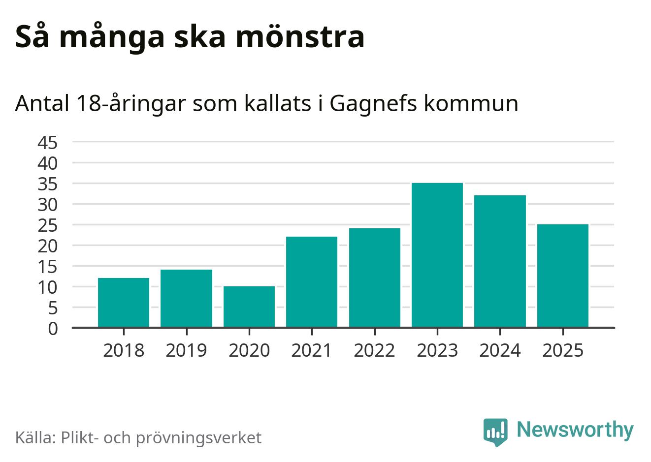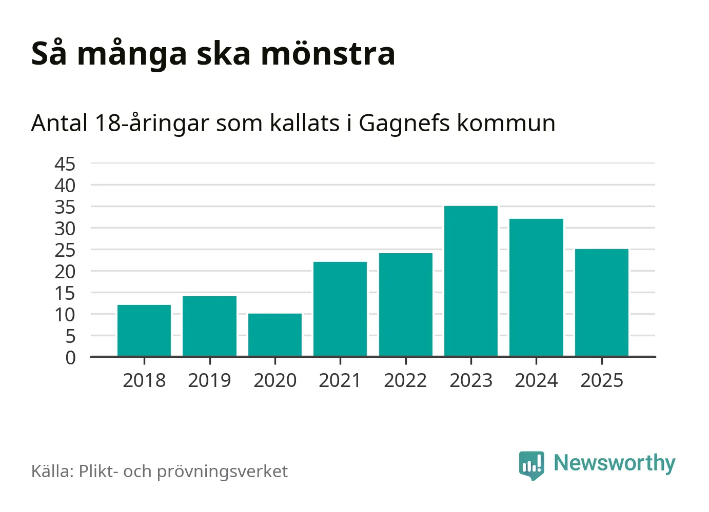 Av de som skrivits in till någon av Försvarmaktens grundutbildningar det senaste året, från juni 2024 till mars i år, kommer 13 (elva män och två kvinnor) från Gagnef. Tolv av dessa antogs efter att ha kallats till mönstring.