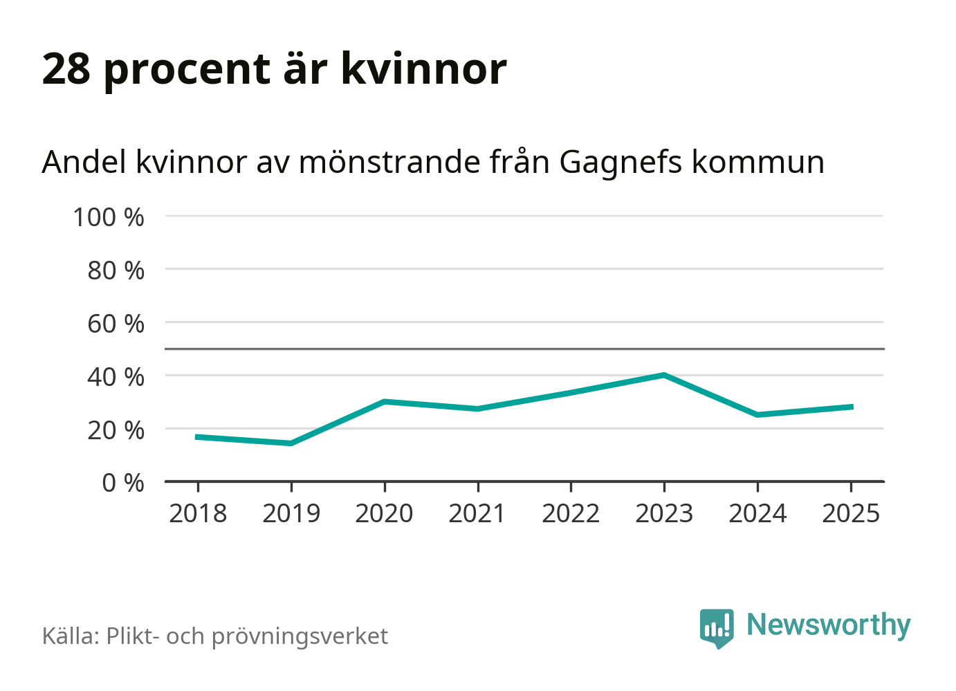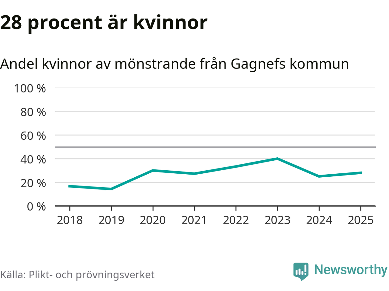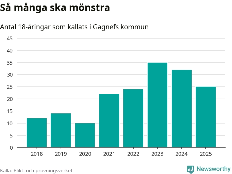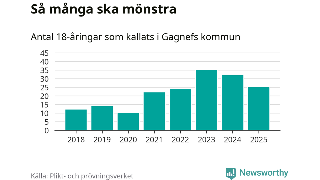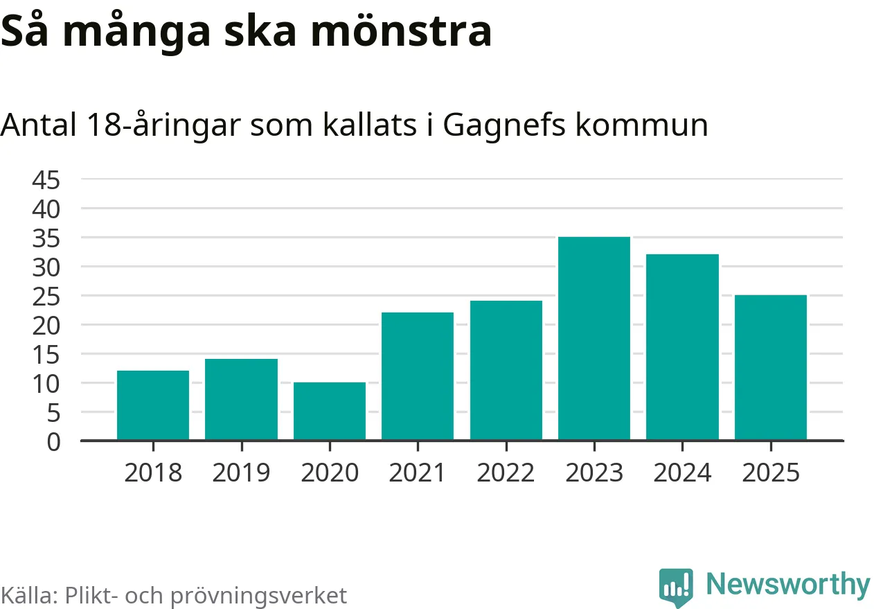 Av de som skrivits in till någon av Försvarmaktens grundutbildningar det senaste året, från juni 2024 till mars i år, kommer 13 (elva män och två kvinnor) från Gagnef. Tolv av dessa antogs efter att ha kallats till mönstring.