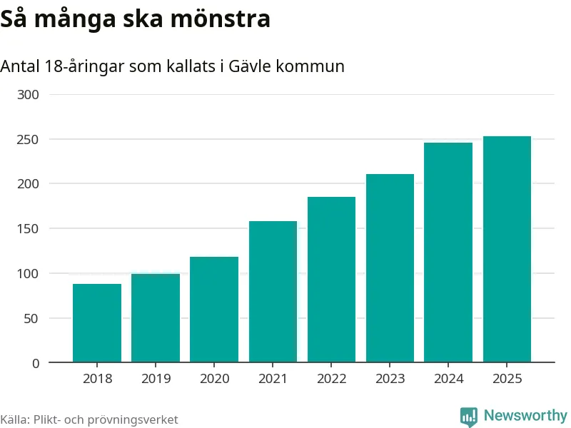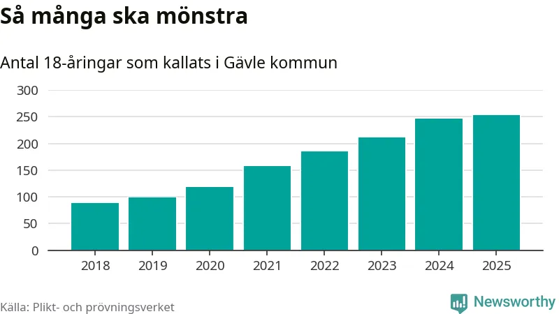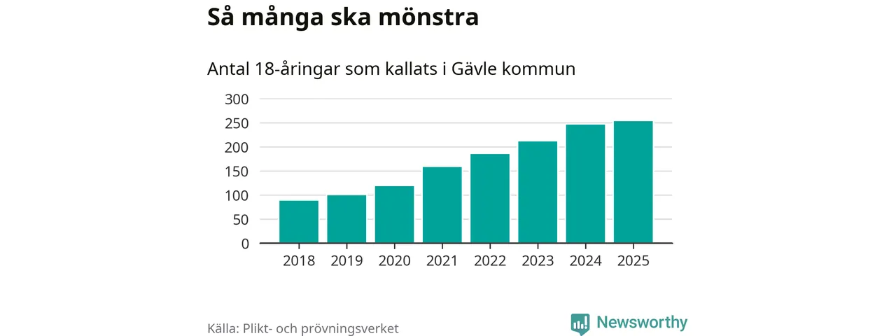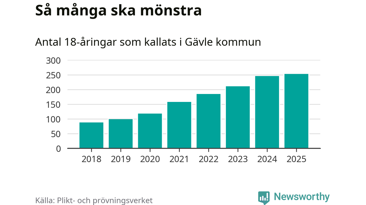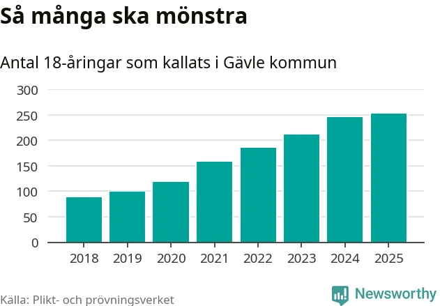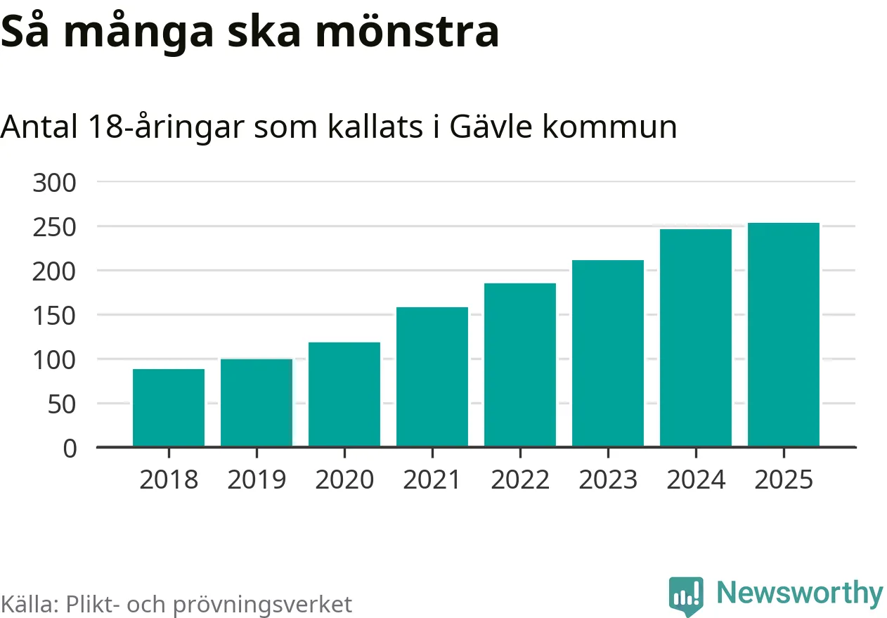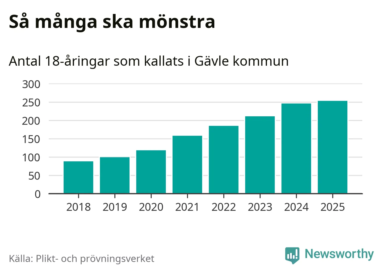 Antalet kallade i Gävle har ökat varje år sedan 2018, som är första året med statistik på kommunnivå (värnplikten återinfördes 2017), och jämfört med 2024 är det sju fler i år. Totalt från Gävleborgs län kallas 710 personer i år.