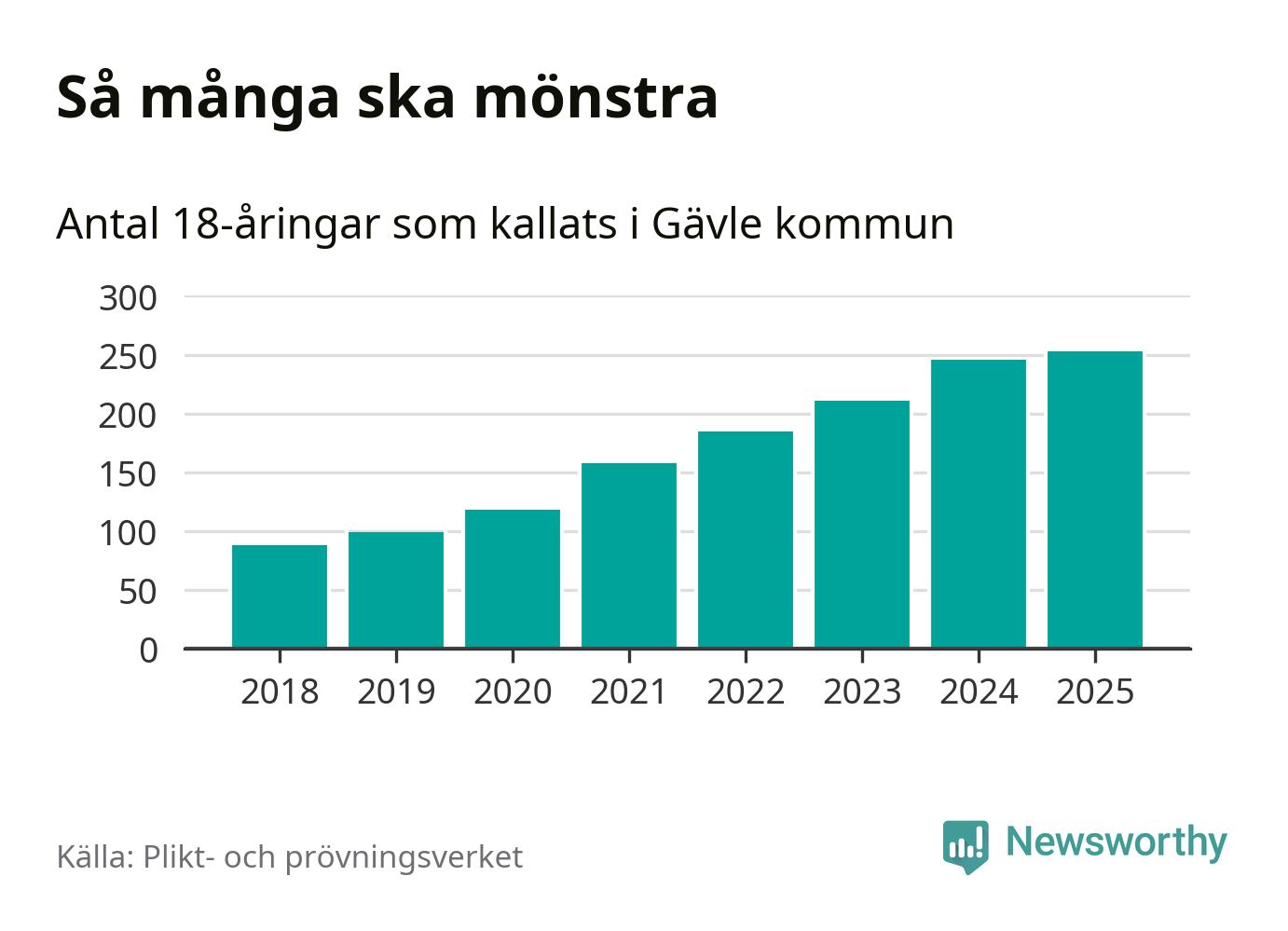 Nu kallas omkring 28 200 svenskar födda 2007 till mönstring. Och 253 av dem kommer från Gävle, enligt ny statistik från Plikt- och prövningsverket. Det innebär att var femte invånare i åldersgruppen i kommunen kallas till mönstring. Det är ungefär lika stor andel som i Gävleborg totalt. I riket som helhet kallas nästan var fjärde person i årskullen.