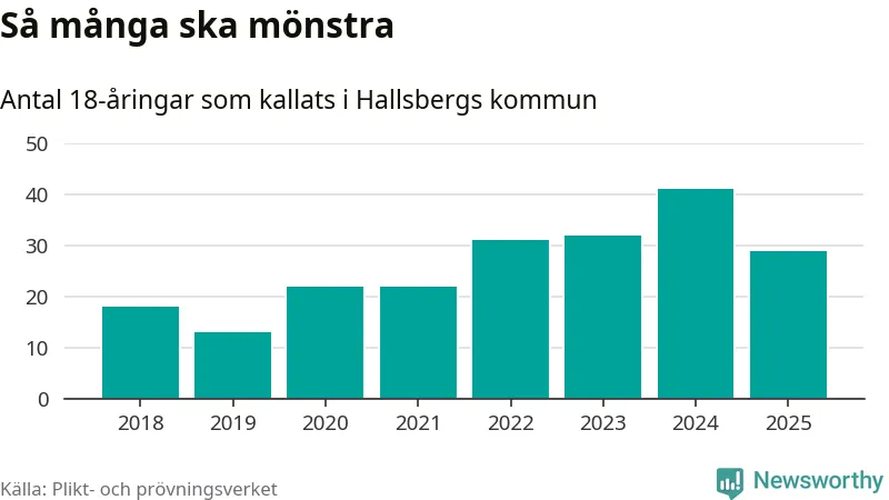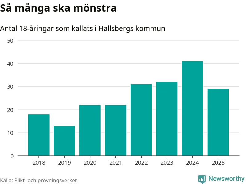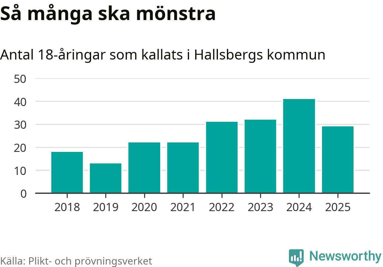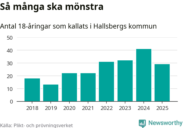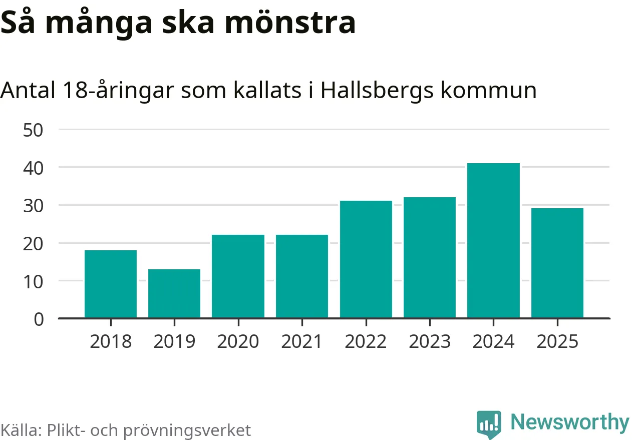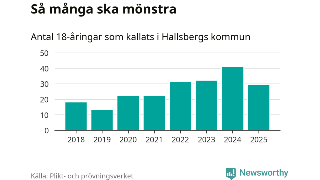 Nu kallas omkring 28 200 svenskar födda 2007 till mönstring. Och 29 av dem kommer från Hallsberg, enligt ny statistik från Plikt- och prövningsverket. Det innebär att var sjunde invånare i åldersgruppen i kommunen kallas till mönstring. Det är en lägre andel än i Örebro län totalt. I riket som helhet kallas nästan var fjärde person i årskullen.