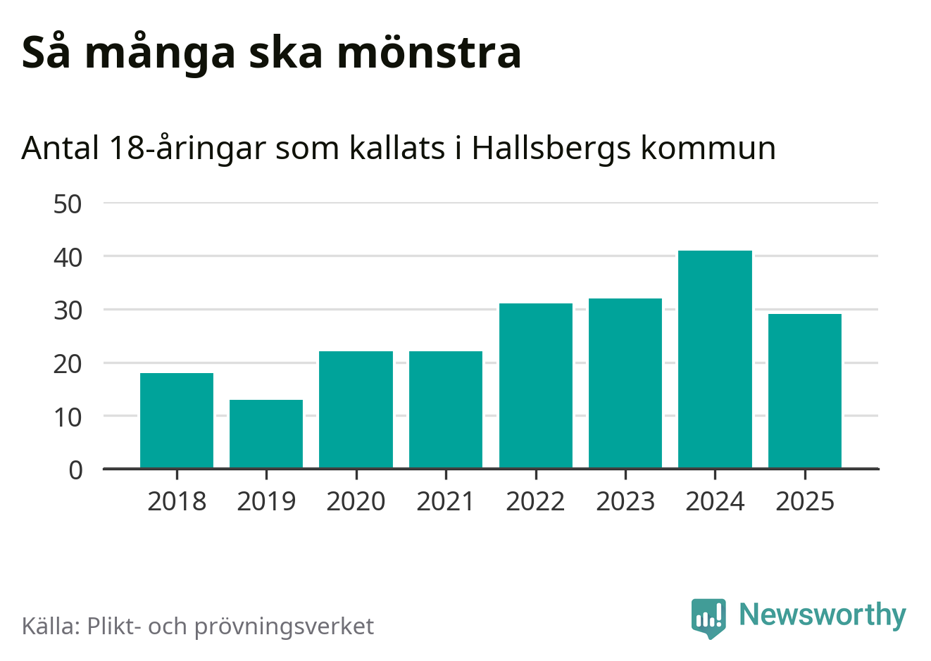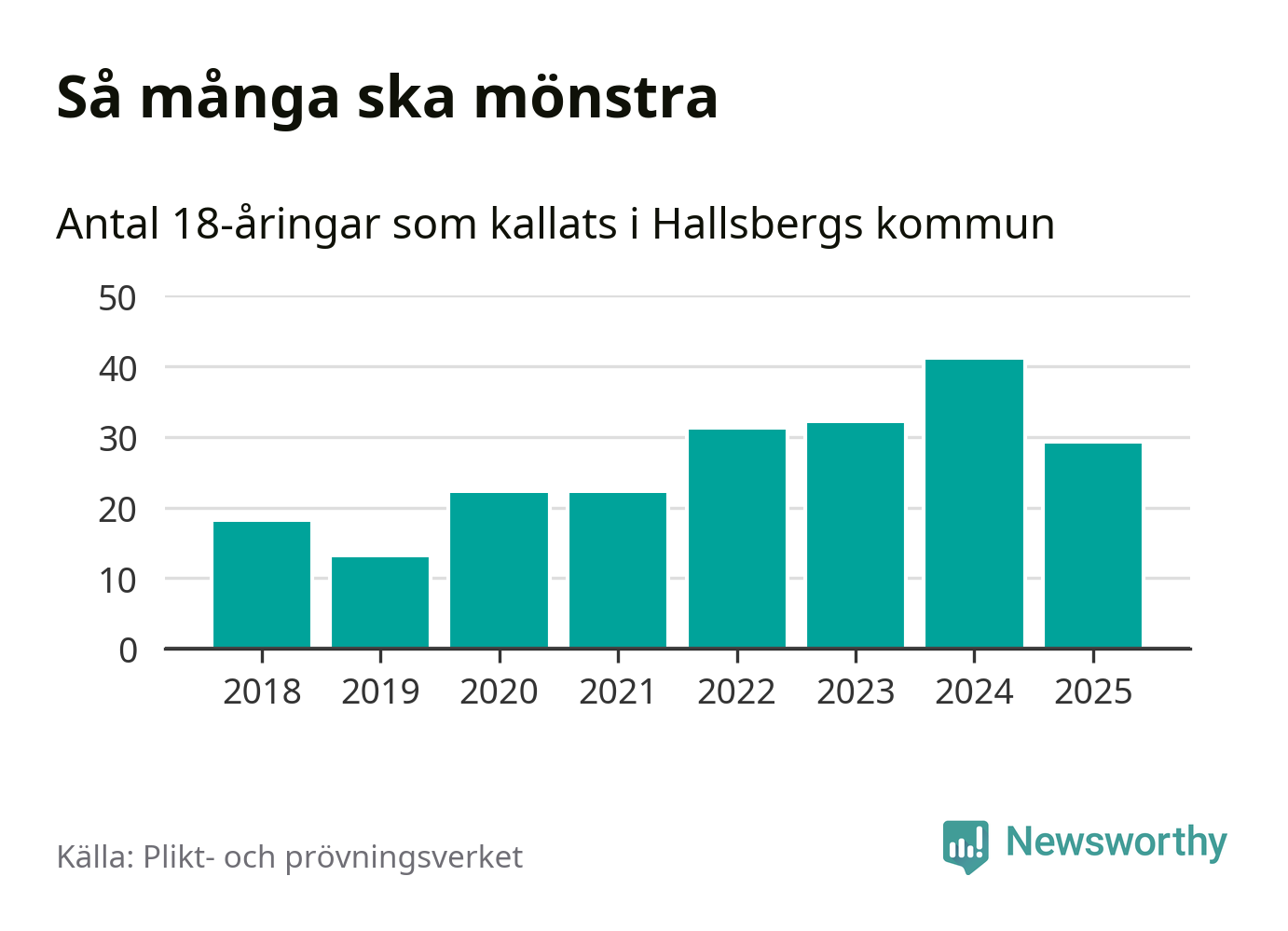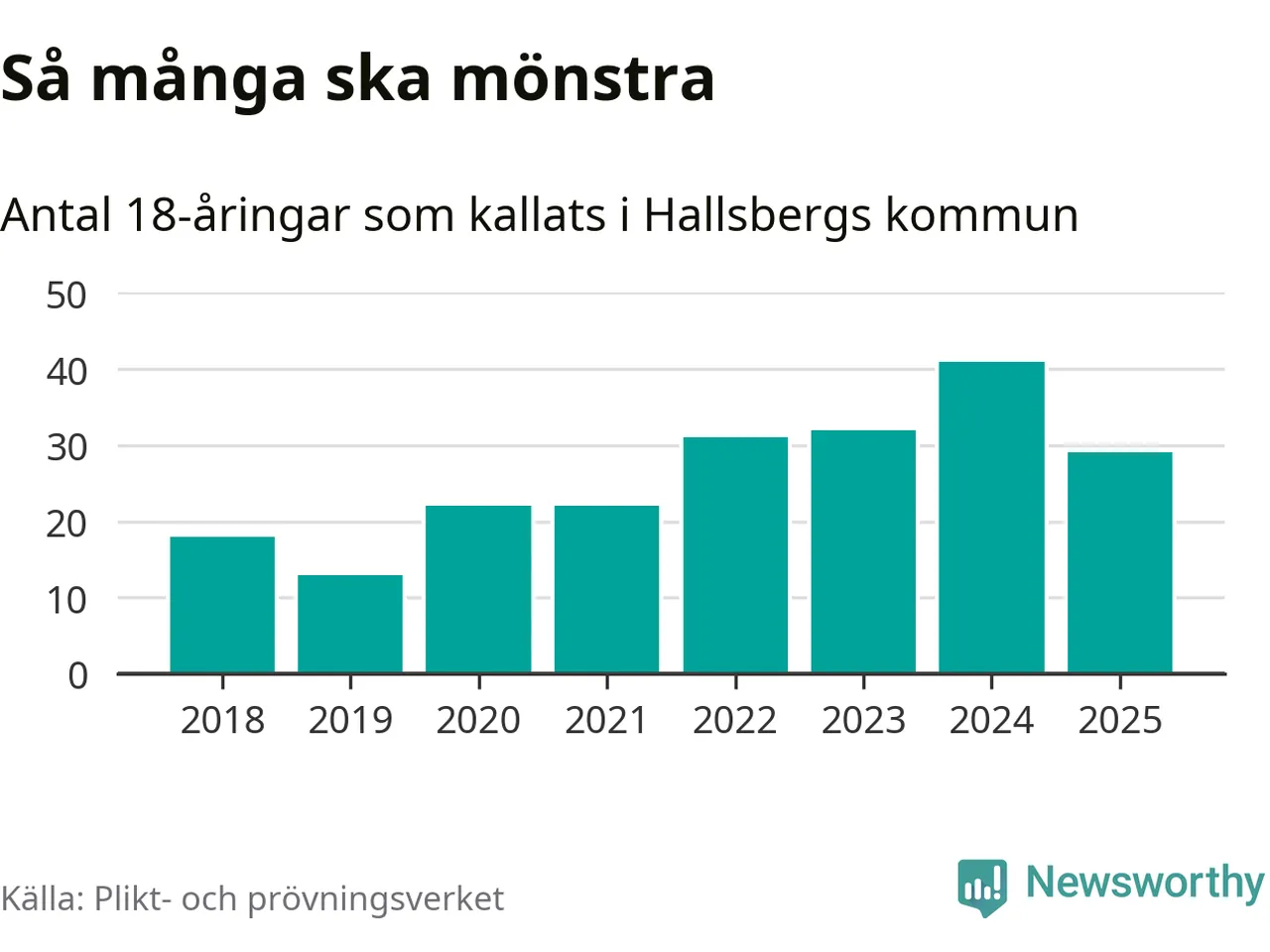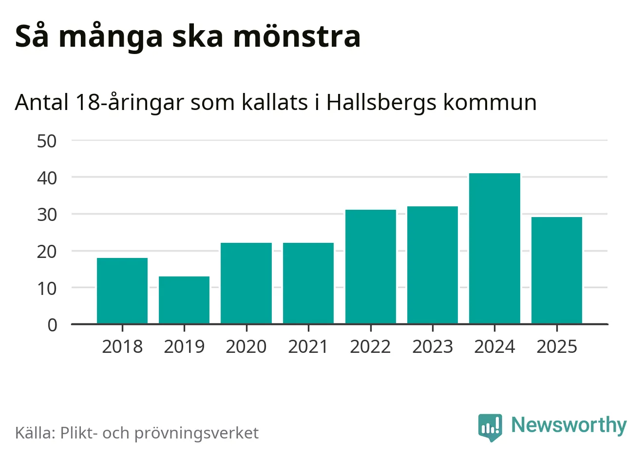 Nu kallas omkring 28 200 svenskar födda 2007 till mönstring. Och 29 av dem kommer från Hallsberg, enligt ny statistik från Plikt- och prövningsverket. Det innebär att var sjunde invånare i åldersgruppen i kommunen kallas till mönstring. Det är en lägre andel än i Örebro län totalt. I riket som helhet kallas nästan var fjärde person i årskullen.