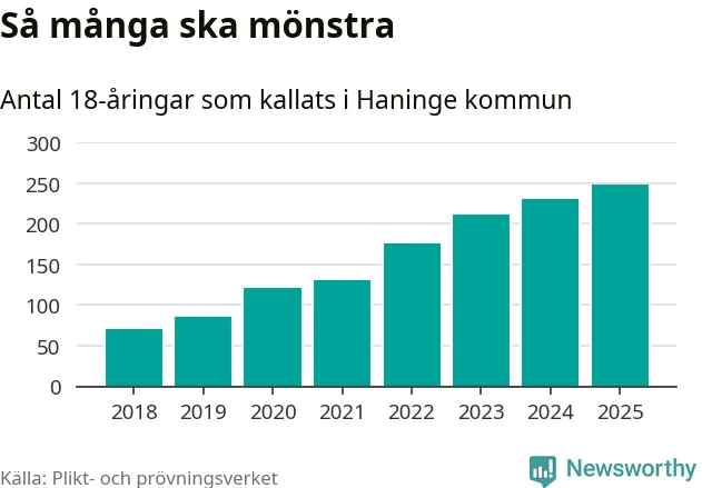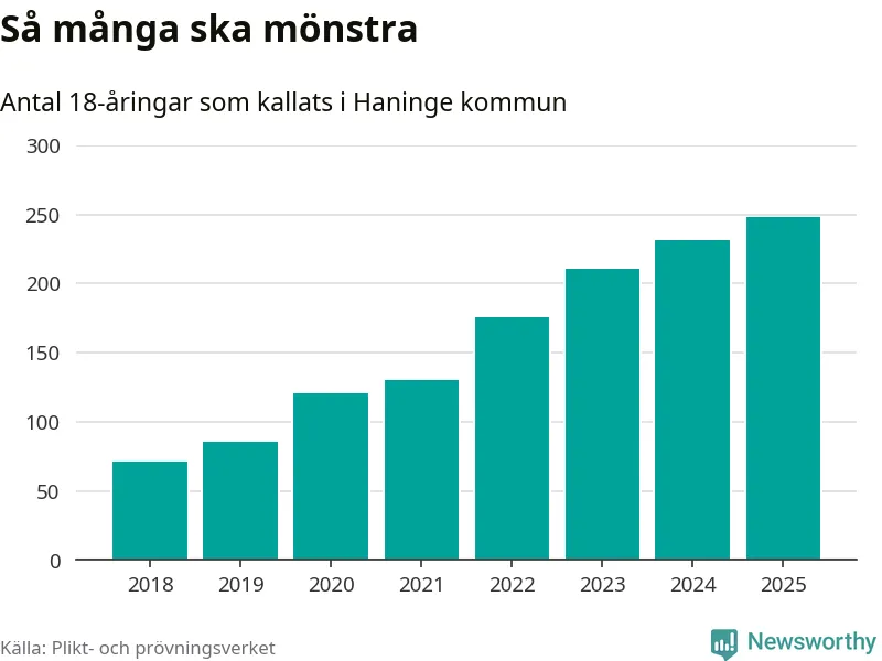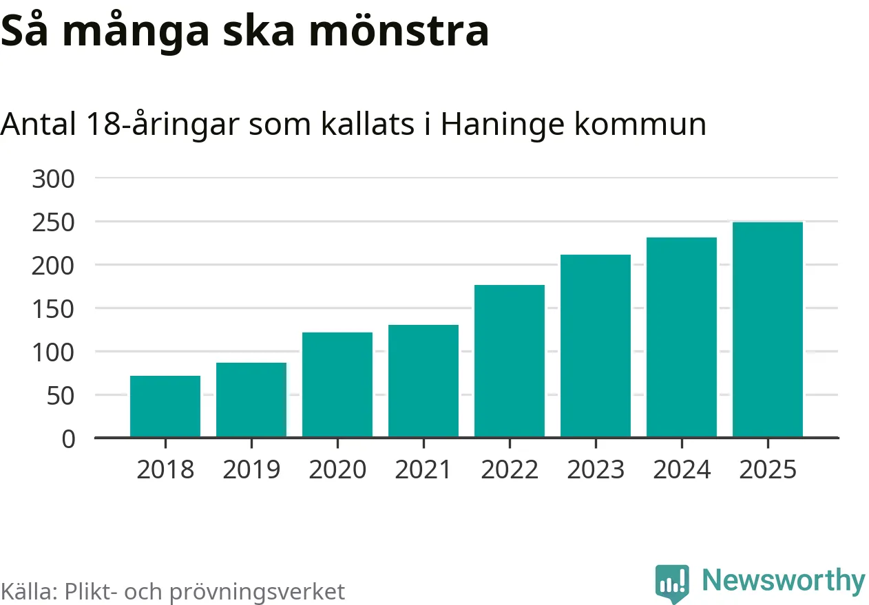 Antalet kallade i Haninge har ökat varje år sedan 2018, som är första året med statistik på kommunnivå (värnplikten återinfördes 2017), och jämfört med 2024 är det 17 fler i år. Totalt från Stockholms län kallas 6 801 personer i år.