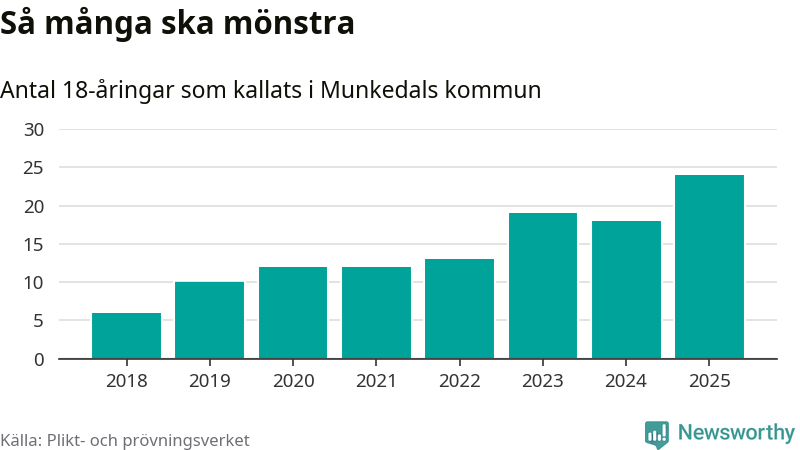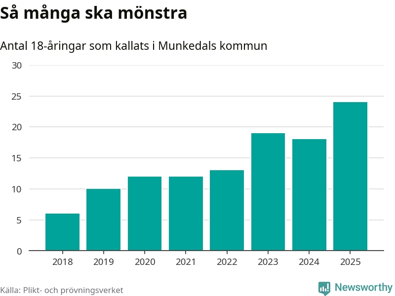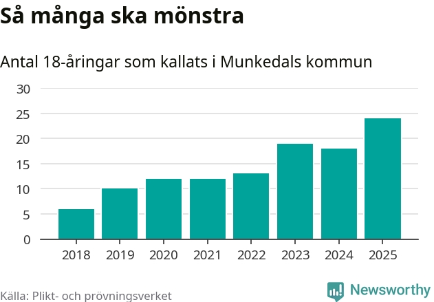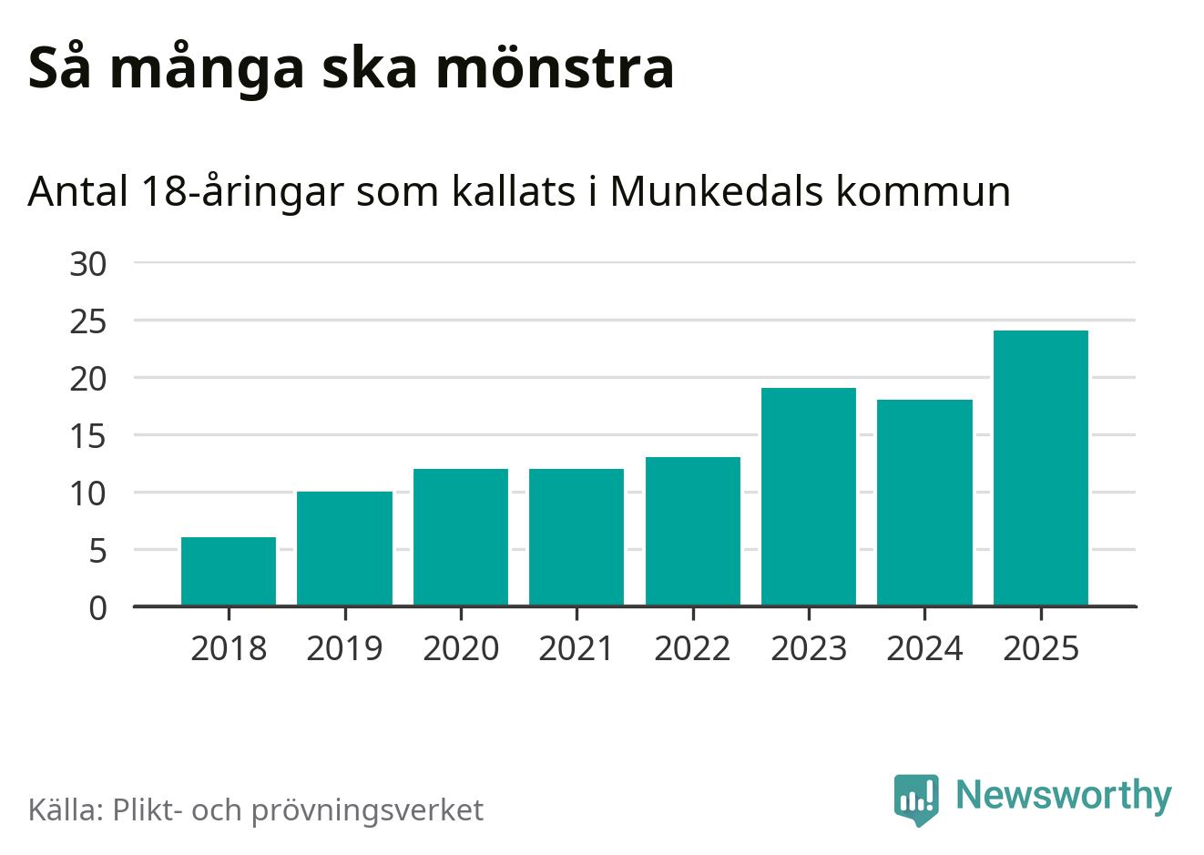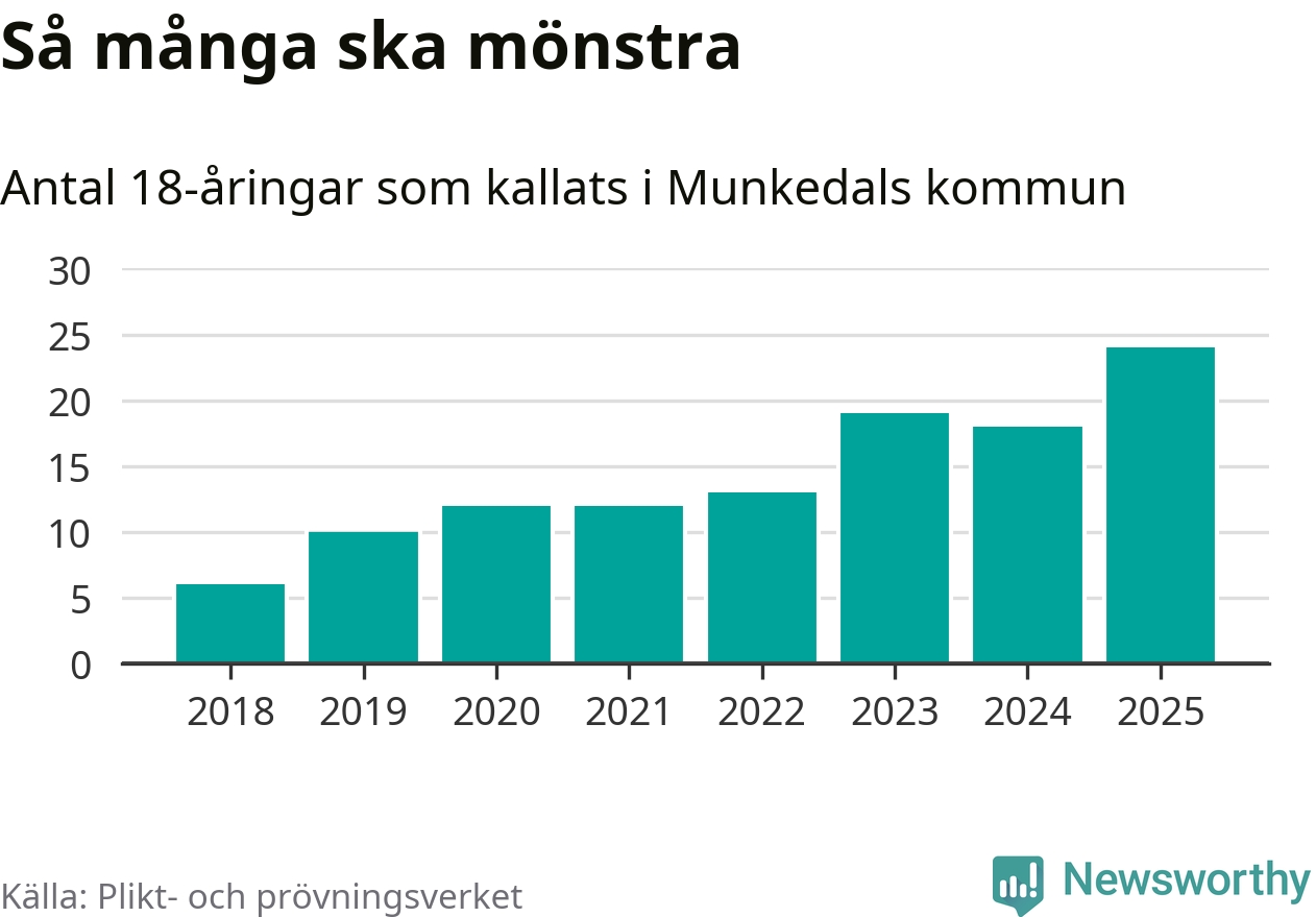 24 personer är det högsta antalet kallade i Munkedal sedan 2018, som är första året med statistik på kommunnivå (värnplikten återinfördes 2017), och sex mönstrande fler än 2024. Totalt från Västra Götalands län kallas 4 523 personer i år.