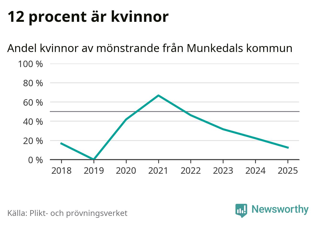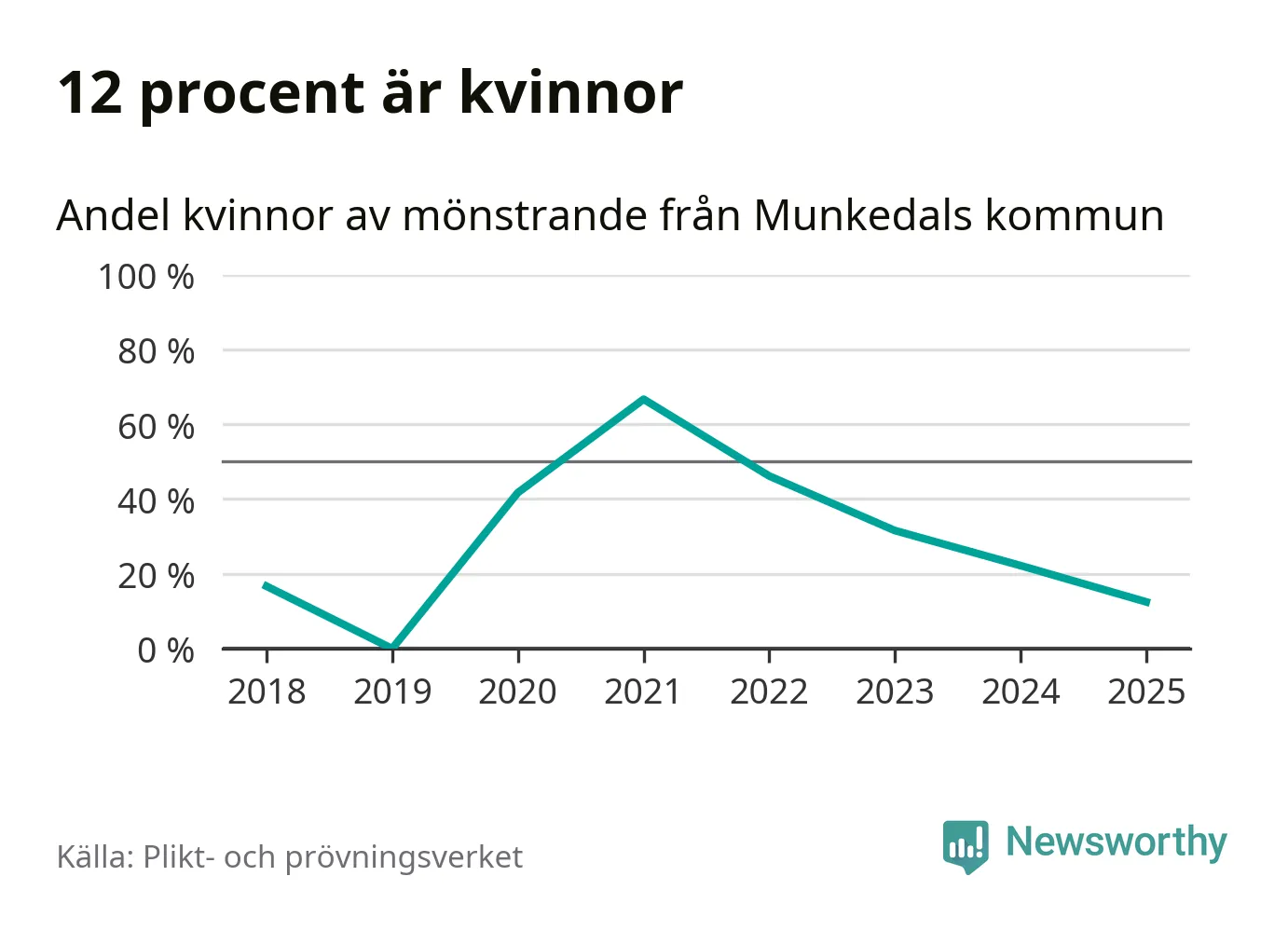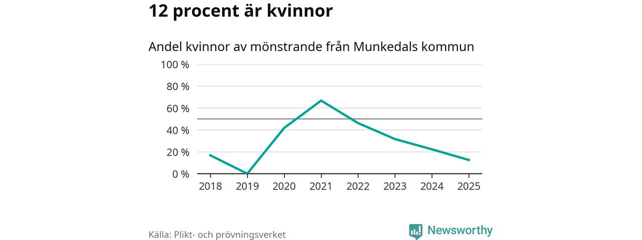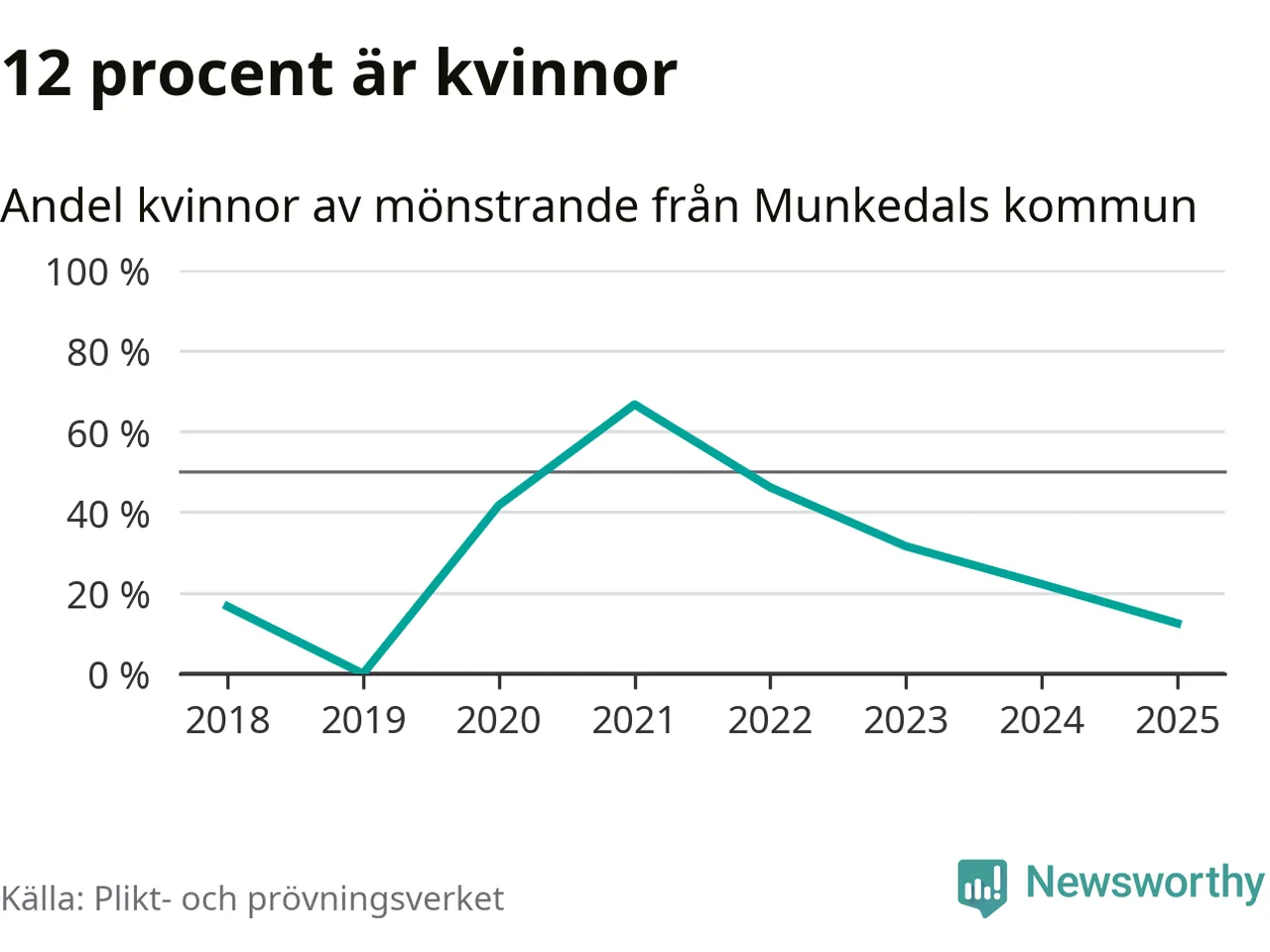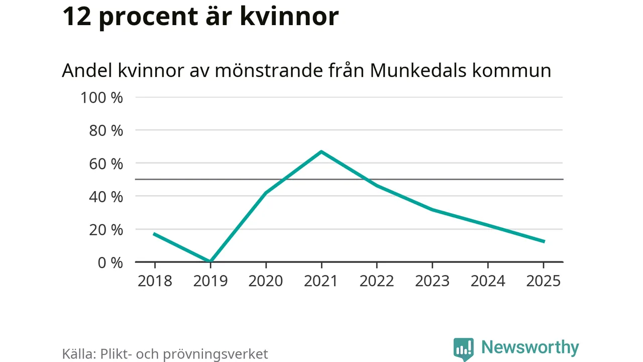 Tre av de som kallats till mönstring från Munkedal är kvinnor, vilket motsvarar 13 procent av de mönstrande. Som mest har åtta kvinnor kallats från kommunen (2021). I riket som helhet är 28 procent av de mönstrande tjejer.