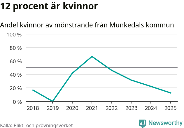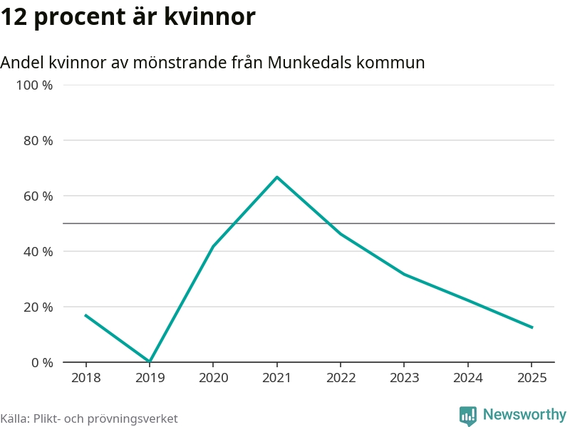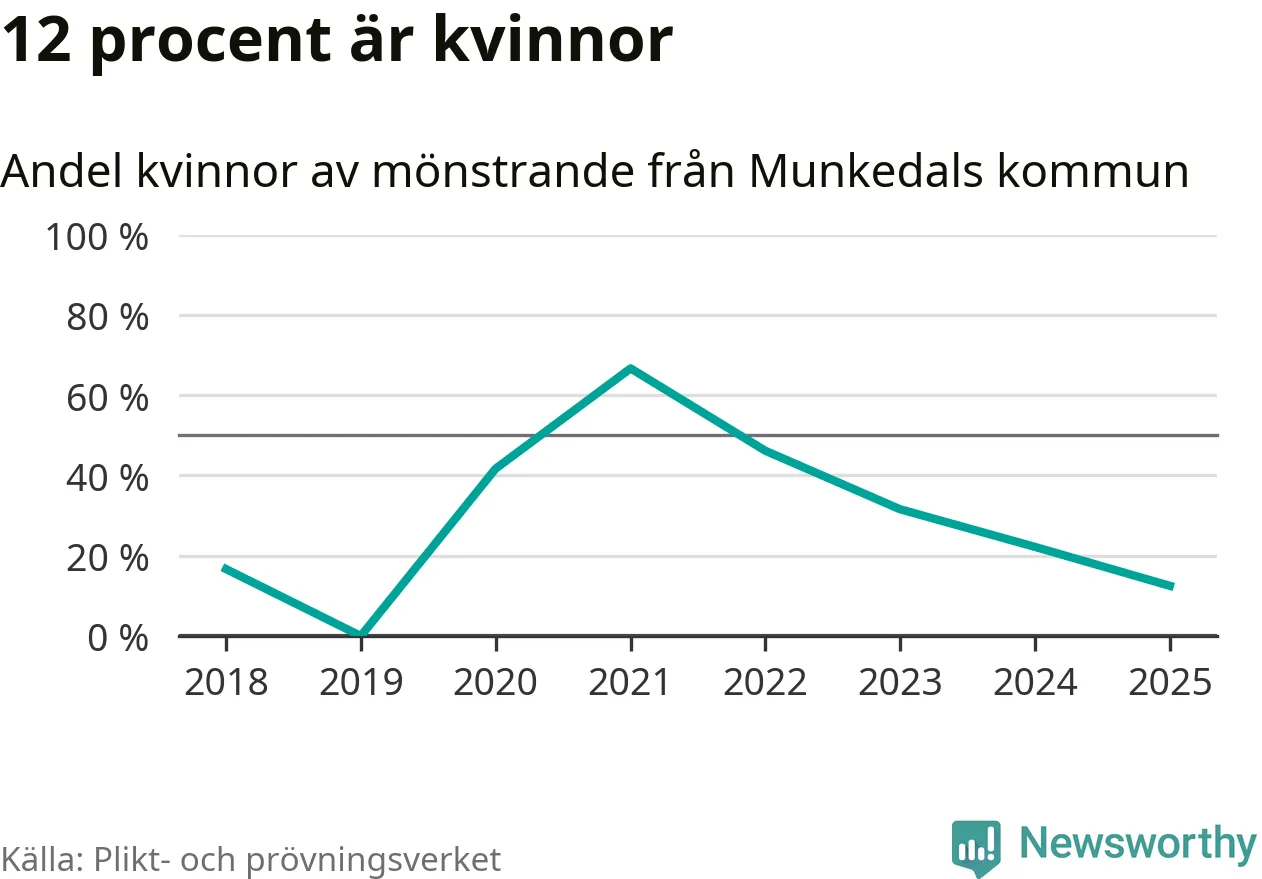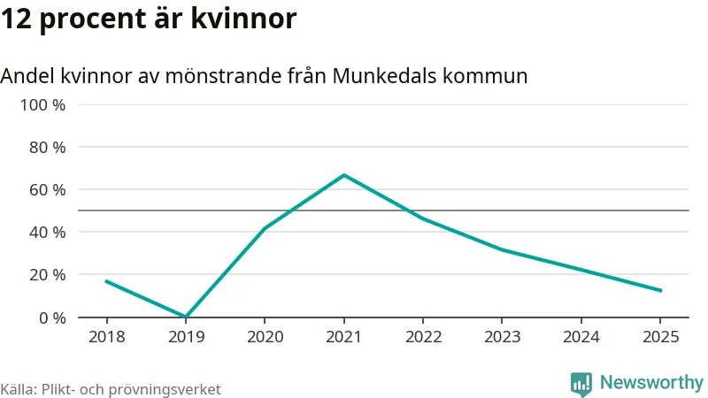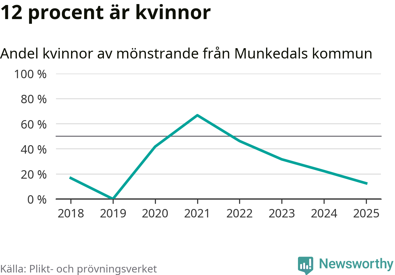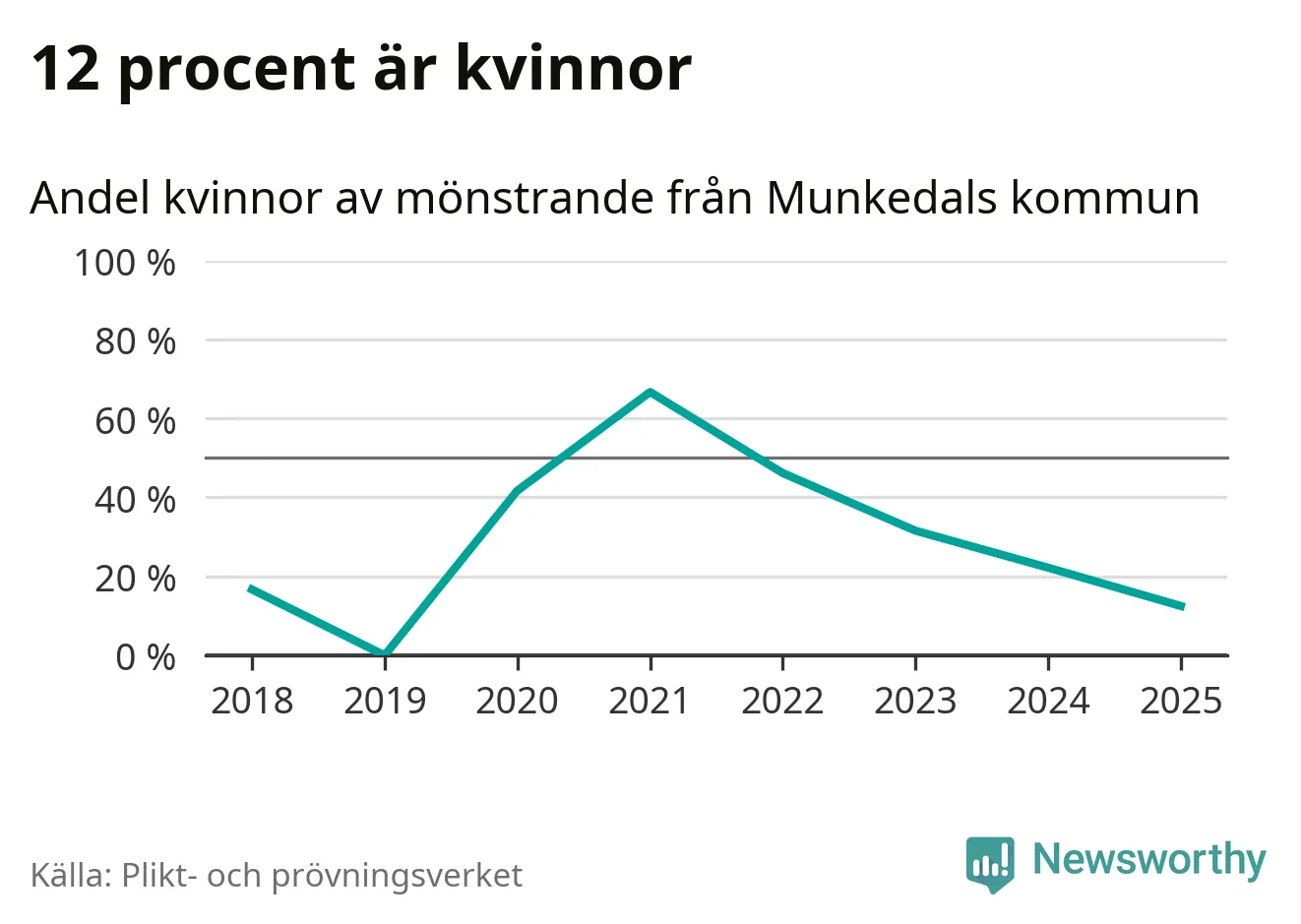 Tre av de som kallats till mönstring från Munkedal är kvinnor, vilket motsvarar 13 procent av de mönstrande. Som mest har åtta kvinnor kallats från kommunen (2021). I riket som helhet är 28 procent av de mönstrande tjejer.