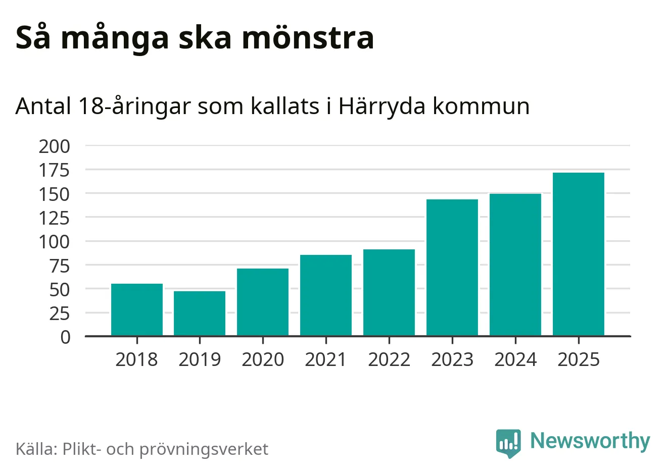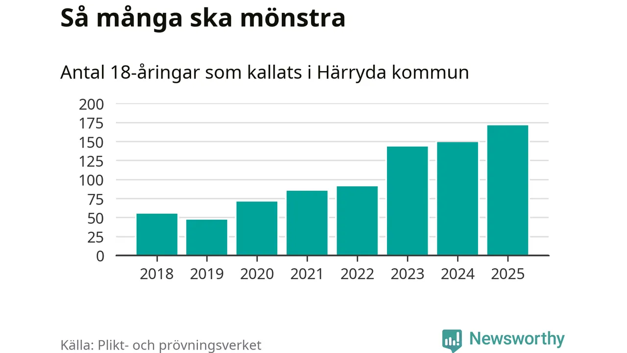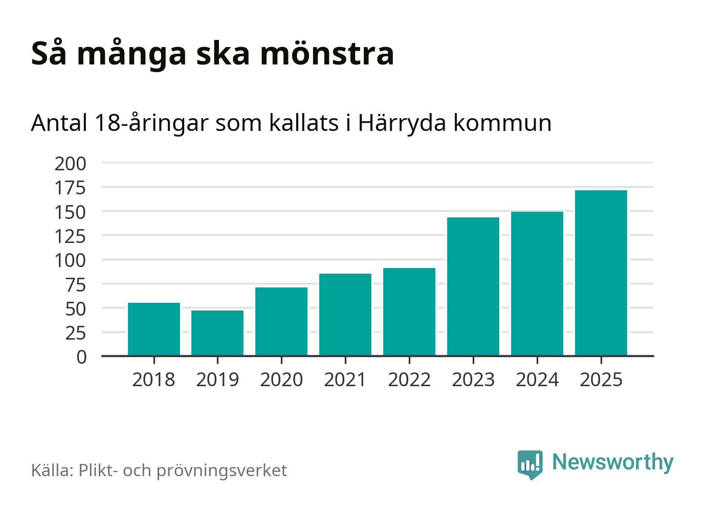 171 personer är det högsta antalet kallade i Härryda sedan 2018, som är första året med statistik på kommunnivå (värnplikten återinfördes 2017), och 22 mönstrande fler än 2024. Totalt från Västra Götalands län kallas 4 523 personer i år.