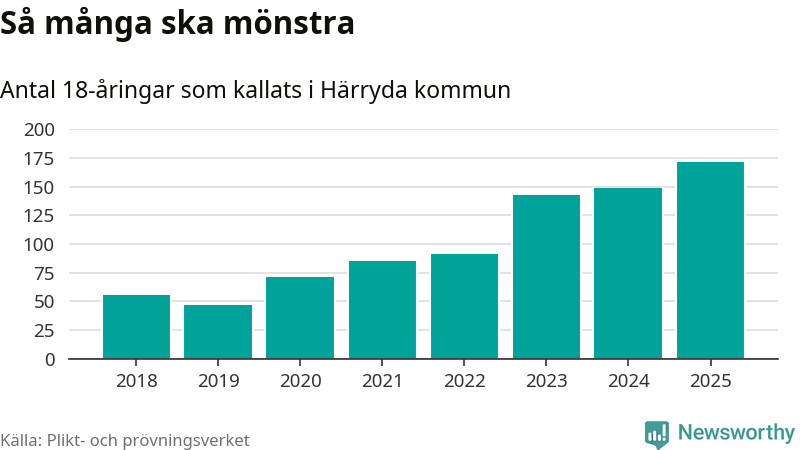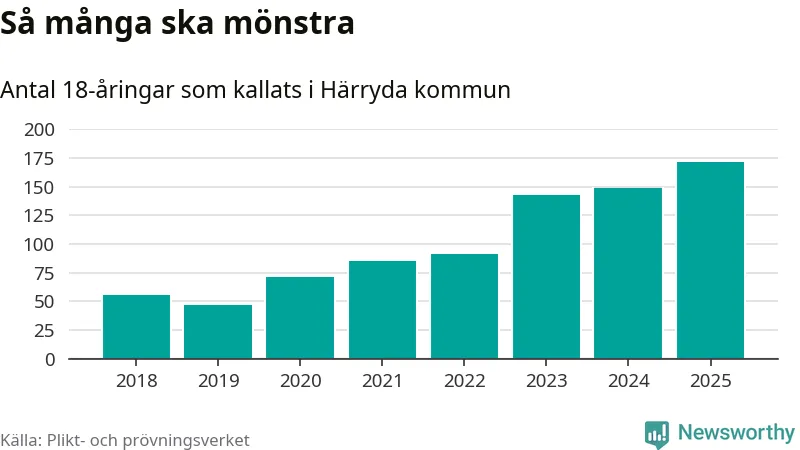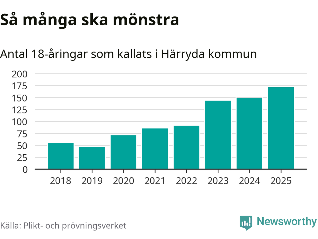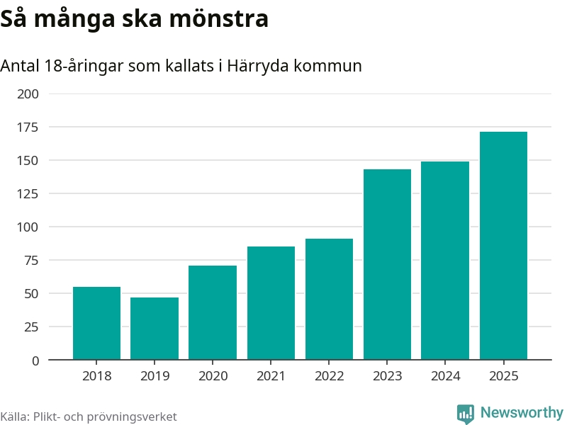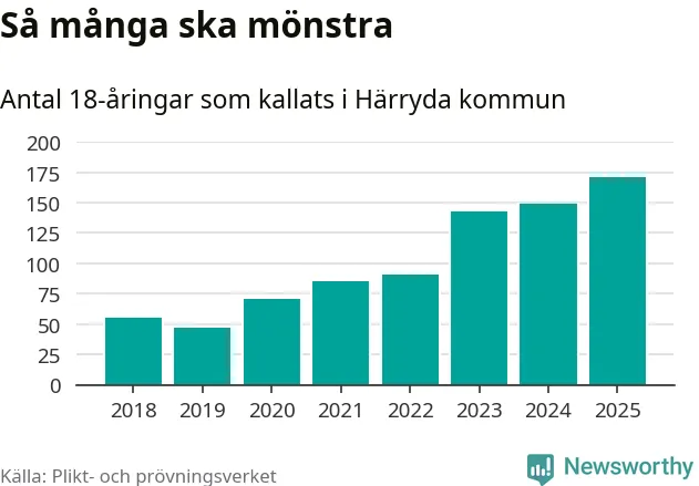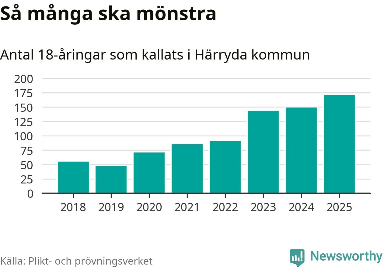 171 personer är det högsta antalet kallade i Härryda sedan 2018, som är första året med statistik på kommunnivå (värnplikten återinfördes 2017), och 22 mönstrande fler än 2024. Totalt från Västra Götalands län kallas 4 523 personer i år.