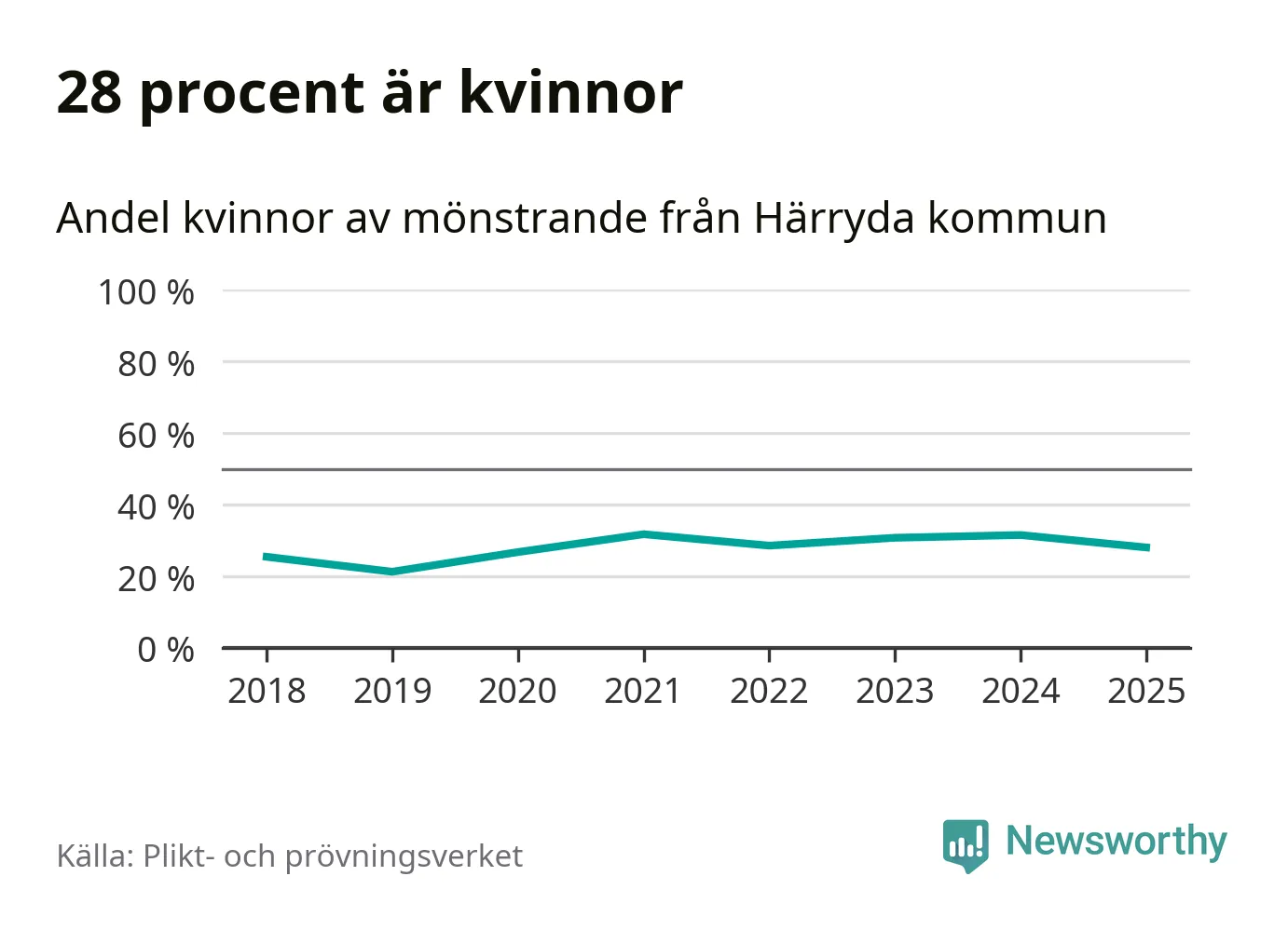 48 av de som kallats till mönstring från Härryda är kvinnor, vilket motsvarar 28 procent av de mönstrande. I absoluta tal är det fler kvinnor än något år sedan värnplikten återinfördes, men 2021 var en större andel av de mönstrande från kommunen kvinnor (32 procent). I riket som helhet är 28 procent av de mönstrande tjejer.