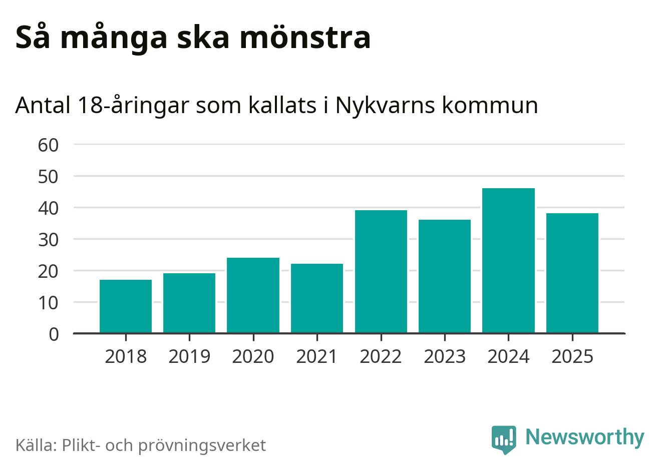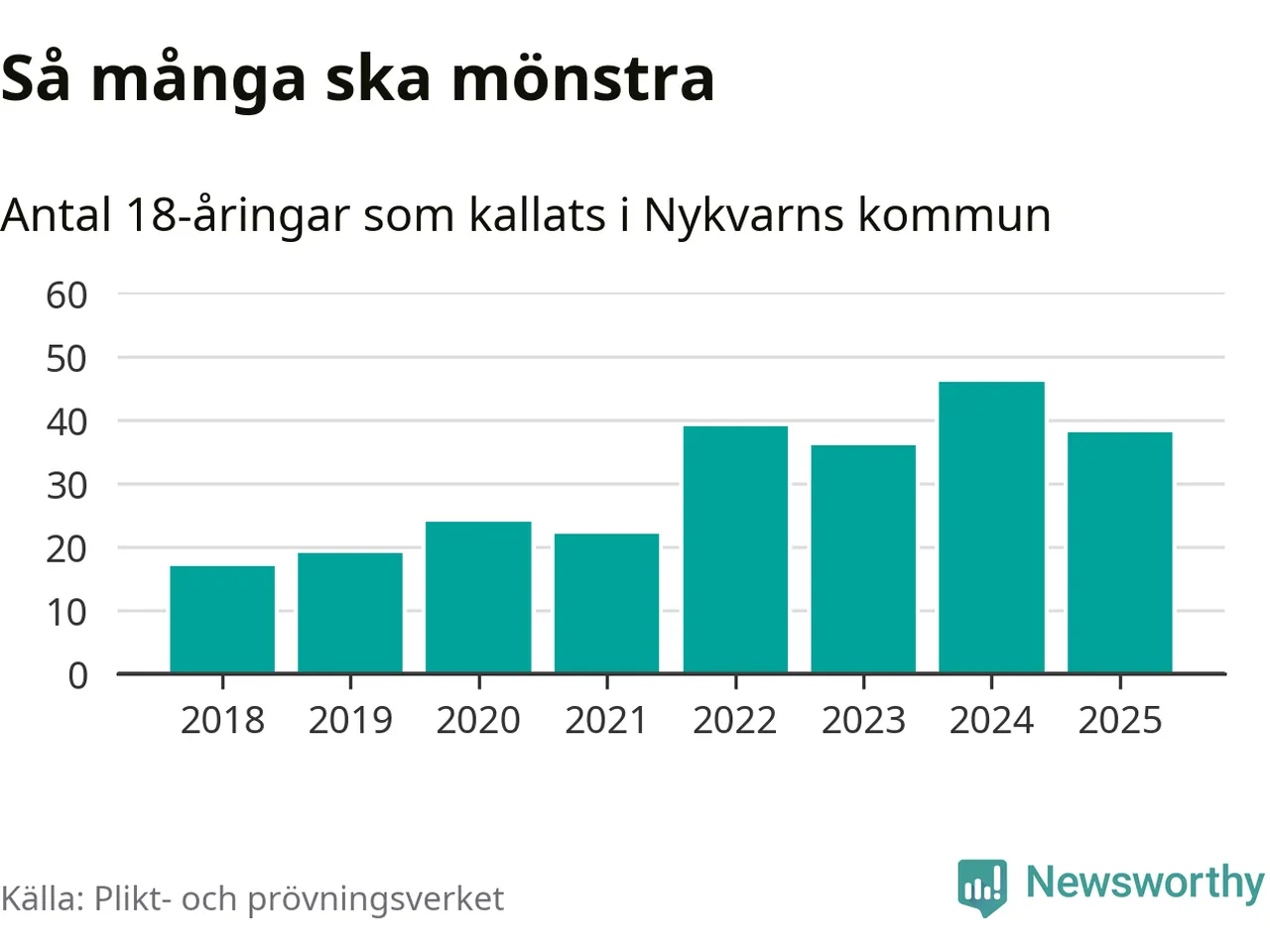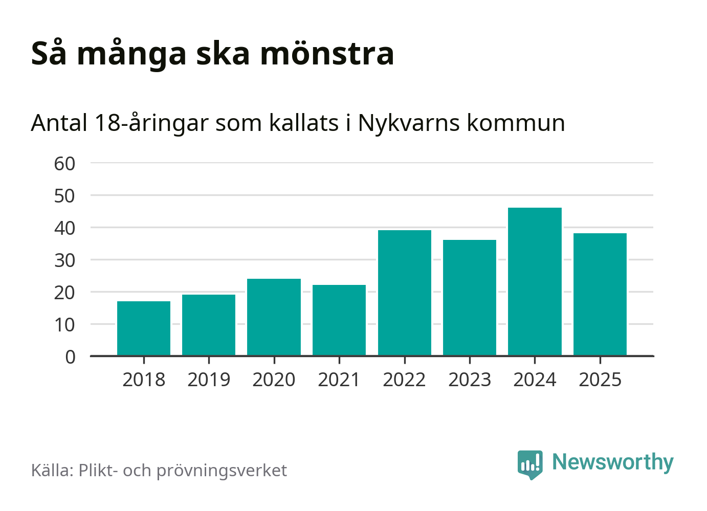 Nu kallas omkring 28 200 svenskar födda 2007 till mönstring. Och 38 av dem kommer från Nykvarn, enligt ny statistik från Plikt- och prövningsverket. Det innebär att var femte invånare i åldersgruppen i kommunen kallas till mönstring. Det är en lägre andel än i Stockholms län totalt. I riket som helhet kallas nästan var fjärde person i årskullen.