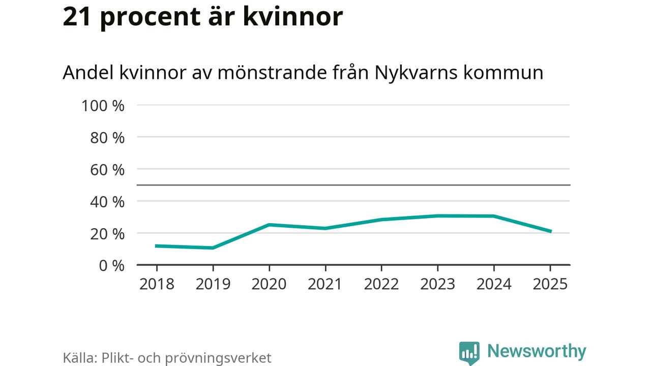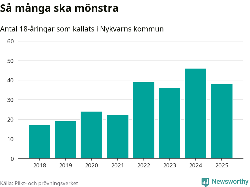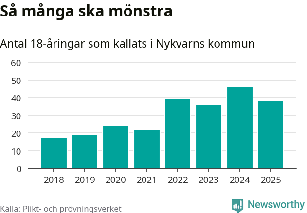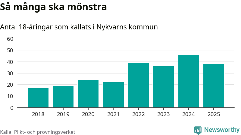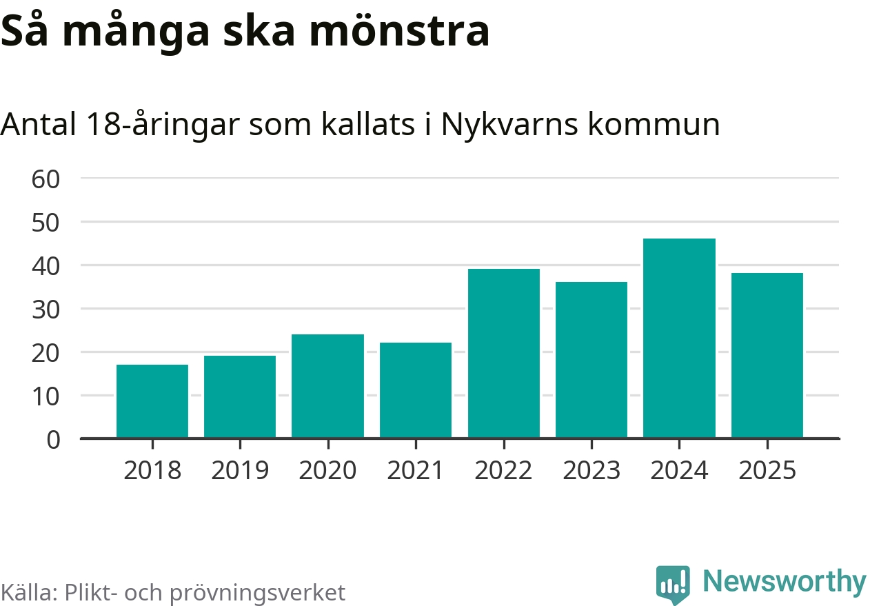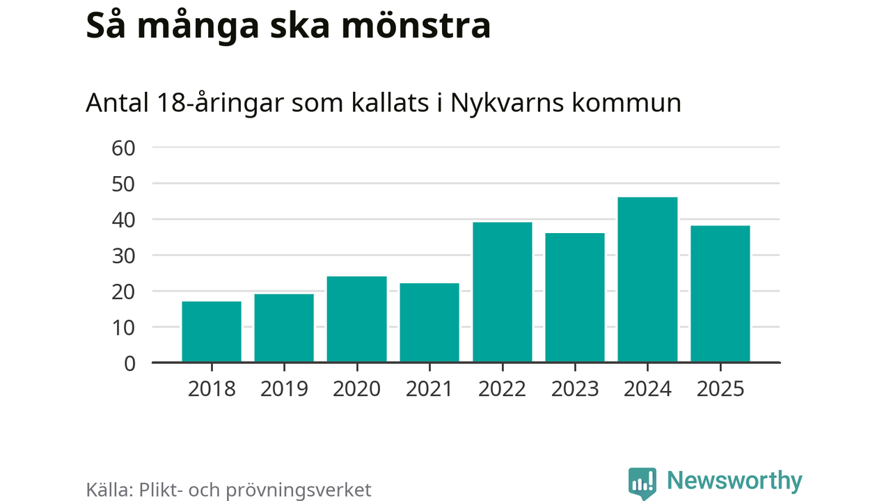 Nu kallas omkring 28 200 svenskar födda 2007 till mönstring. Och 38 av dem kommer från Nykvarn, enligt ny statistik från Plikt- och prövningsverket. Det innebär att var femte invånare i åldersgruppen i kommunen kallas till mönstring. Det är en lägre andel än i Stockholms län totalt. I riket som helhet kallas nästan var fjärde person i årskullen.