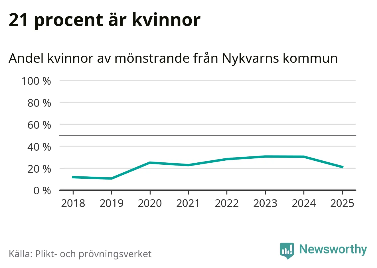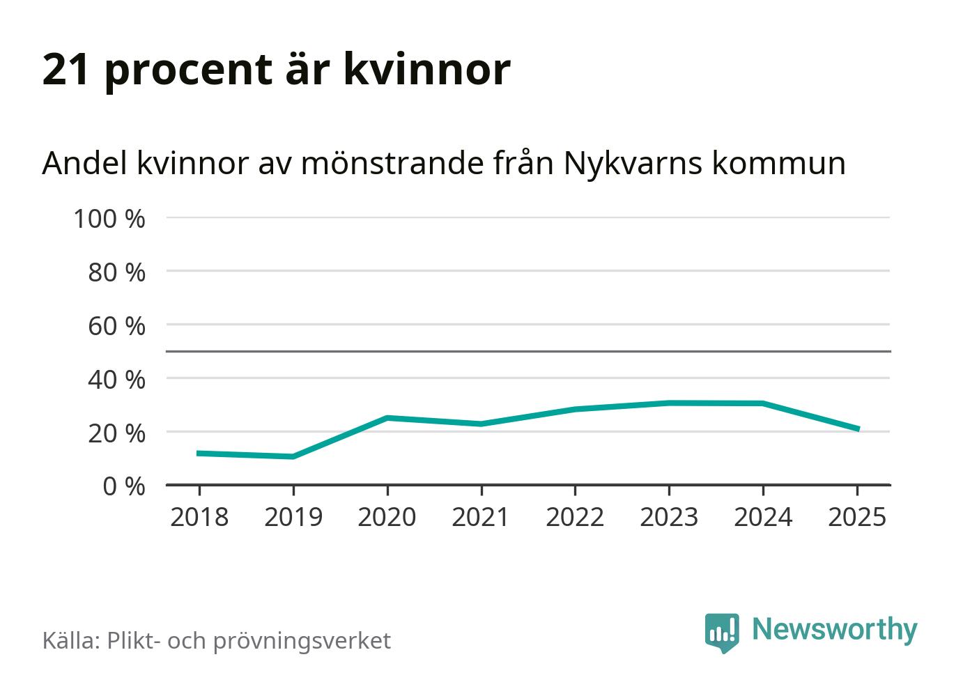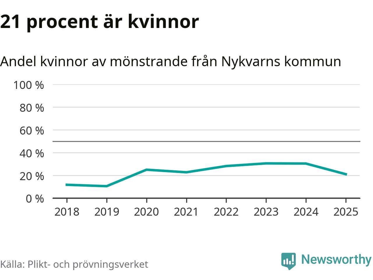 Åtta av de som kallats till mönstring från Nykvarn är kvinnor, vilket motsvarar 21 procent av de mönstrande. Som mest har 14 kvinnor kallats från kommunen (2024). I riket som helhet är 28 procent av de mönstrande tjejer.