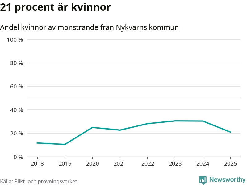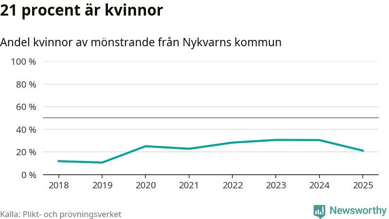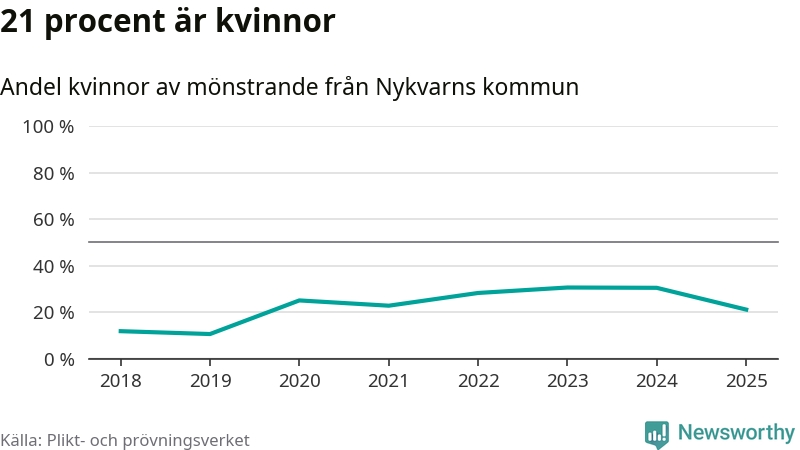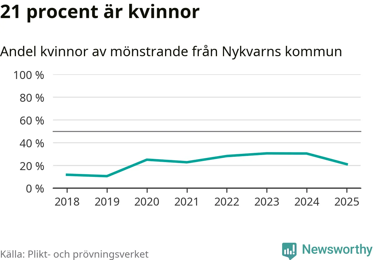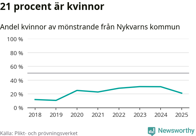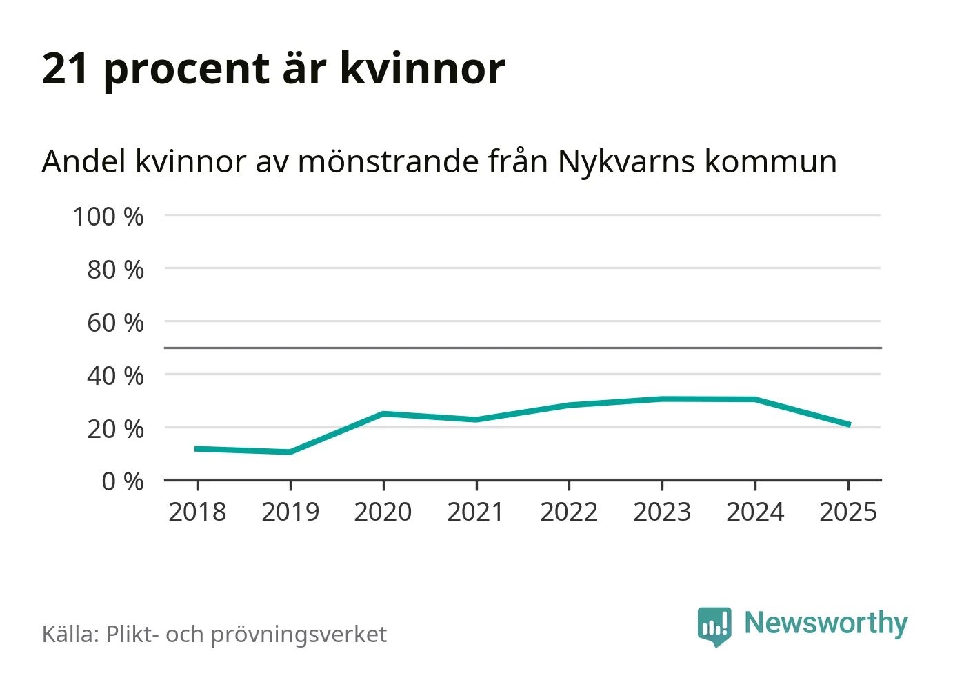 Åtta av de som kallats till mönstring från Nykvarn är kvinnor, vilket motsvarar 21 procent av de mönstrande. Som mest har 14 kvinnor kallats från kommunen (2024). I riket som helhet är 28 procent av de mönstrande tjejer.