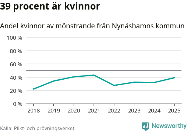 34 av de som kallats till mönstring från Nynäshamn är kvinnor, vilket motsvarar 39 procent av de mönstrande. I absoluta tal är det fler kvinnor än något år sedan värnplikten återinfördes, men 2021 var en större andel av de mönstrande från kommunen kvinnor (43 procent). I riket som helhet är 28 procent av de mönstrande tjejer.