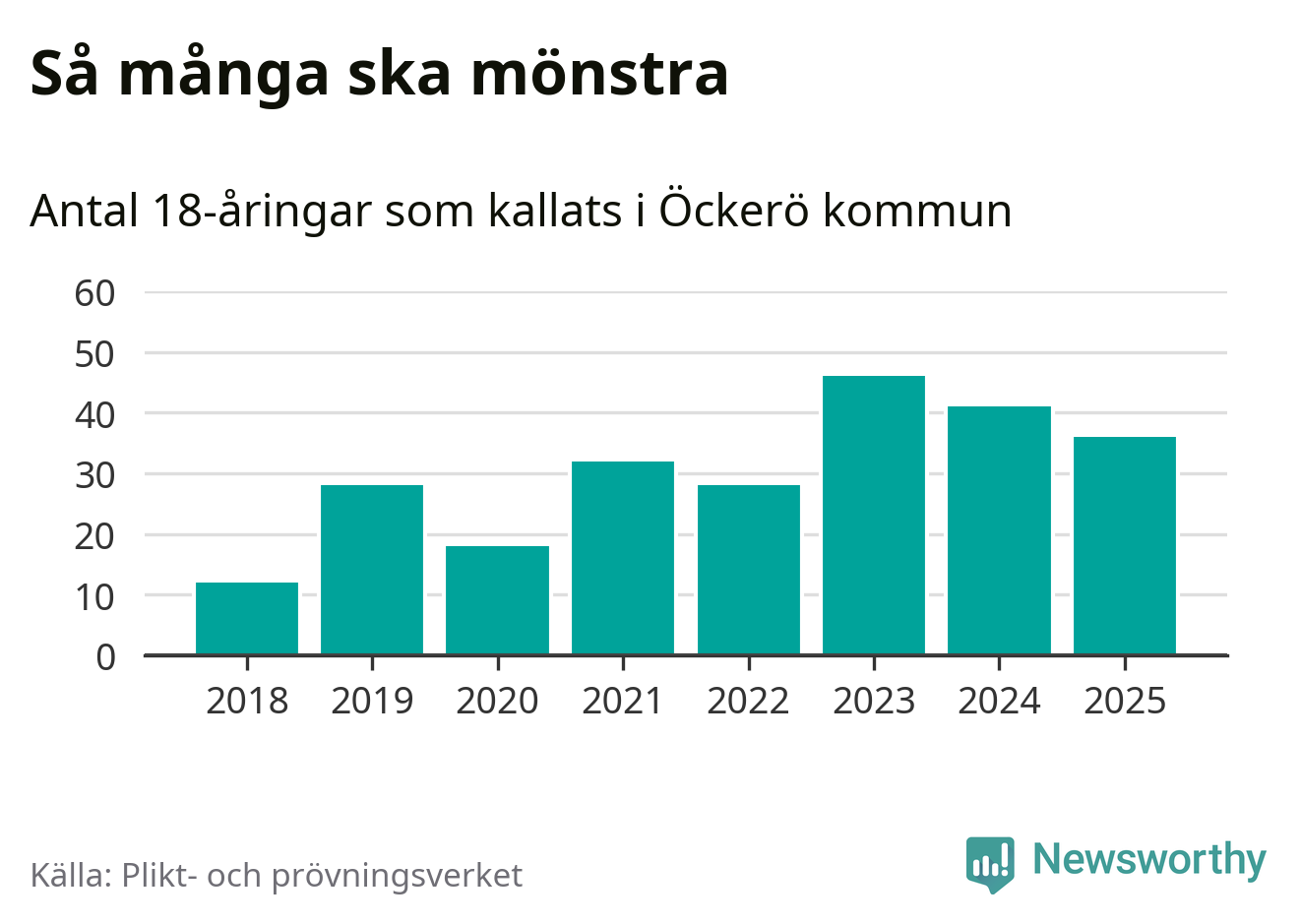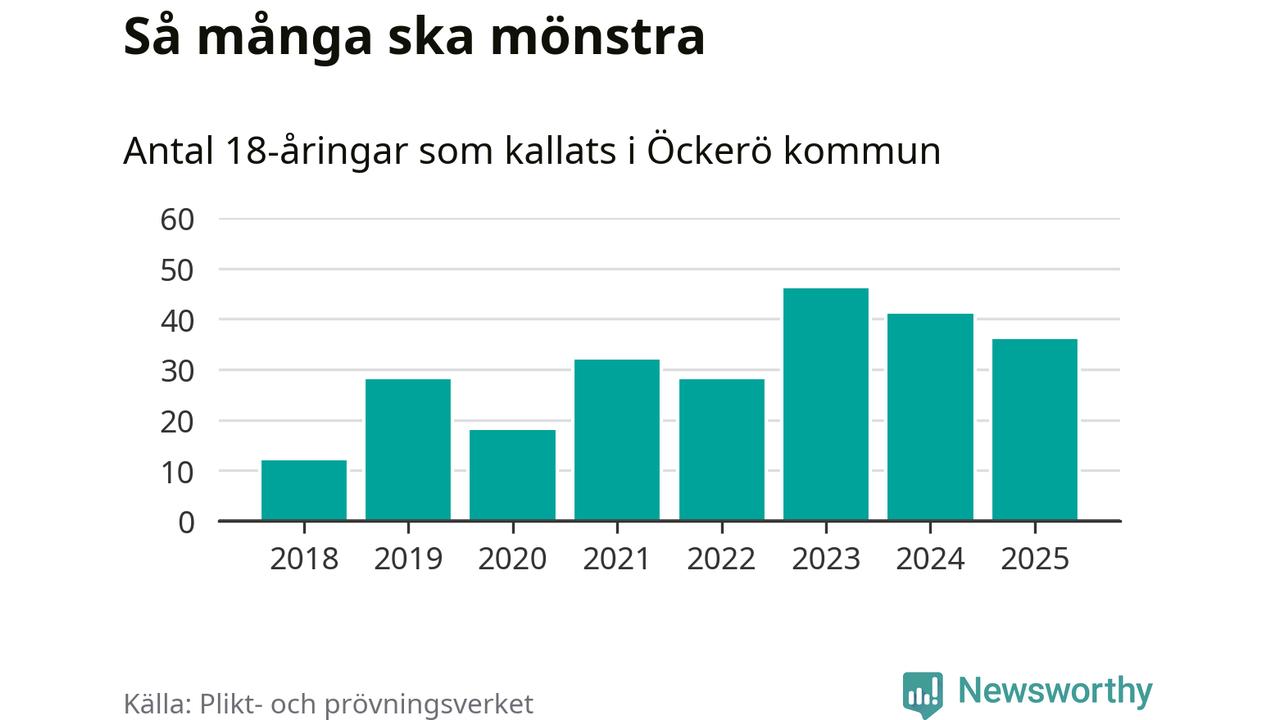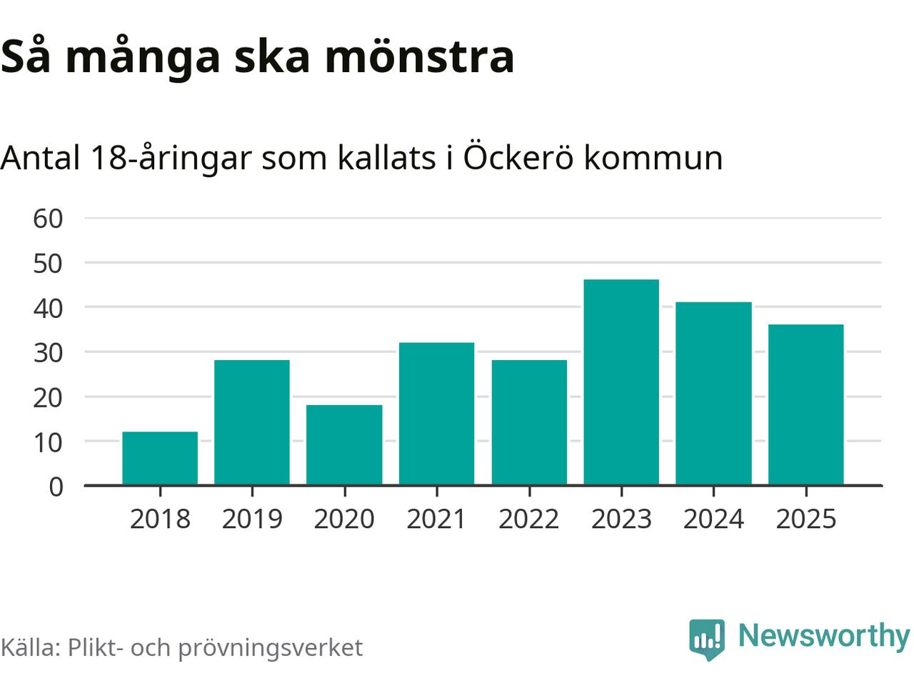Nu kallas omkring 28 200 svenskar födda 2007 till mönstring. Och 36 av dem kommer från Öckerö, enligt ny statistik från Plikt- och prövningsverket. Det innebär att var femte invånare i åldersgruppen i kommunen kallas till mönstring. Det är ungefär lika stor andel som i Västra Götaland totalt. I riket som helhet kallas nästan var fjärde person i årskullen.