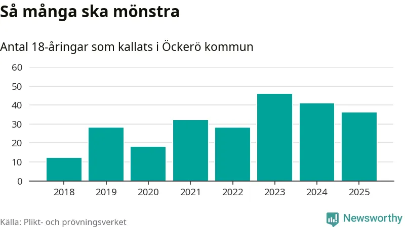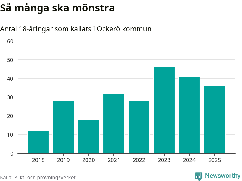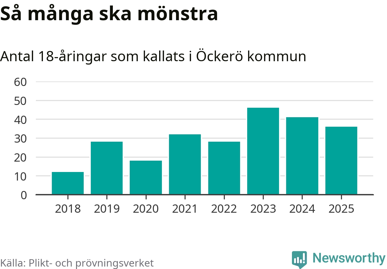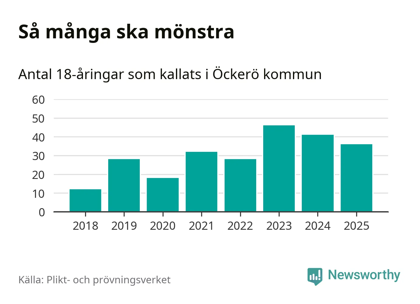 Nu kallas omkring 28 200 svenskar födda 2007 till mönstring. Och 36 av dem kommer från Öckerö, enligt ny statistik från Plikt- och prövningsverket. Det innebär att var femte invånare i åldersgruppen i kommunen kallas till mönstring. Det är ungefär lika stor andel som i Västra Götaland totalt. I riket som helhet kallas nästan var fjärde person i årskullen.