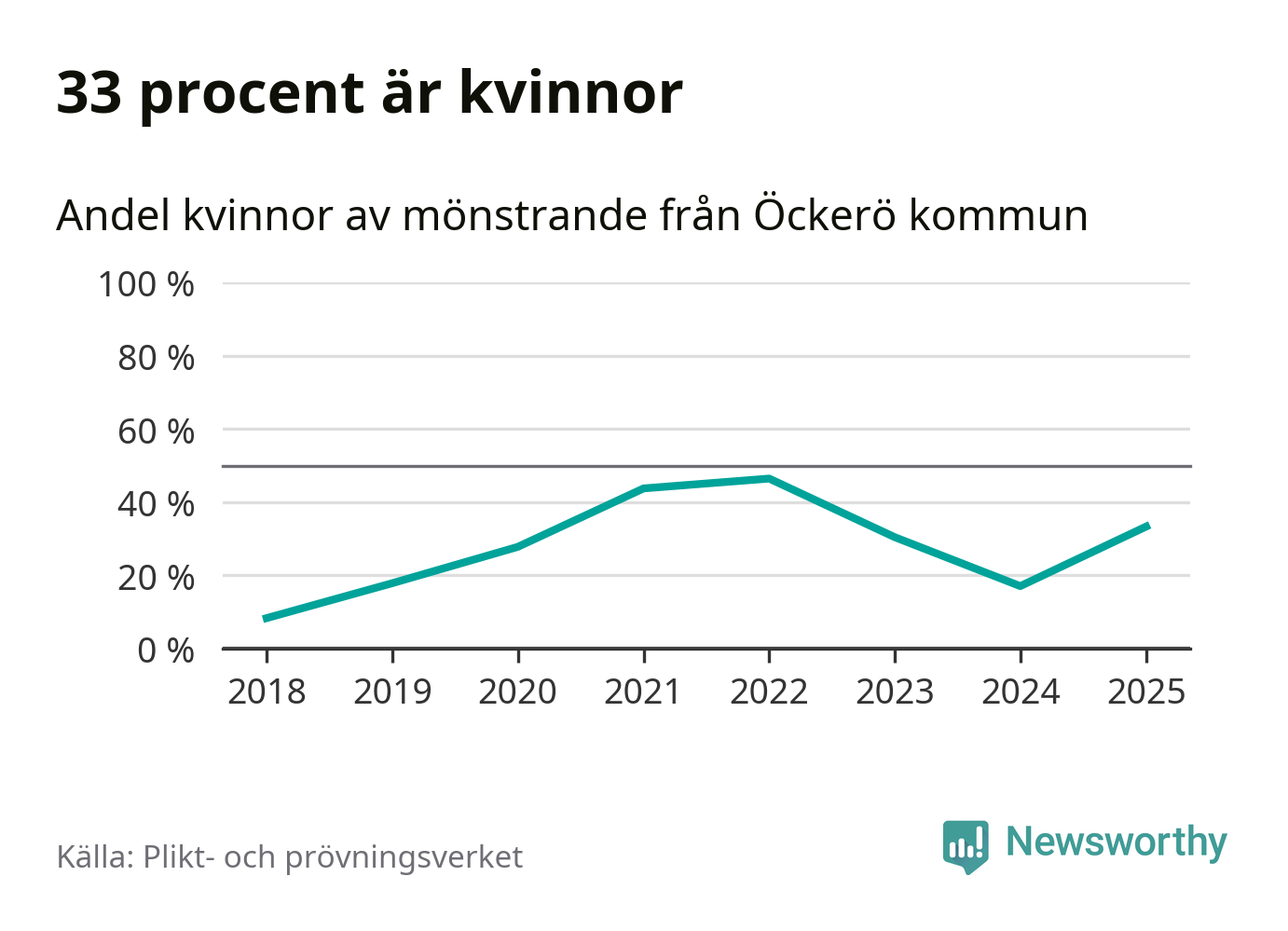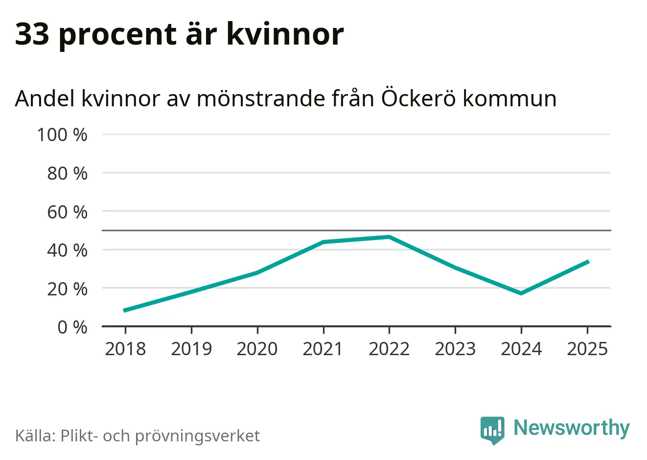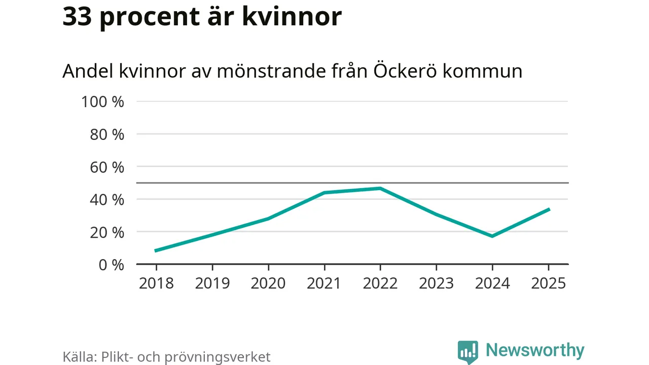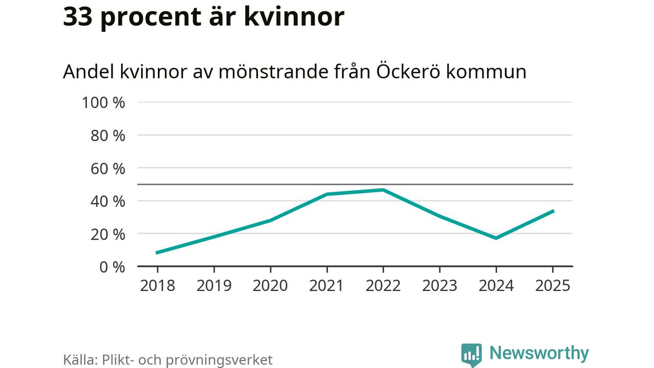 Tolv av de som kallats till mönstring från Öckerö är kvinnor, vilket motsvarar 33 procent av de mönstrande. Som mest har 14 kvinnor kallats från kommunen (2023 och 2021). I riket som helhet är 28 procent av de mönstrande tjejer.