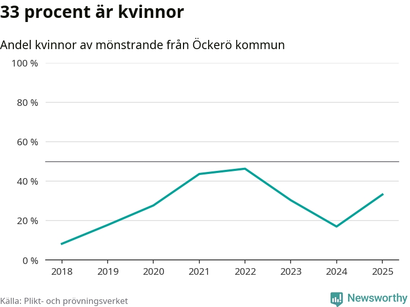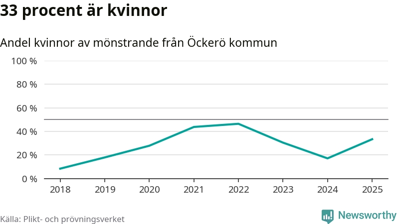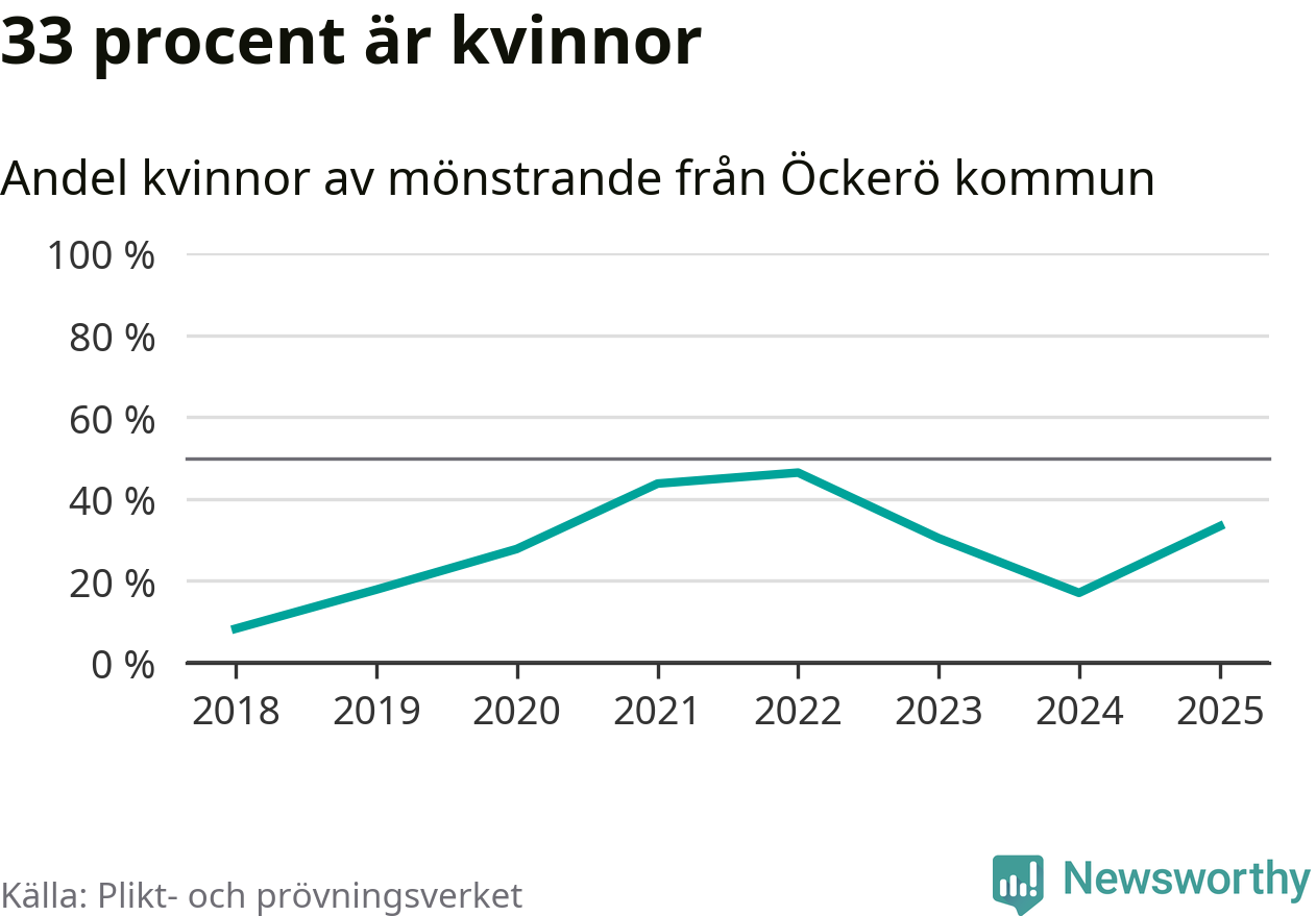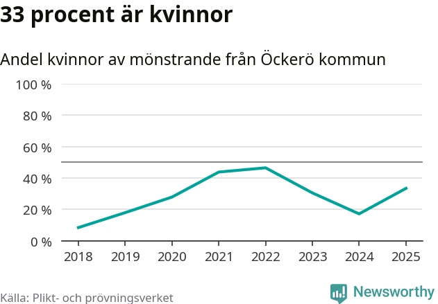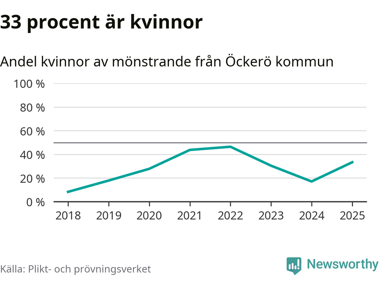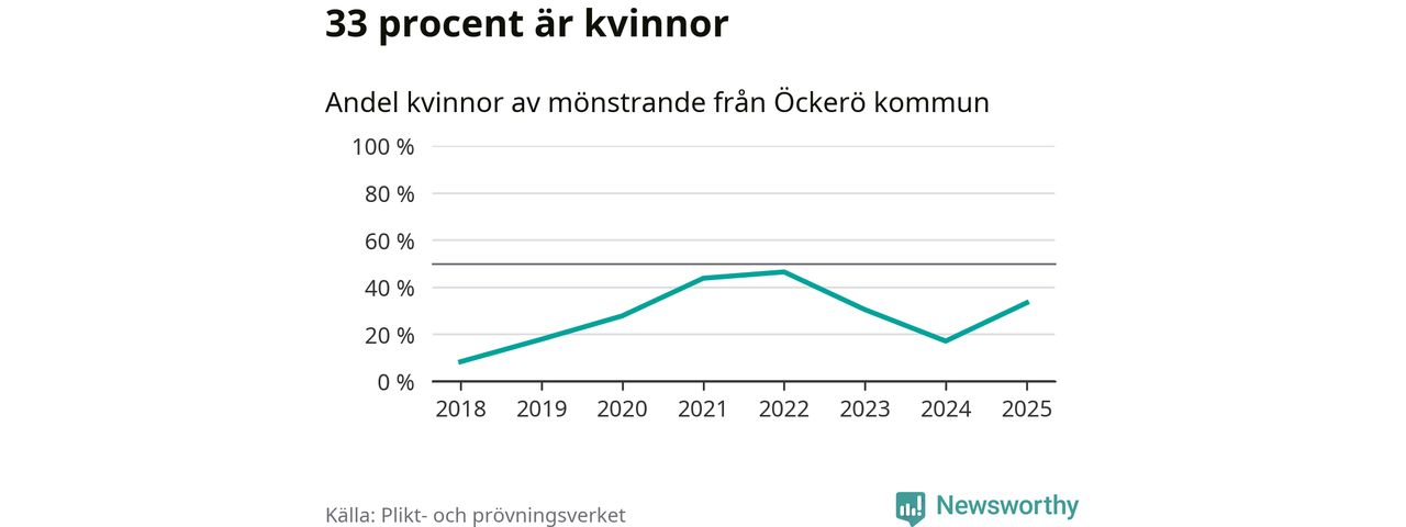 Tolv av de som kallats till mönstring från Öckerö är kvinnor, vilket motsvarar 33 procent av de mönstrande. Som mest har 14 kvinnor kallats från kommunen (2023 och 2021). I riket som helhet är 28 procent av de mönstrande tjejer.