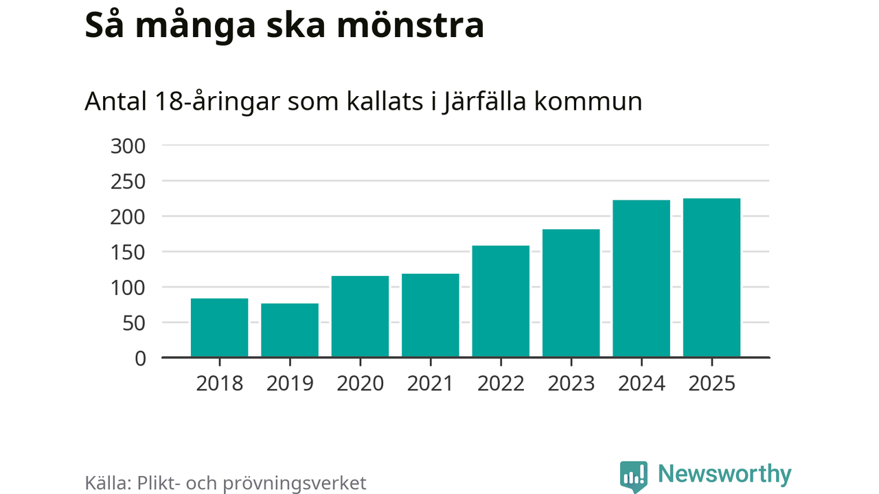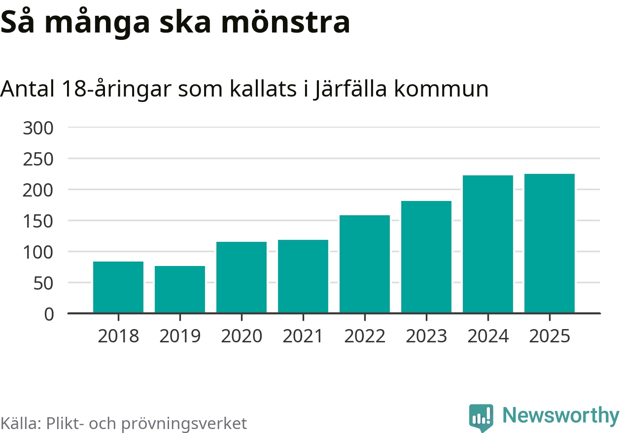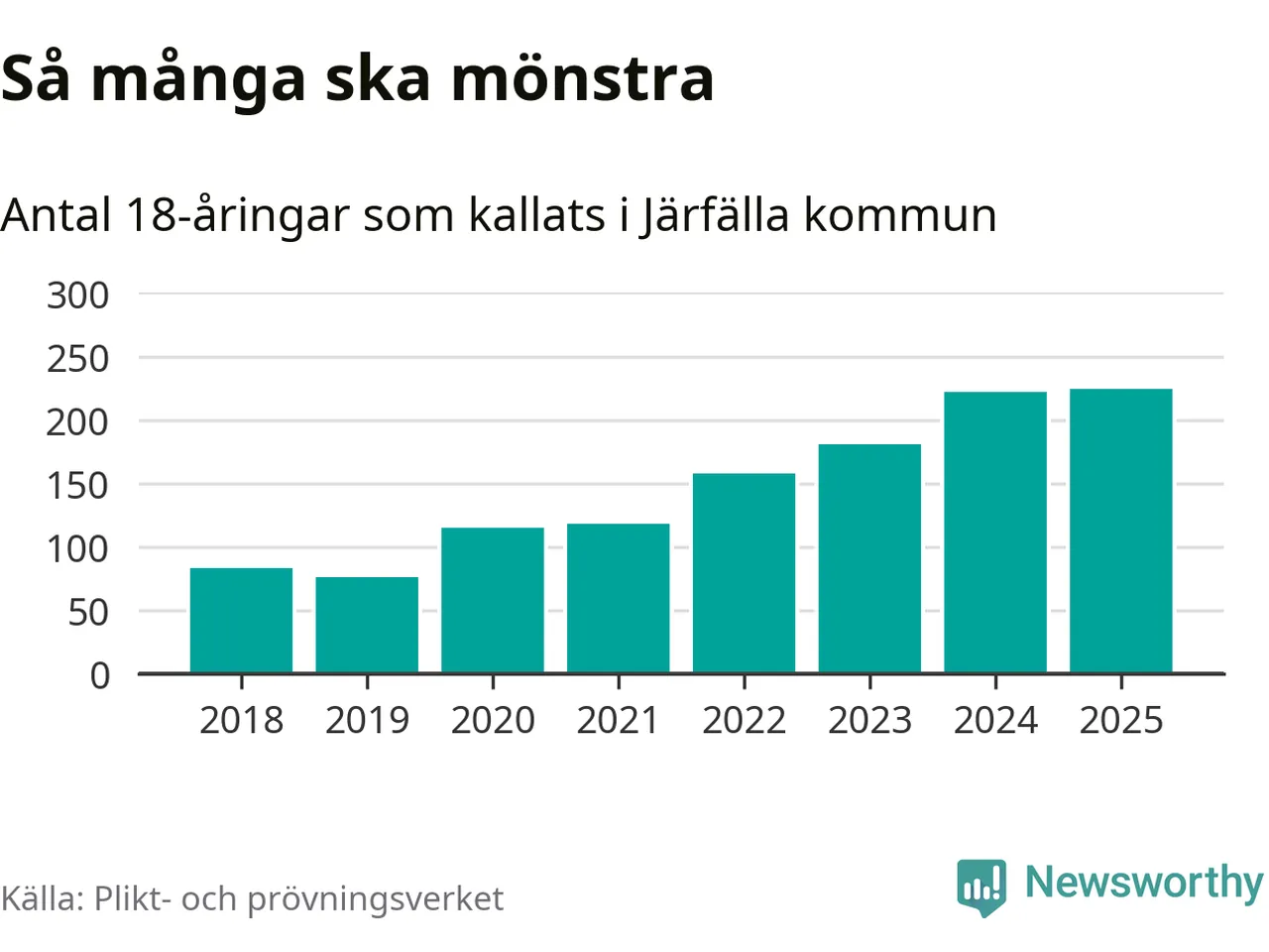 224 personer är det högsta antalet kallade i Järfälla sedan 2018, som är första året med statistik på kommunnivå (värnplikten återinfördes 2017), och två mönstrande fler än 2024. Totalt från Stockholms län kallas 6 801 personer i år.