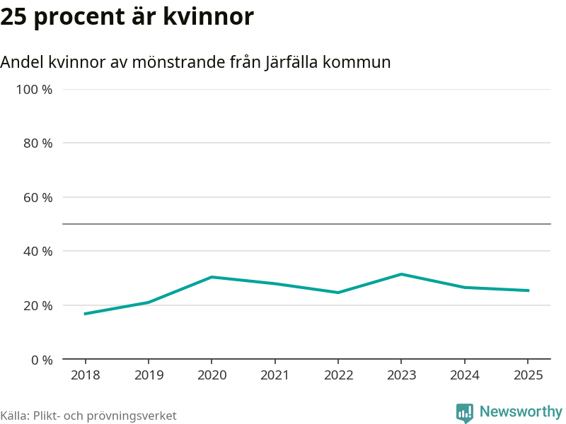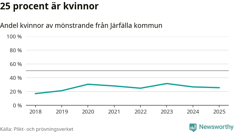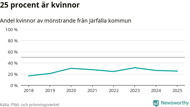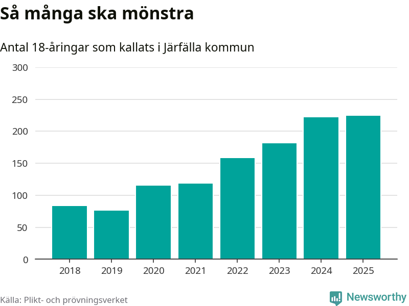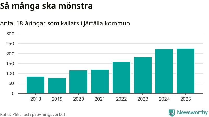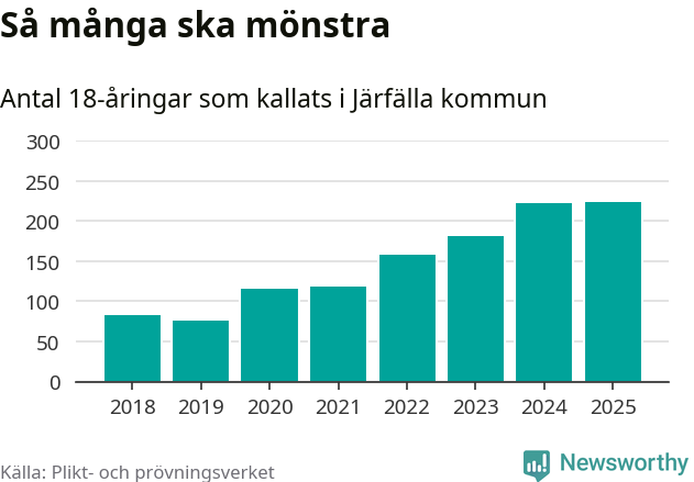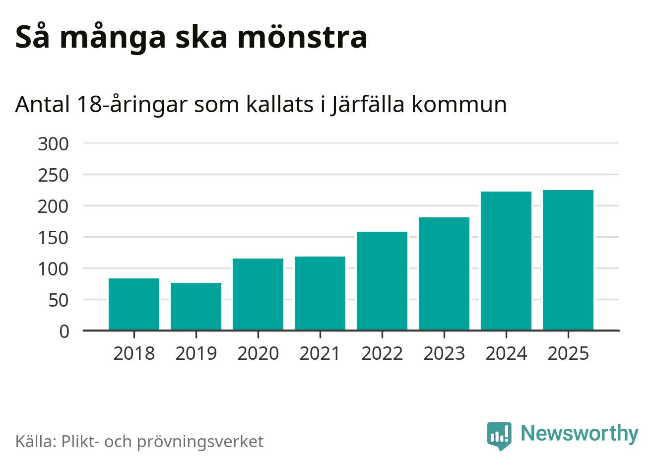 224 personer är det högsta antalet kallade i Järfälla sedan 2018, som är första året med statistik på kommunnivå (värnplikten återinfördes 2017), och två mönstrande fler än 2024. Totalt från Stockholms län kallas 6 801 personer i år.