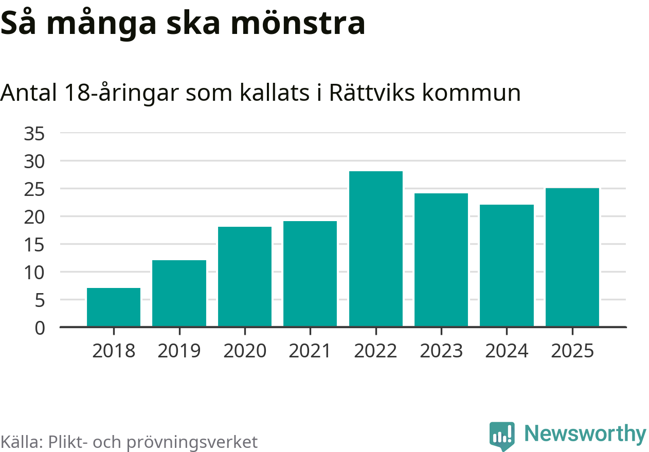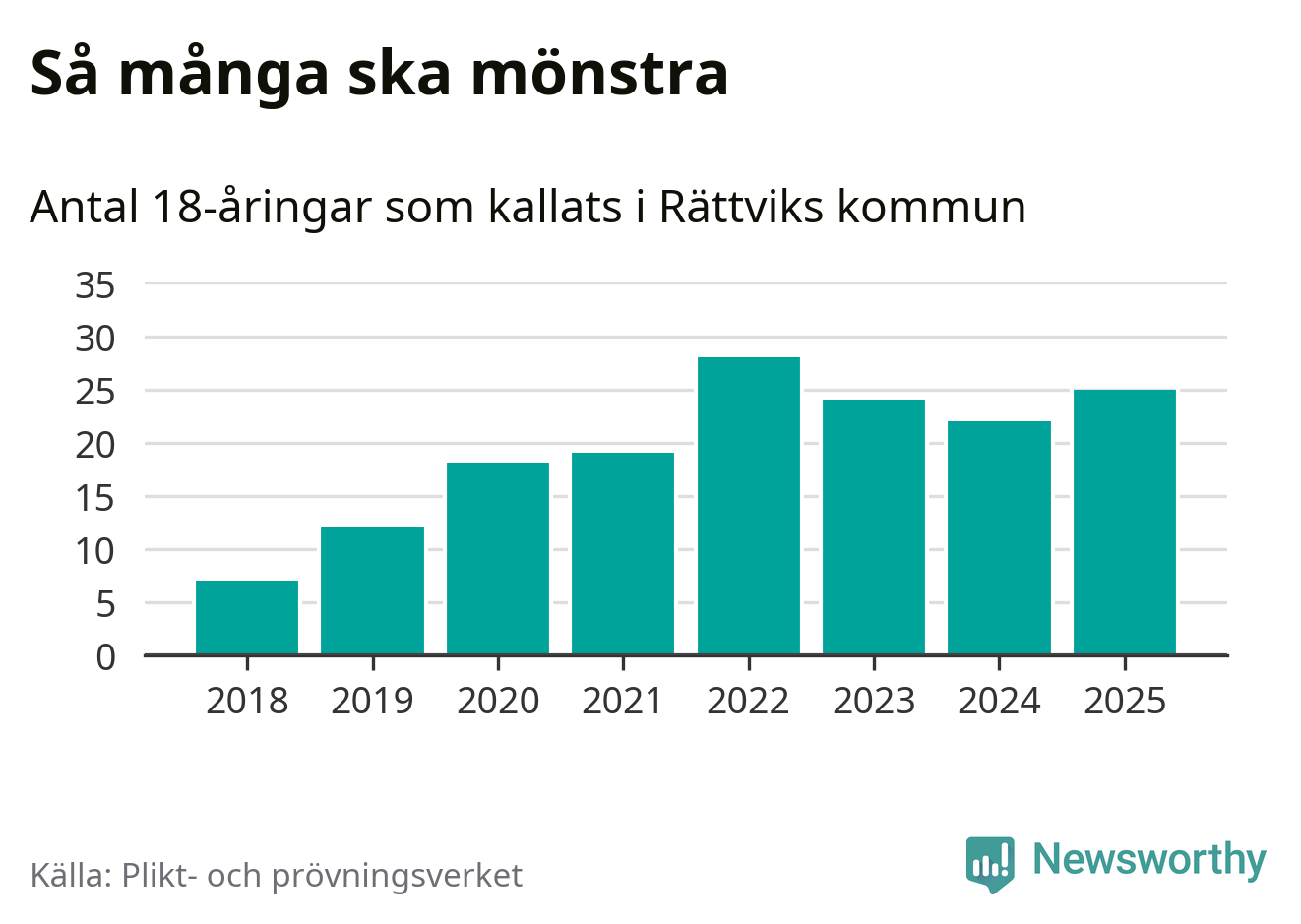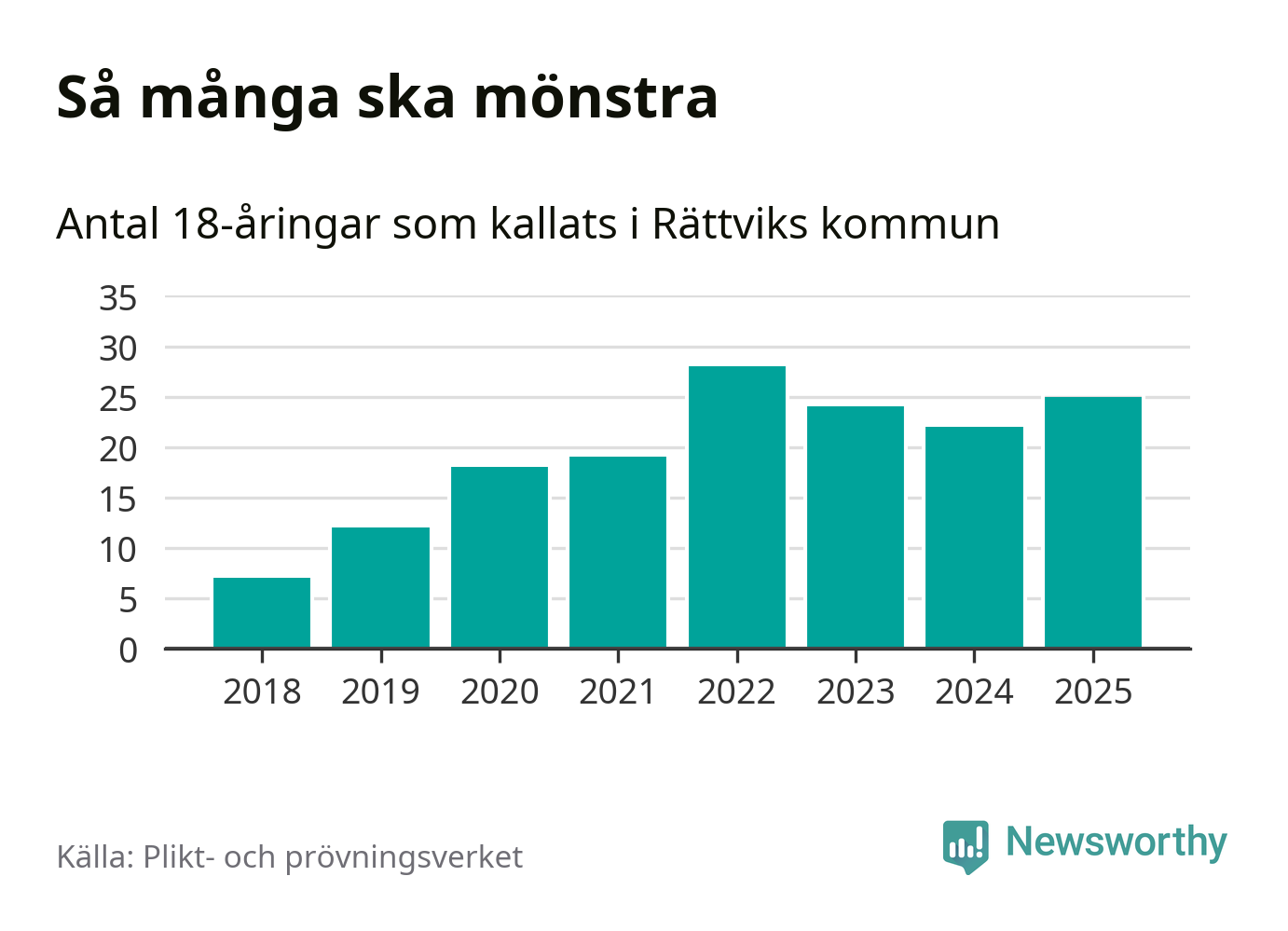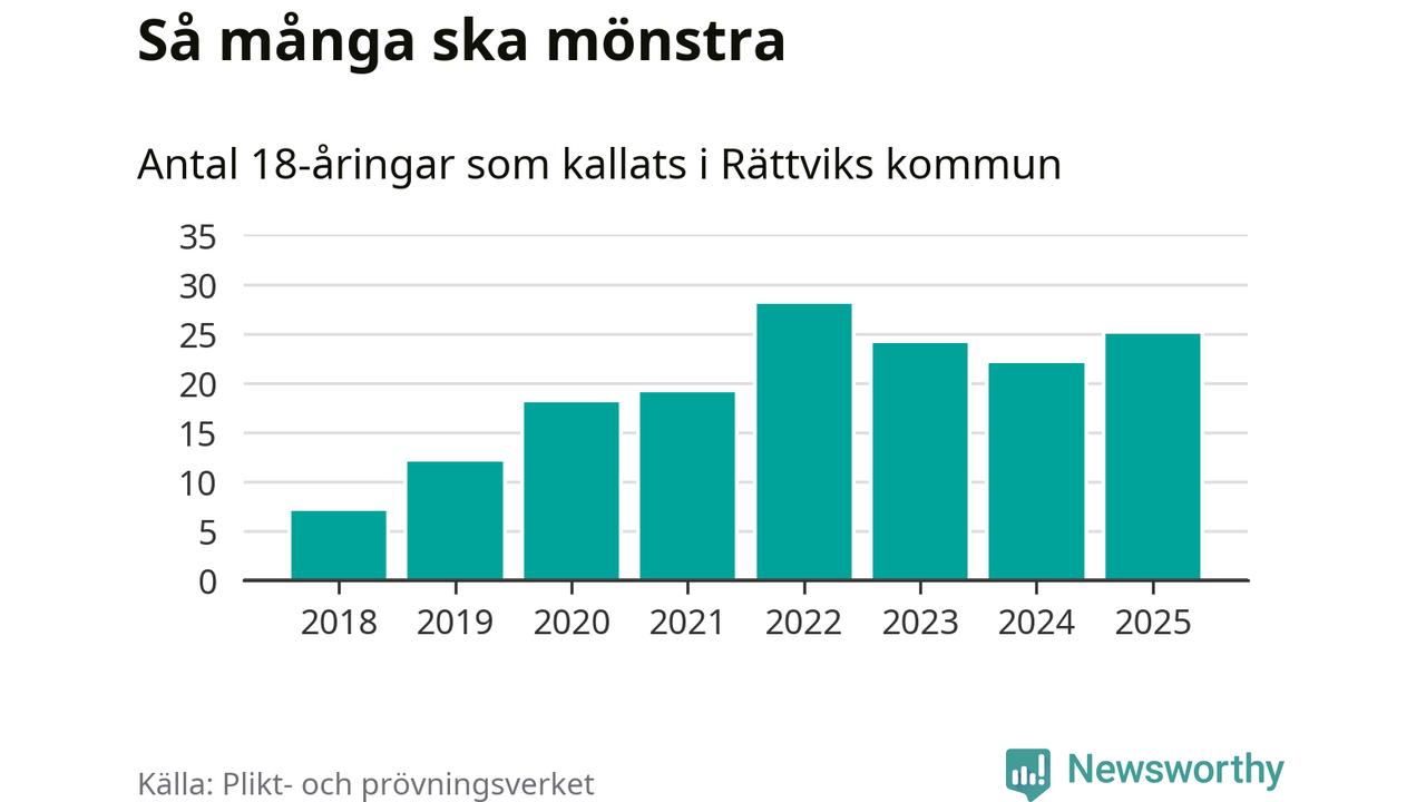 Nu kallas omkring 28 200 svenskar födda 2007 till mönstring. Och 25 av dem kommer från Rättvik, enligt ny statistik från Plikt- och prövningsverket. Det innebär att var femte invånare i åldersgruppen i kommunen kallas till mönstring. Det är ungefär lika stor andel som i Dalarna totalt. I riket som helhet kallas nästan var fjärde person i årskullen.