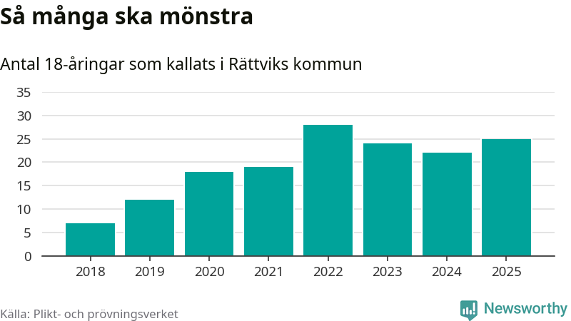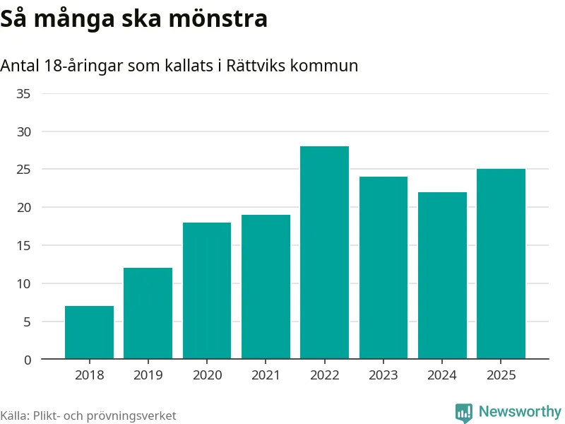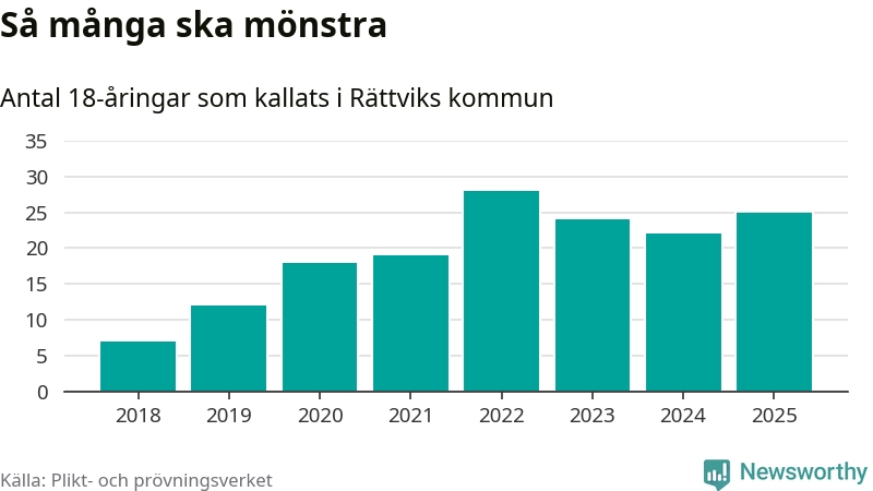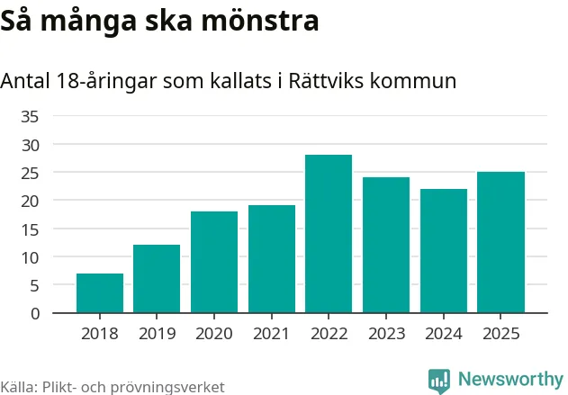 25 personer är tre fler än 2024, men sett som andel av respektive åldersgrupp är skillnaden liten. Som mest har 28 personer från en årskull kommunen mönstrat (2022). Totalt från Dalarnas län kallas 693 personer i år.