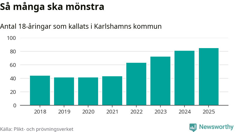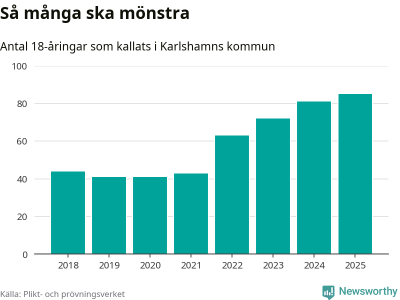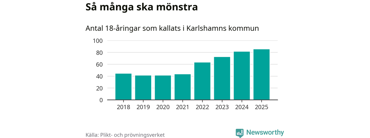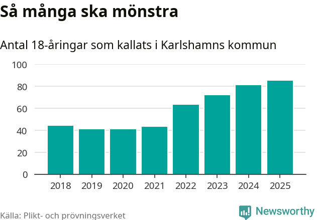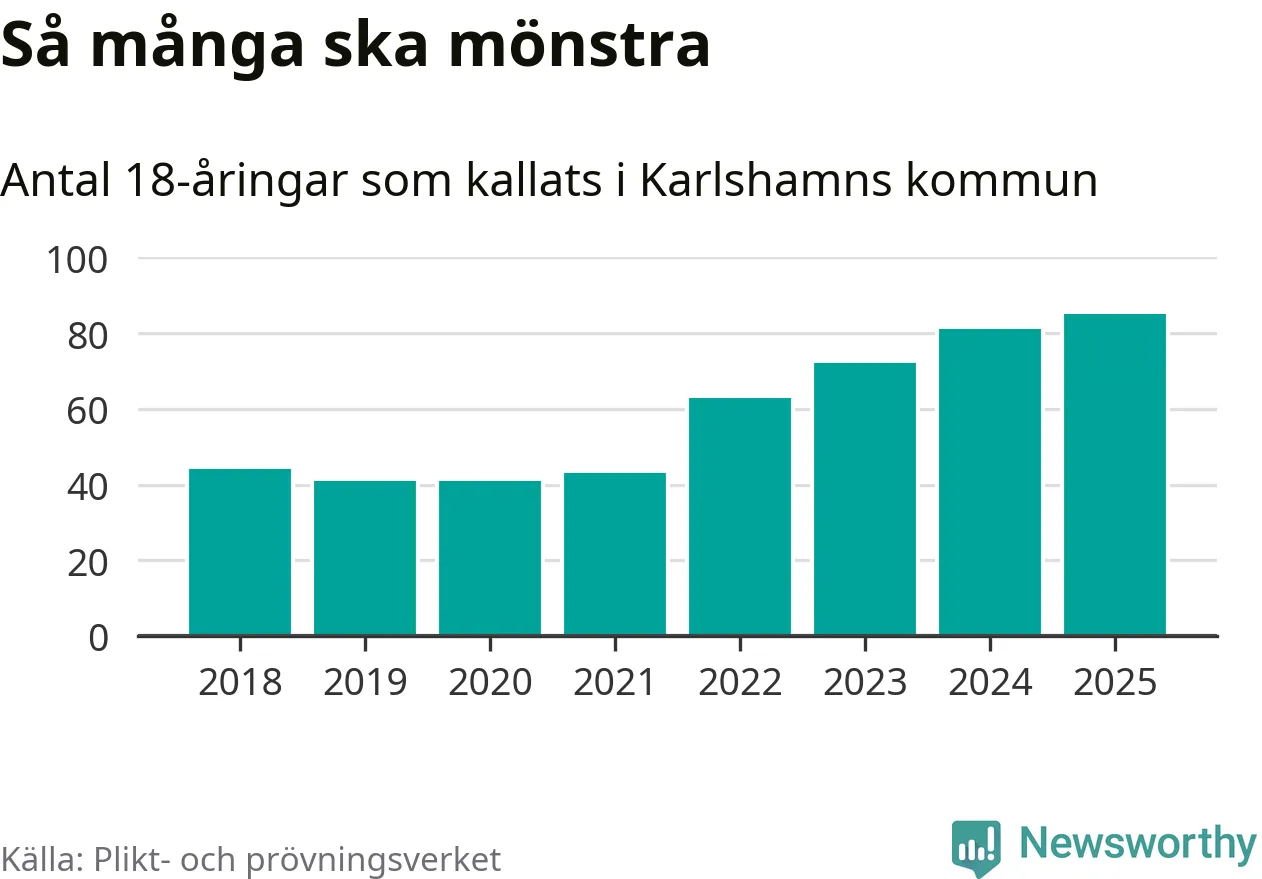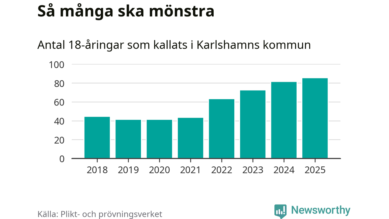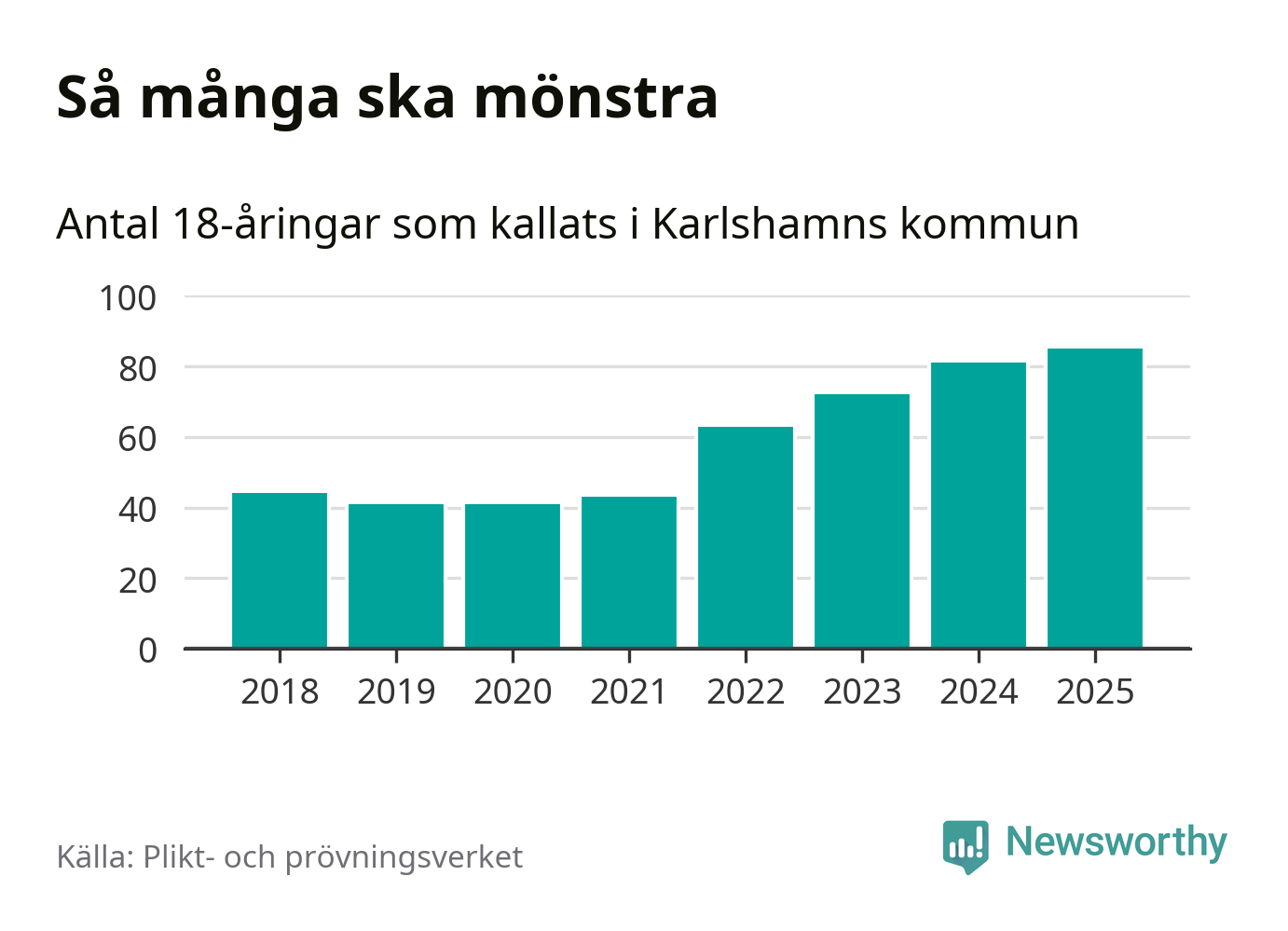 85 personer är det högsta antalet kallade i Karlshamn sedan 2018, som är första året med statistik på kommunnivå (värnplikten återinfördes 2017), och fyra mönstrande fler än 2024. Totalt från Blekinge län kallas 500 personer i år.