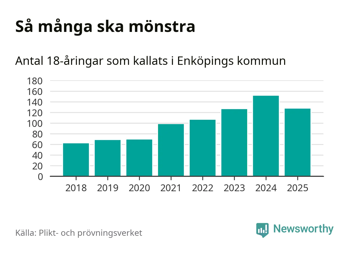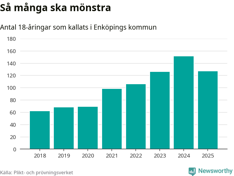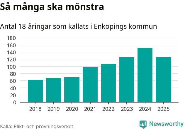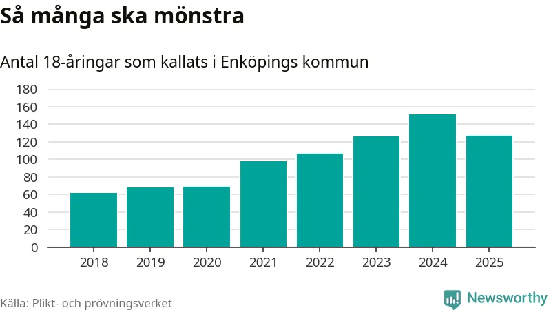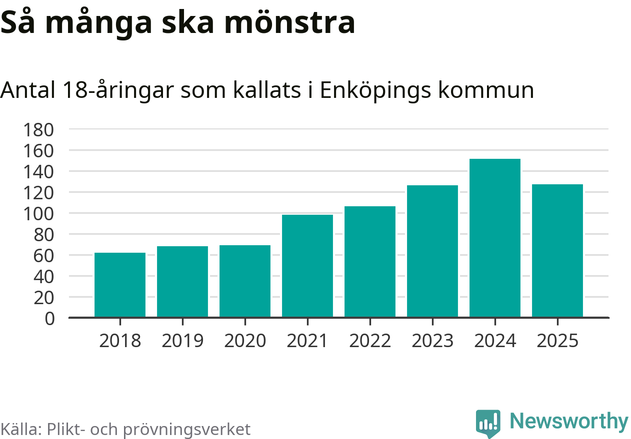 Nu kallas omkring 28 200 svenskar födda 2007 till mönstring. Och 127 av dem kommer från Enköping, enligt ny statistik från Plikt- och prövningsverket. Det innebär att nästan var fjärde invånare i åldersgruppen i kommunen kallas till mönstring. Det är ungefär lika stor andel som i Uppsala län totalt. Även i riket som helhet kallas nästan var fjärde person i årskullen.