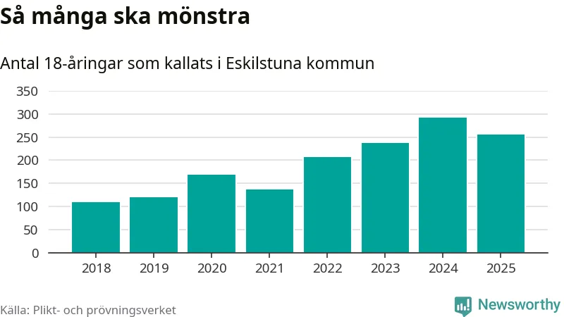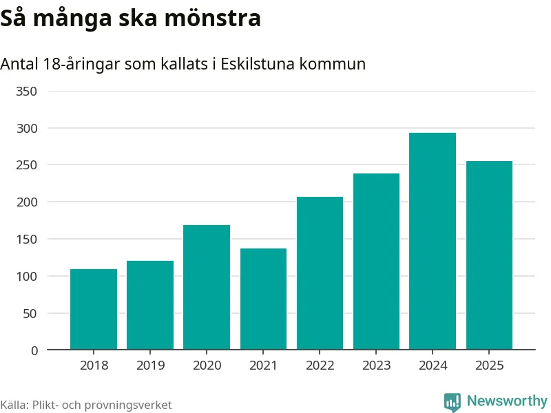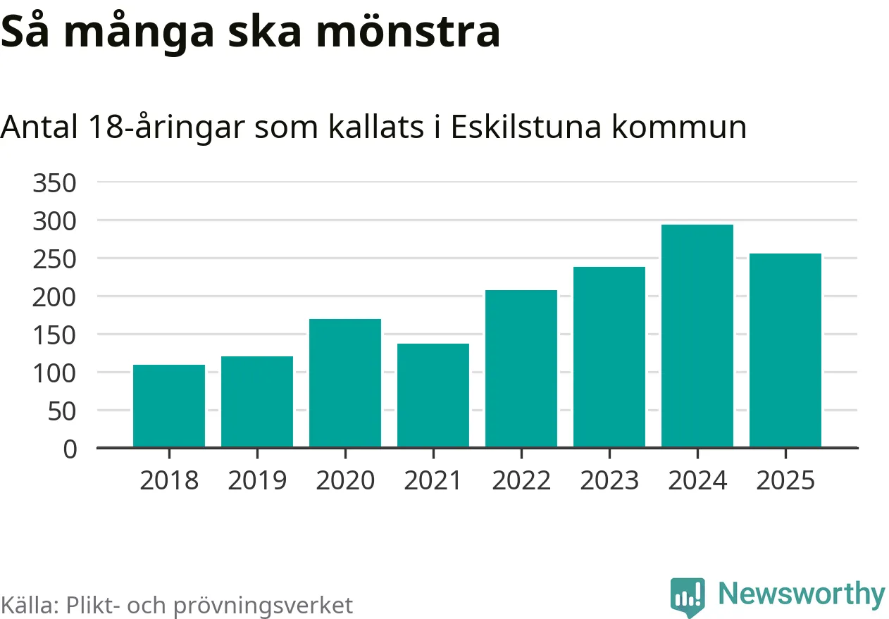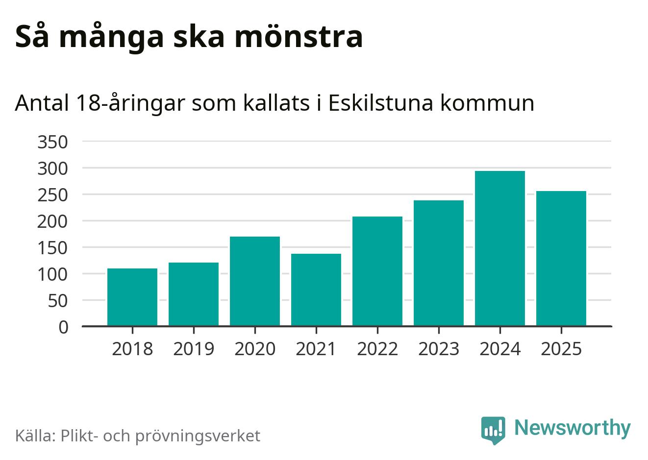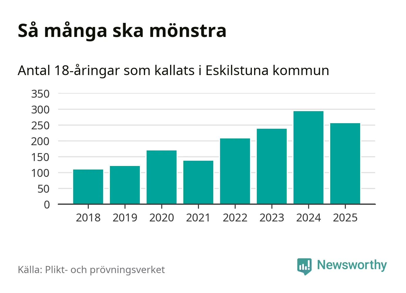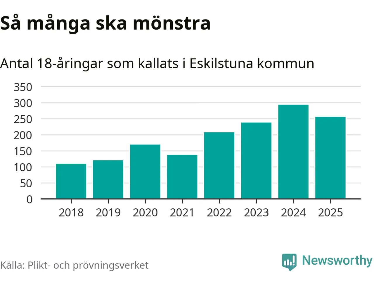 Nu kallas omkring 28 200 svenskar födda 2007 till mönstring. Och 255 av dem kommer från Eskilstuna, enligt ny statistik från Plikt- och prövningsverket. Det innebär att var femte invånare i åldersgruppen i kommunen kallas till mönstring. Det är en lägre andel än i Södermanland totalt. I riket som helhet kallas nästan var fjärde person i årskullen.