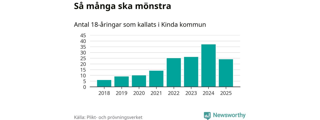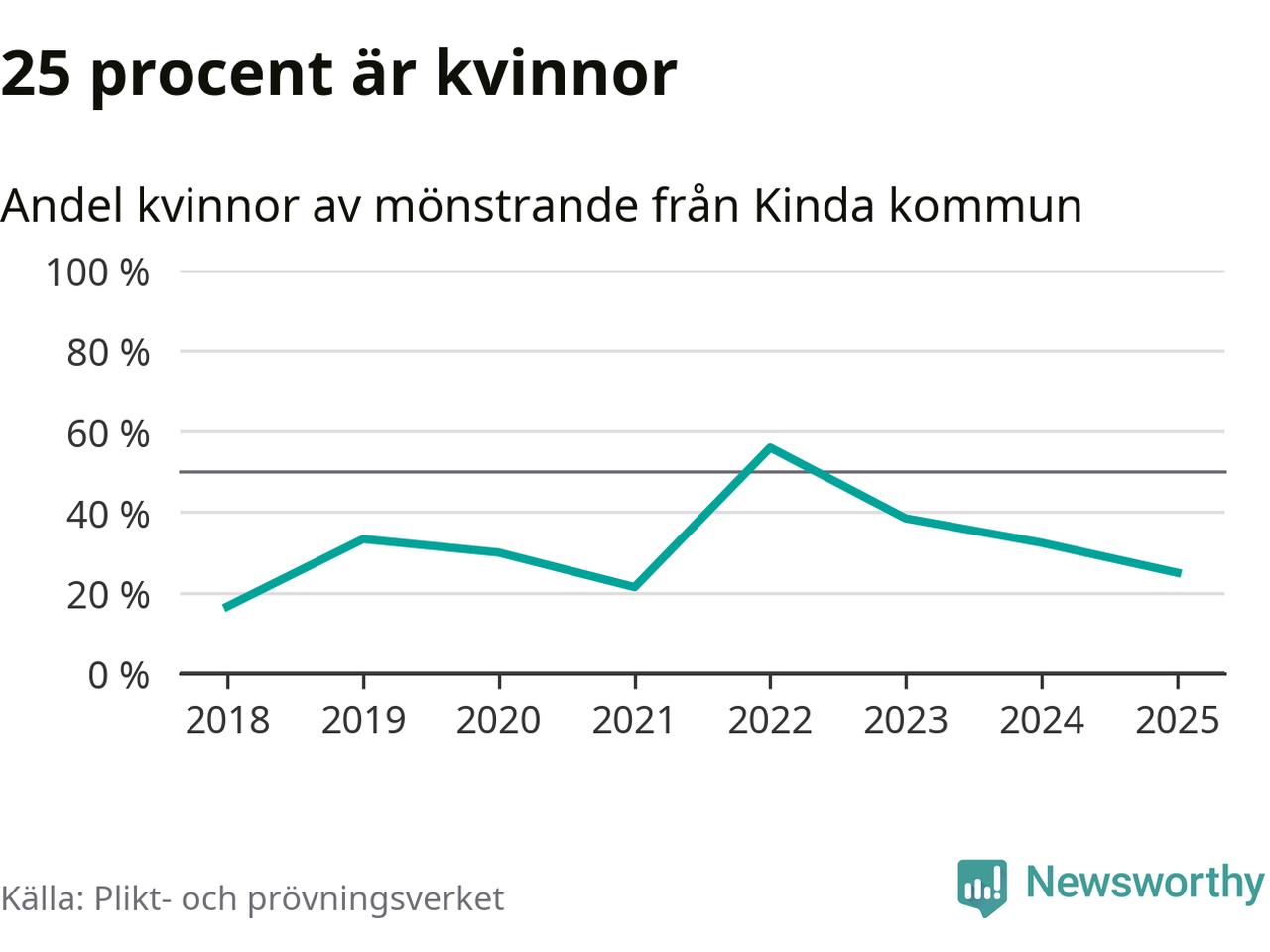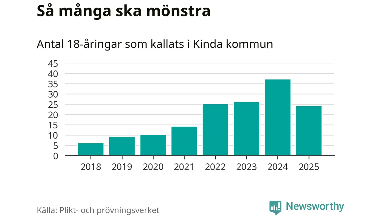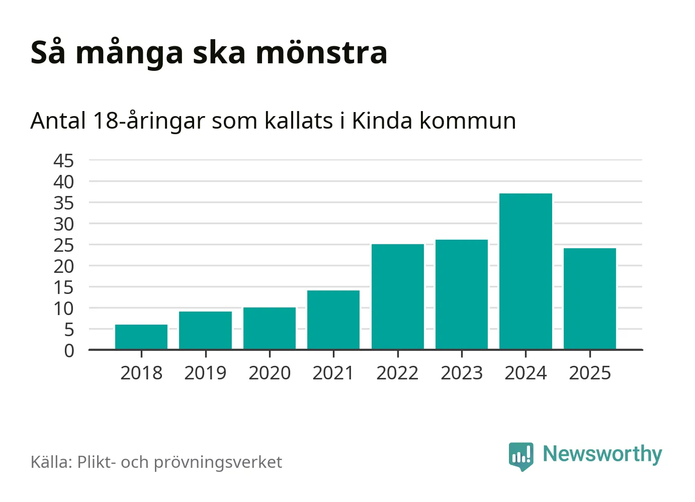 Av de som skrivits in till någon av Försvarmaktens grundutbildningar det senaste året, från juni 2024 till mars i år, kommer åtta (sju män och en kvinna) från Kinda. Samtliga antogs efter att ha kallats till mönstring.