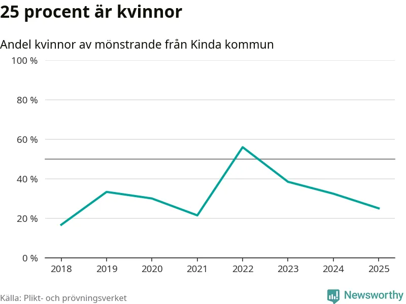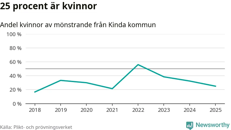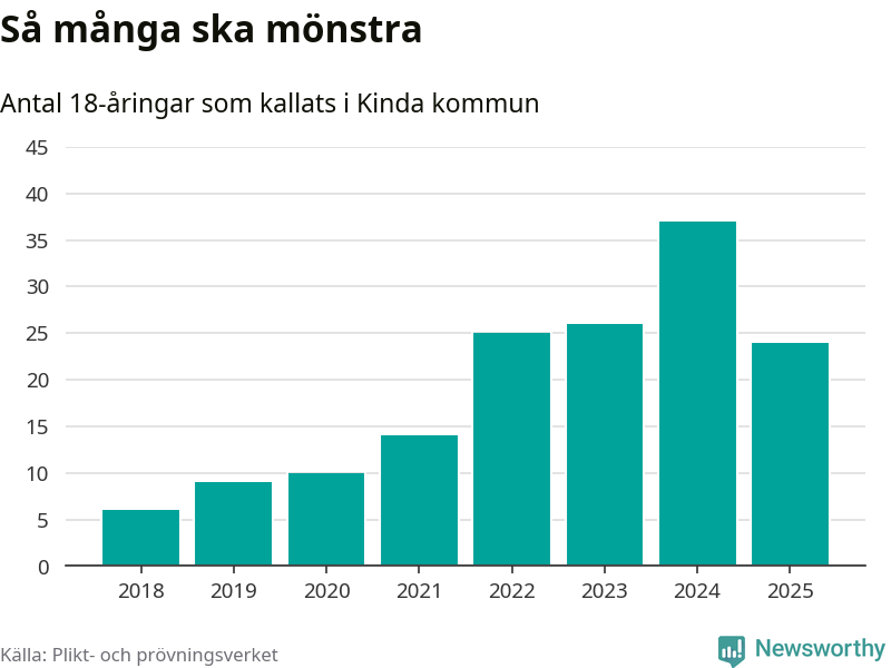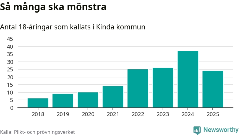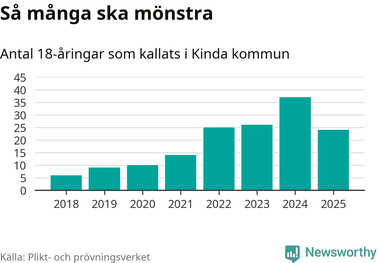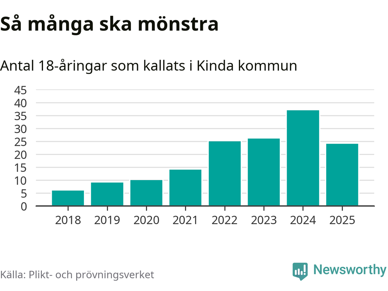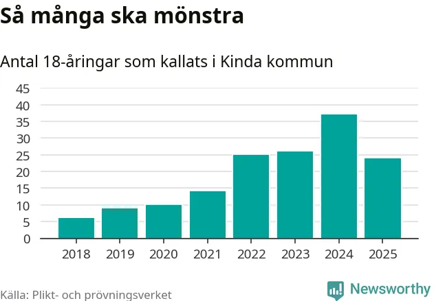 Nu kallas omkring 28 200 svenskar födda 2007 till mönstring. Och 24 av dem kommer från Kinda, enligt ny statistik från Plikt- och prövningsverket. Det innebär att var femte invånare i åldersgruppen i kommunen kallas till mönstring. Det är ungefär lika stor andel som i Östergötland totalt. I riket som helhet kallas nästan var fjärde person i årskullen.