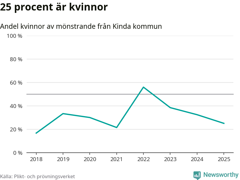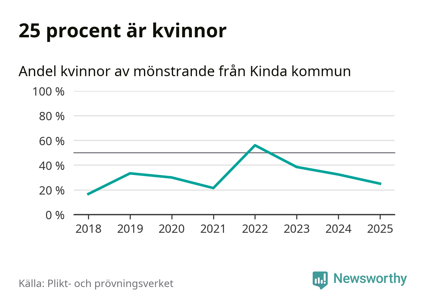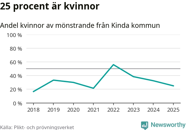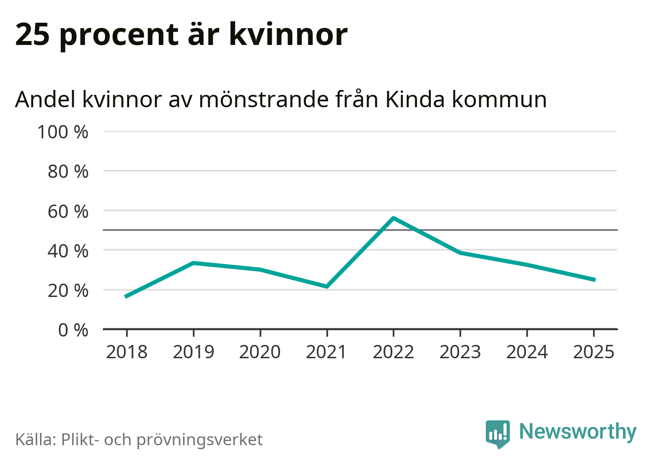 Sex av de som kallats till mönstring från Kinda är kvinnor, vilket motsvarar 25 procent av de mönstrande. Som mest har 14 kvinnor kallats från kommunen (2022). I riket som helhet är 28 procent av de mönstrande tjejer.