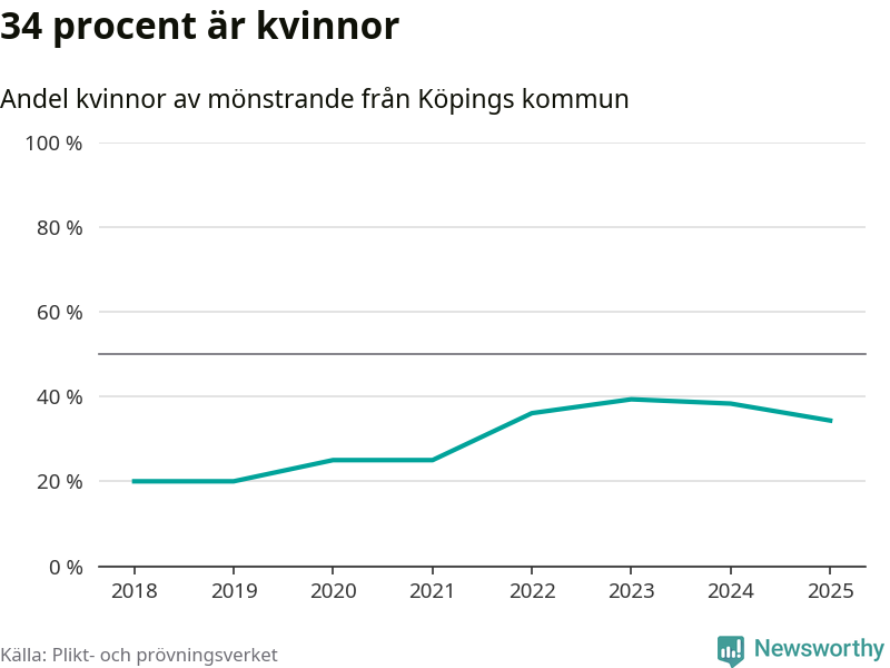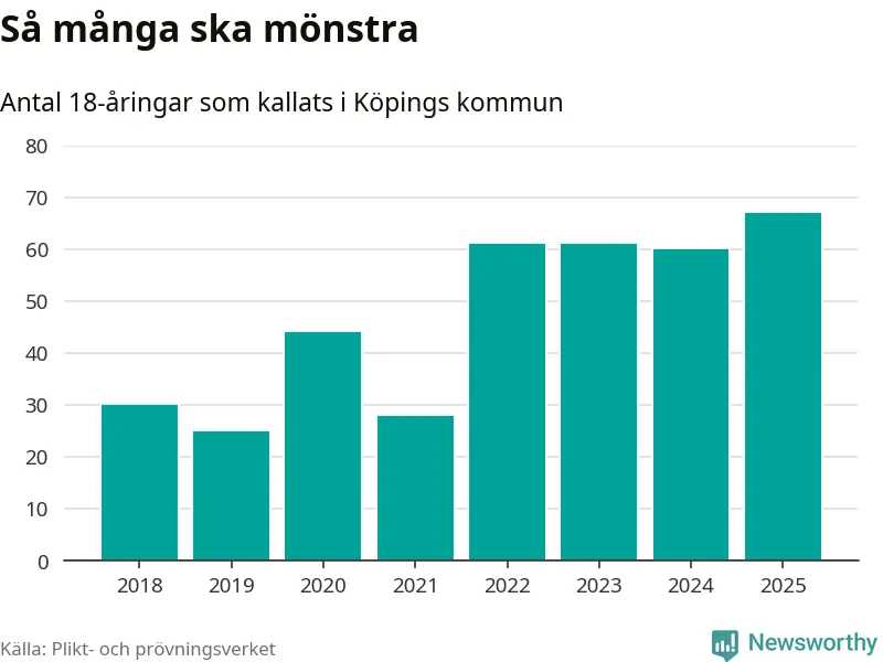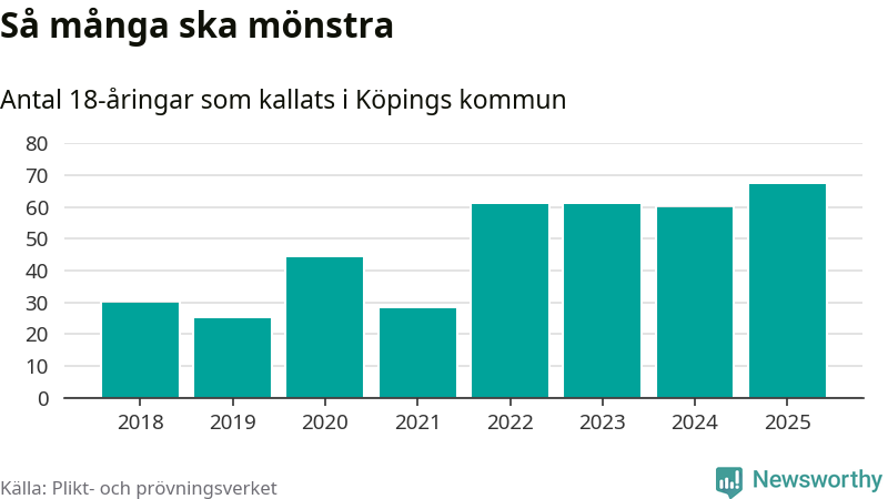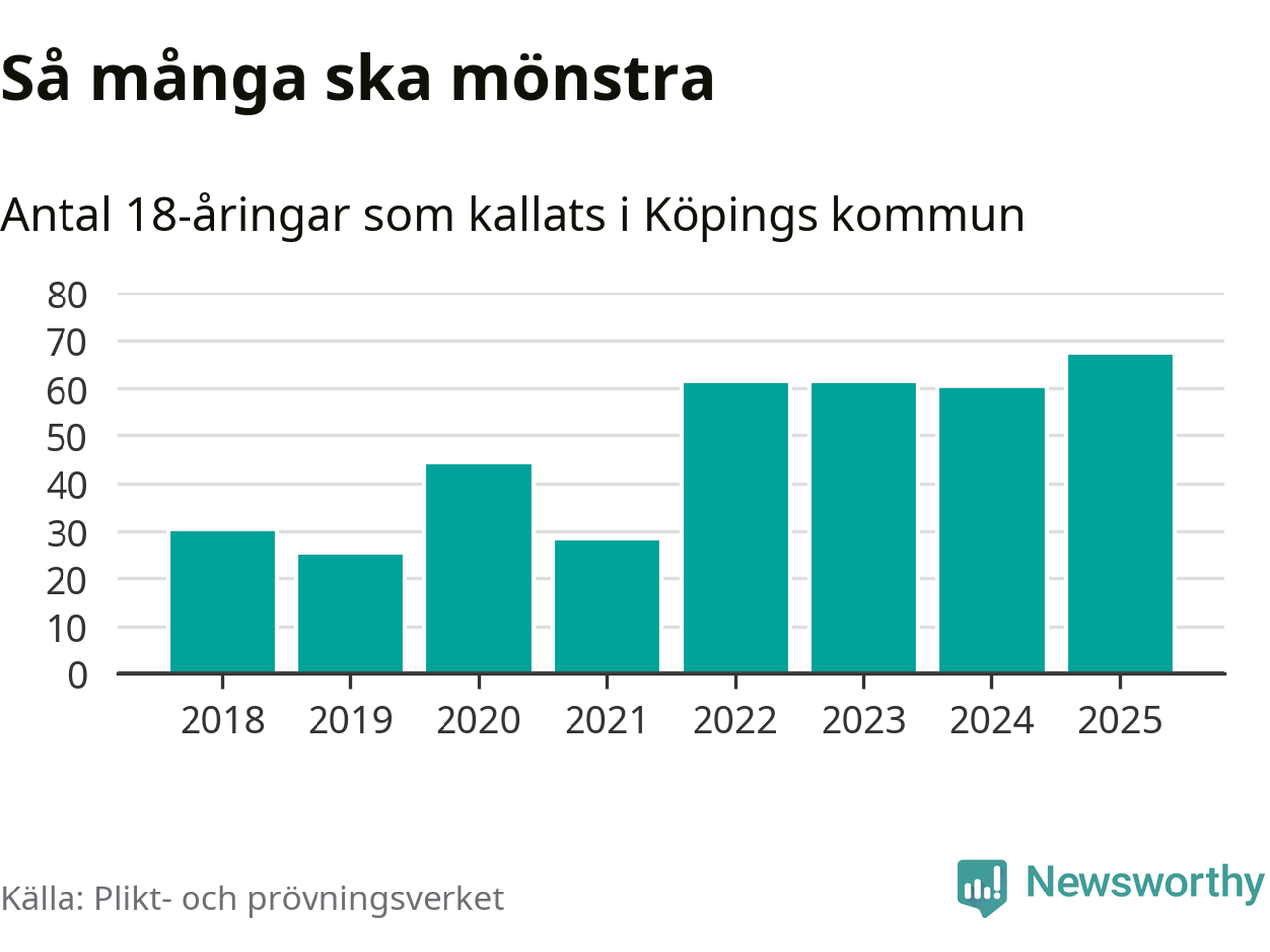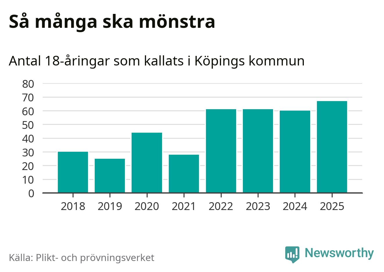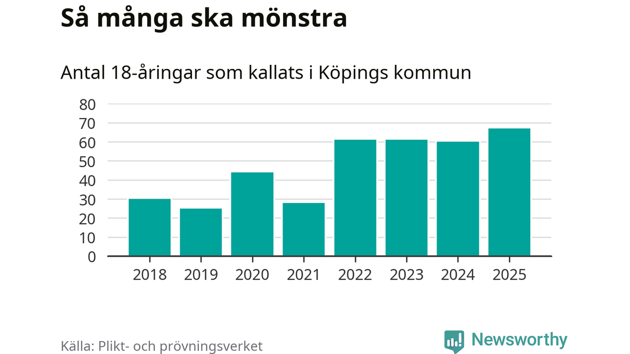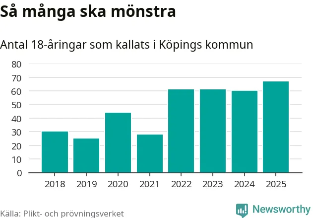 67 personer är det högsta antalet kallade i Köping sedan 2018, som är första året med statistik på kommunnivå (värnplikten återinfördes 2017), och sju mönstrande fler än 2024. Totalt från Västmanlands län kallas 729 personer i år.