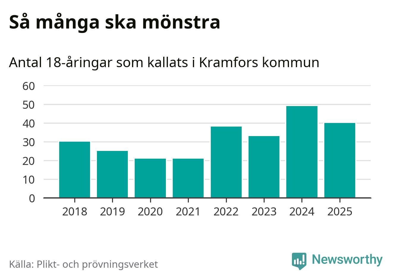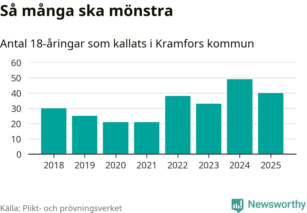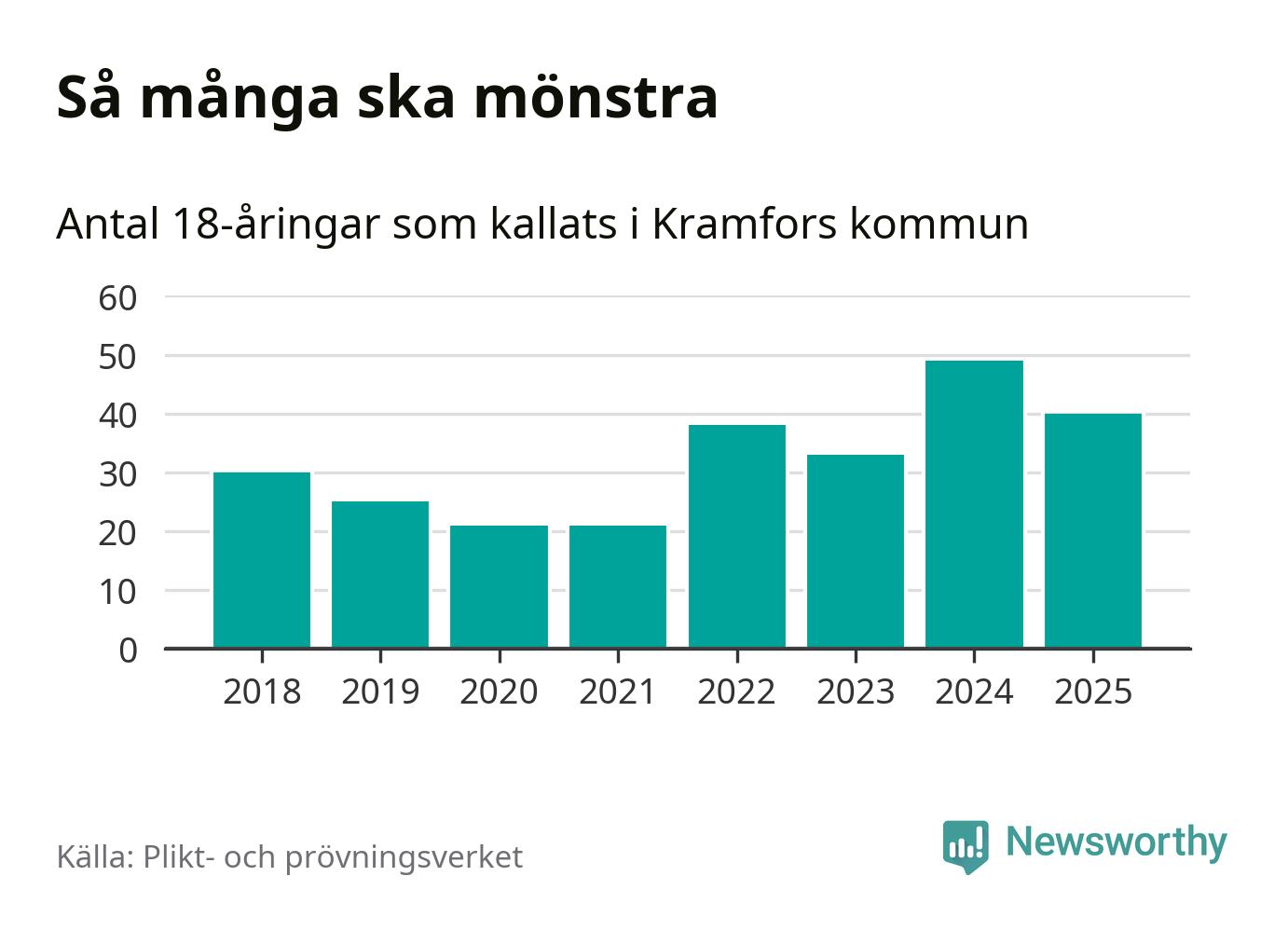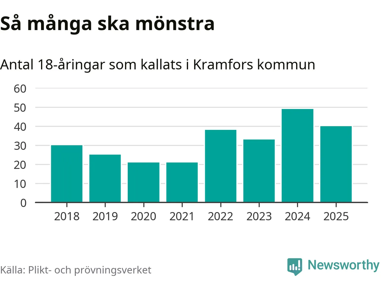 Nu kallas omkring 28 200 svenskar födda 2007 till mönstring. Och 40 av dem kommer från Kramfors, enligt ny statistik från Plikt- och prövningsverket. Det innebär att var femte invånare i åldersgruppen i kommunen kallas till mönstring. Det är en lägre andel än i Västernorrland totalt. I riket som helhet kallas nästan var fjärde person i årskullen.