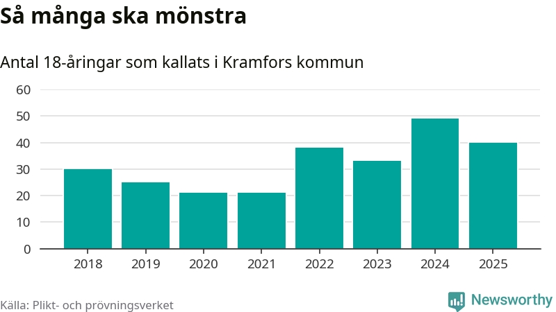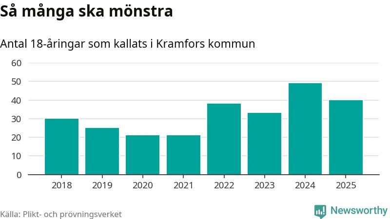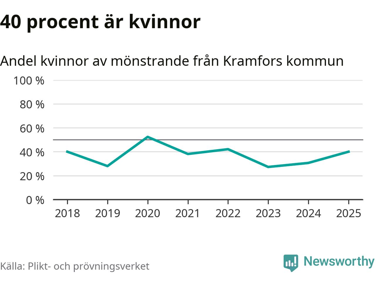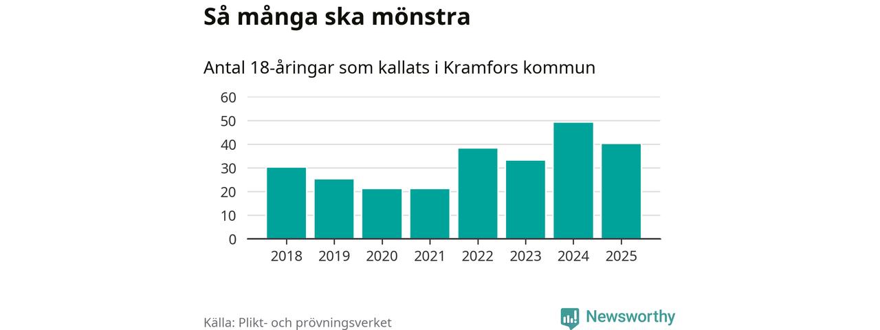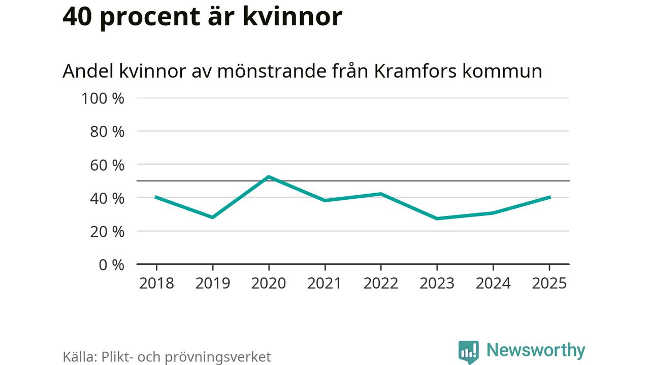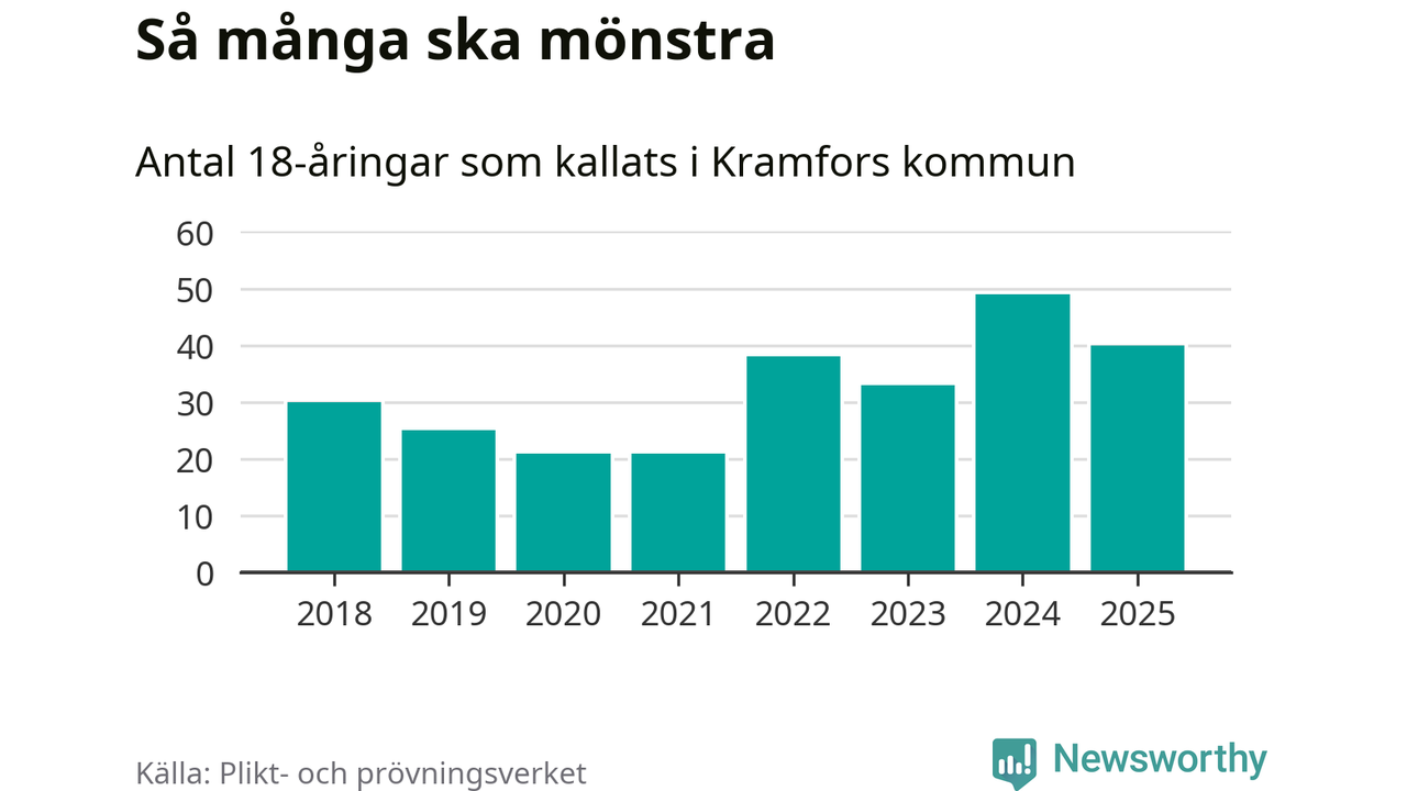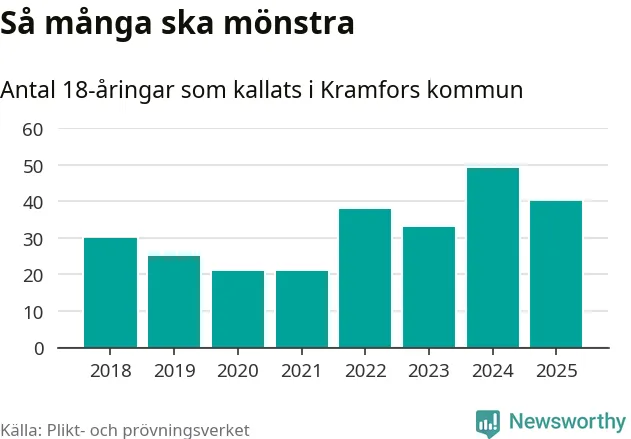 Nu kallas omkring 28 200 svenskar födda 2007 till mönstring. Och 40 av dem kommer från Kramfors, enligt ny statistik från Plikt- och prövningsverket. Det innebär att var femte invånare i åldersgruppen i kommunen kallas till mönstring. Det är en lägre andel än i Västernorrland totalt. I riket som helhet kallas nästan var fjärde person i årskullen.