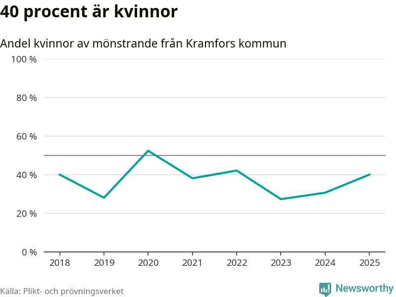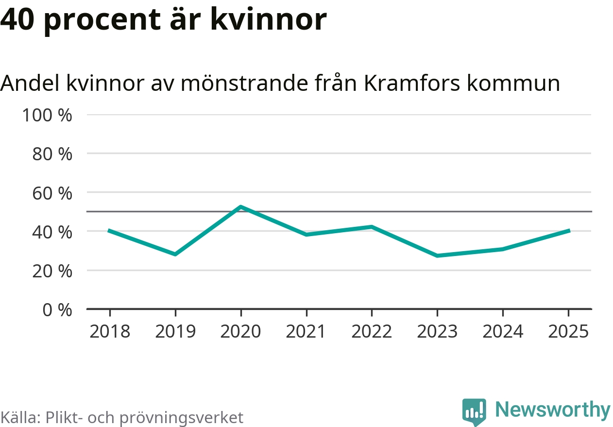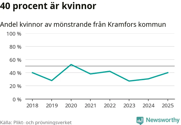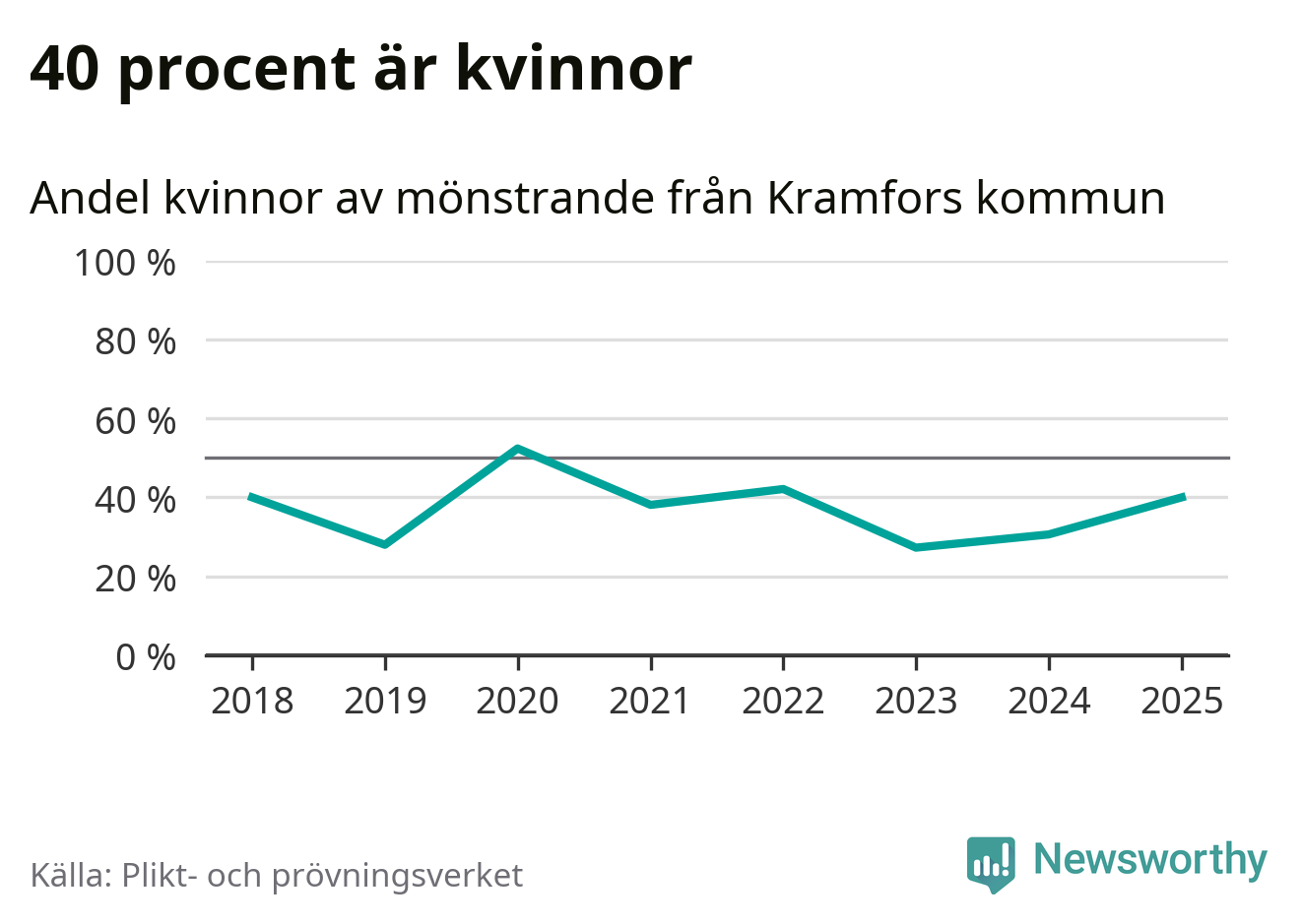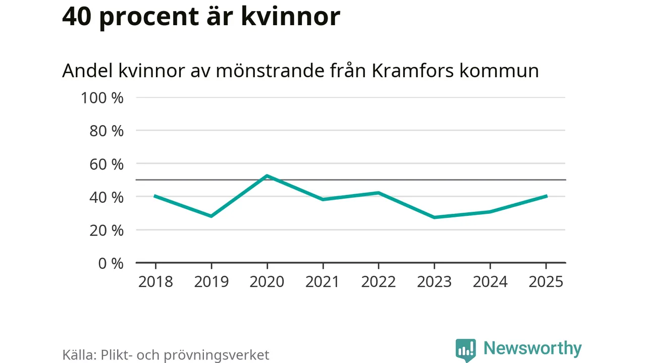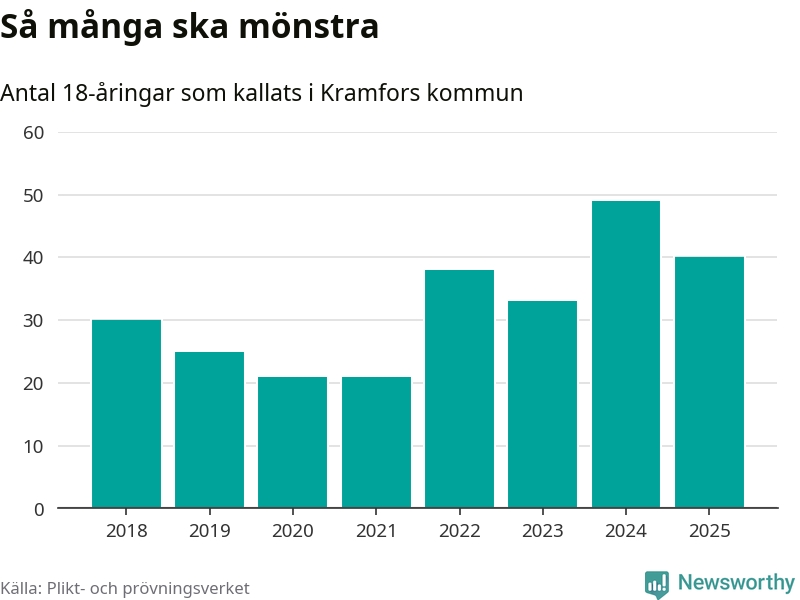 Nu kallas omkring 28 200 svenskar födda 2007 till mönstring. Och 40 av dem kommer från Kramfors, enligt ny statistik från Plikt- och prövningsverket. Det innebär att var femte invånare i åldersgruppen i kommunen kallas till mönstring. Det är en lägre andel än i Västernorrland totalt. I riket som helhet kallas nästan var fjärde person i årskullen.