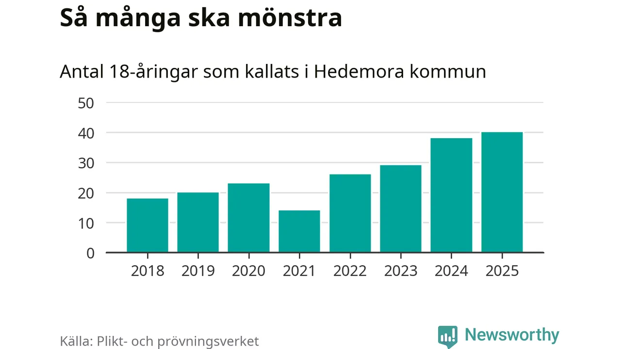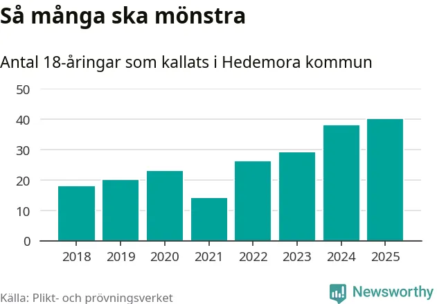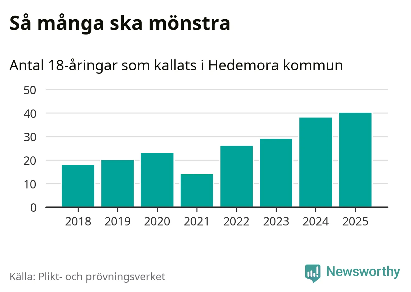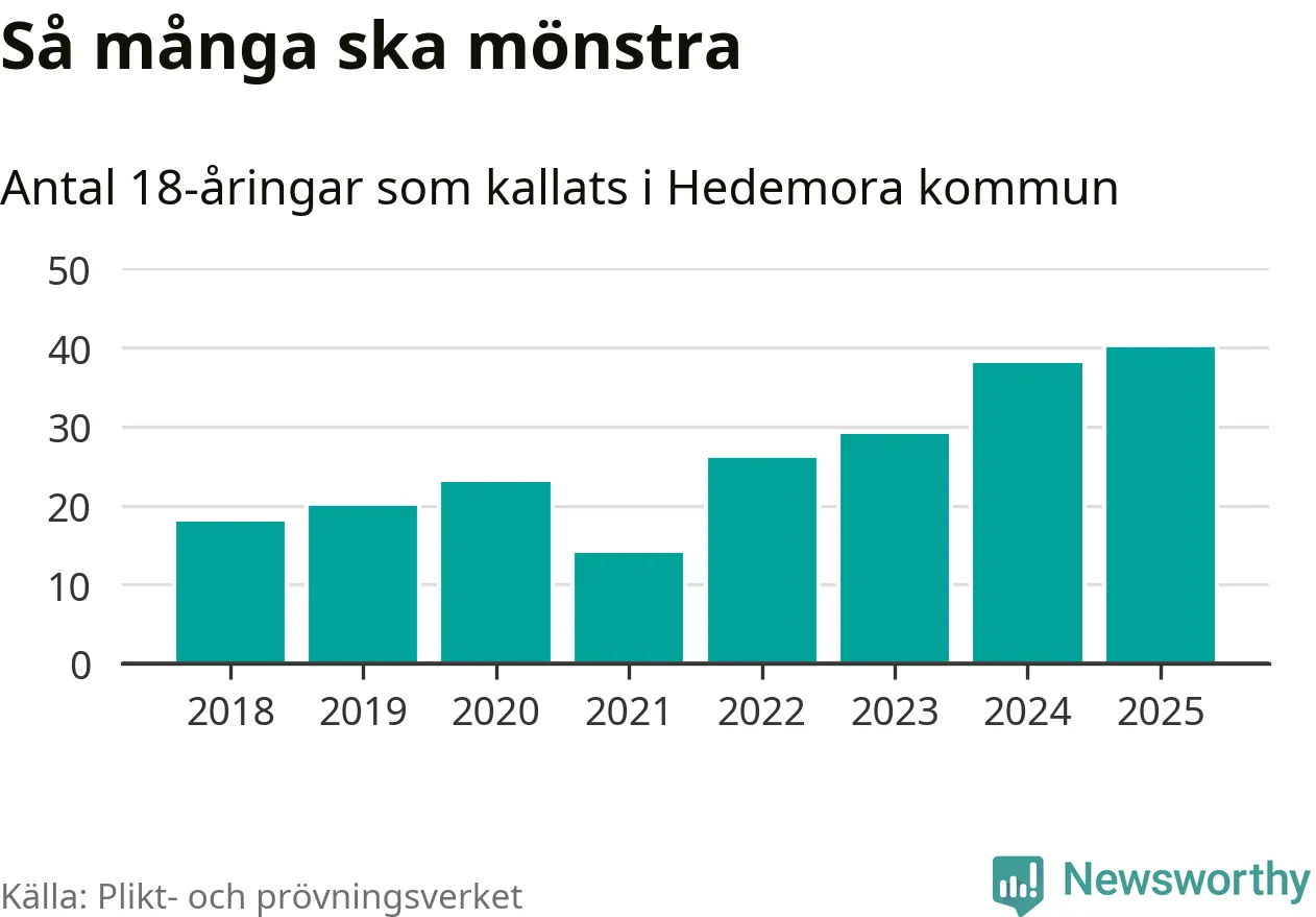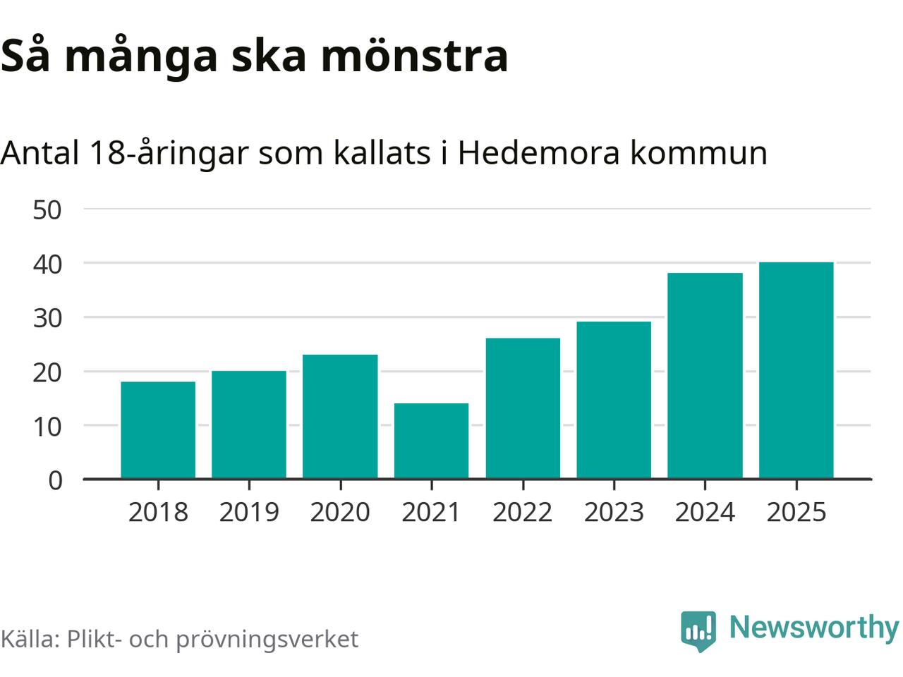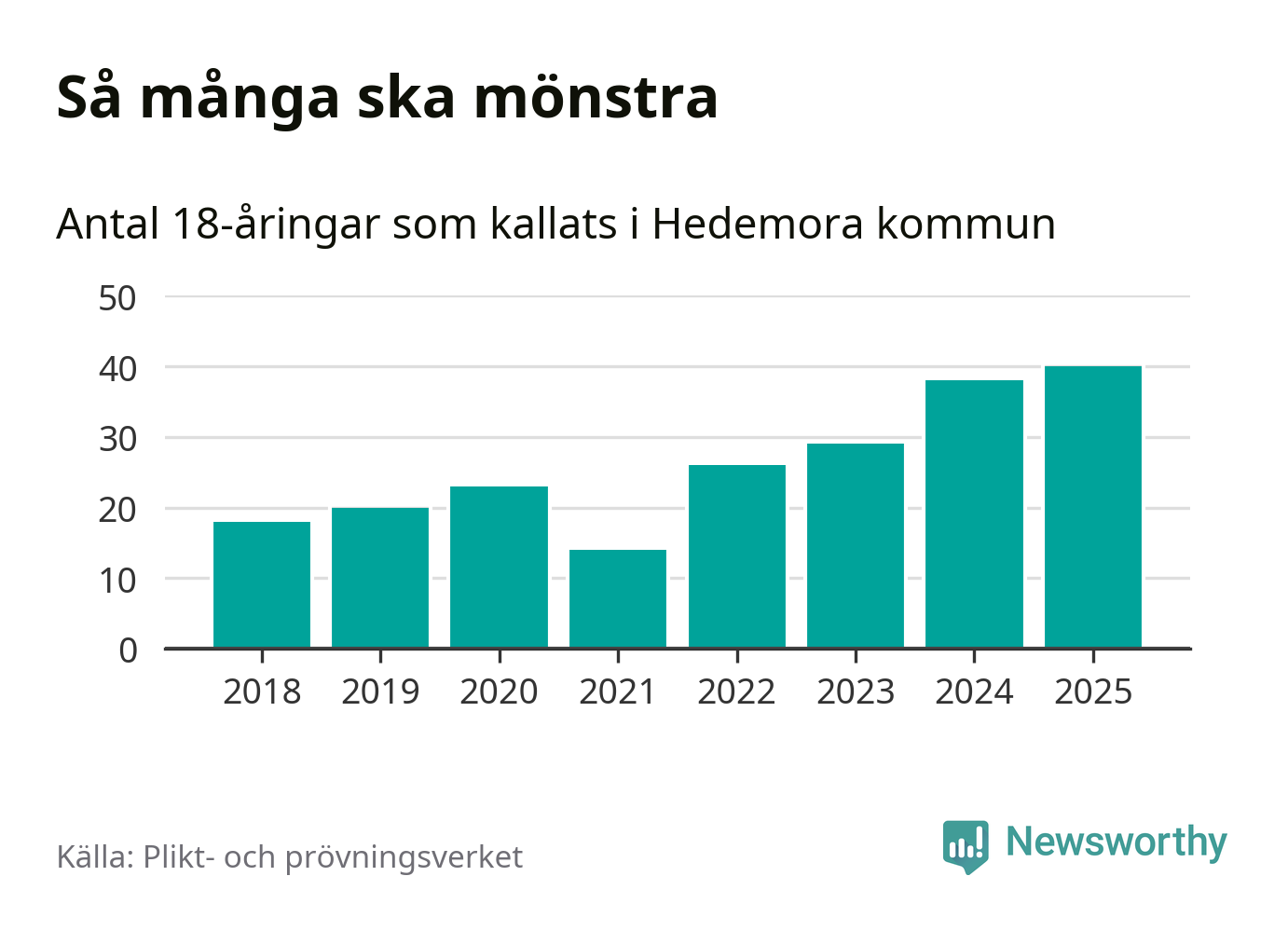 40 personer är det högsta antalet kallade i Hedemora sedan 2018, som är första året med statistik på kommunnivå (värnplikten återinfördes 2017), och två mönstrande fler än 2024. Totalt från Dalarnas län kallas 693 personer i år.